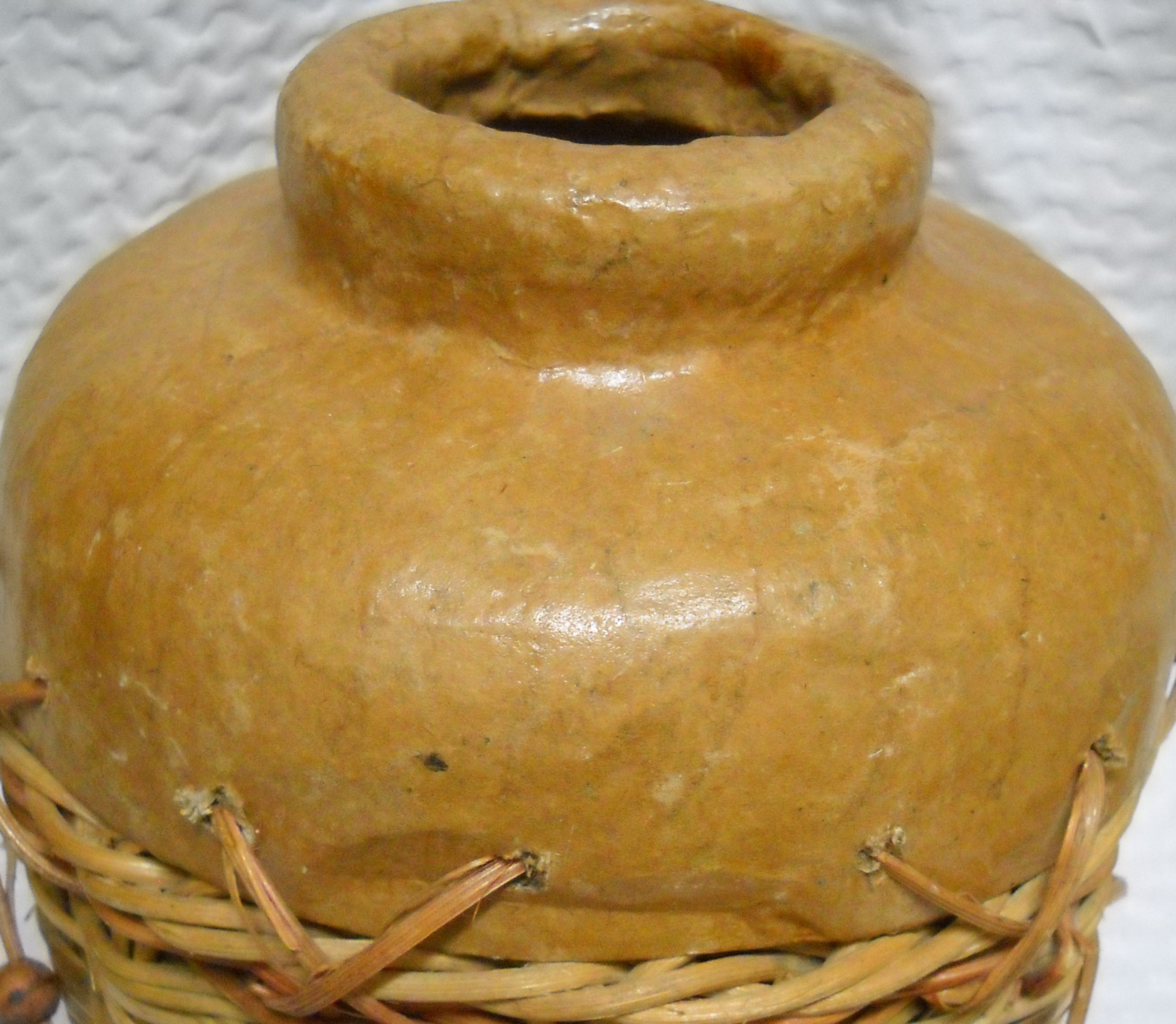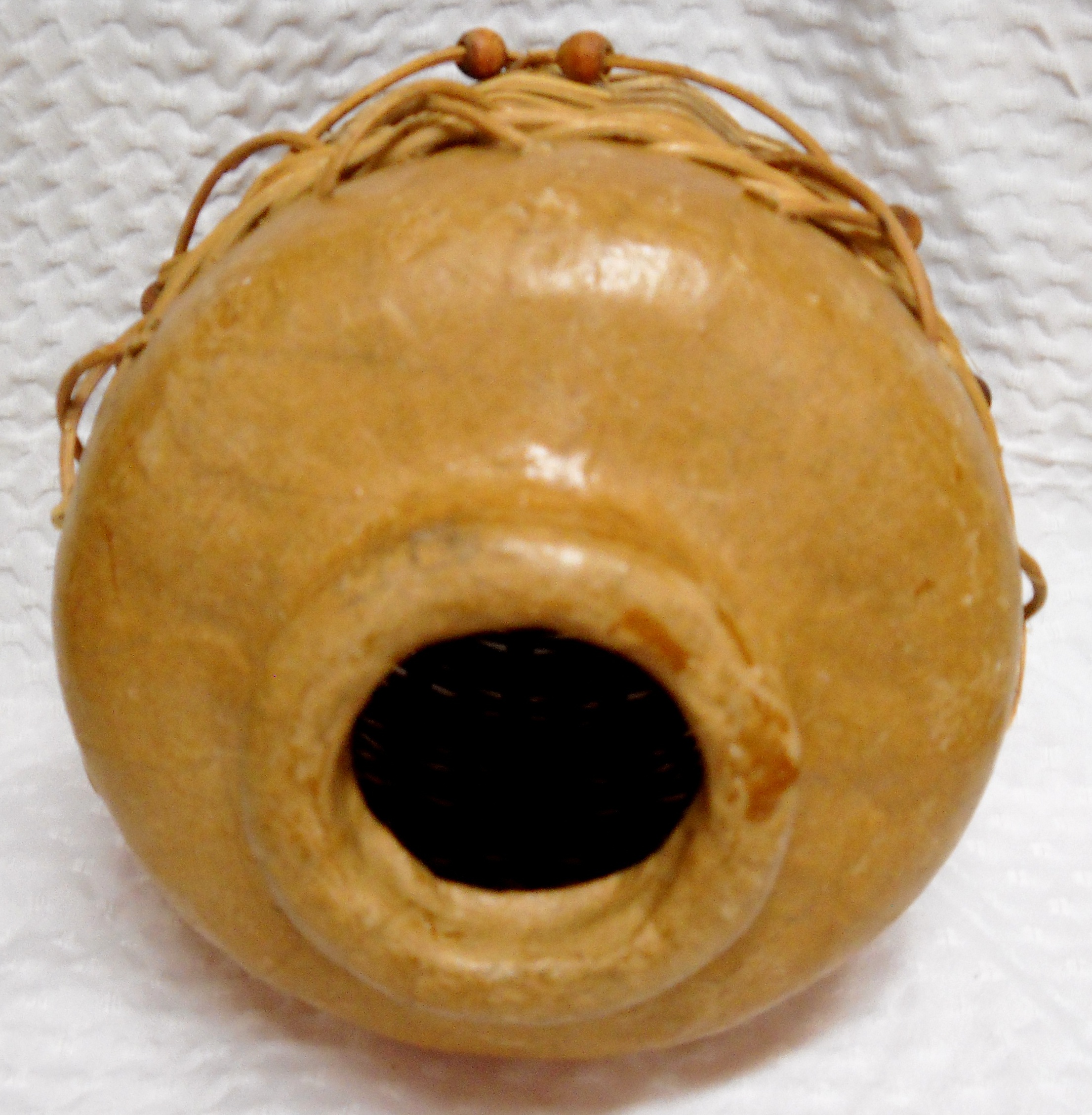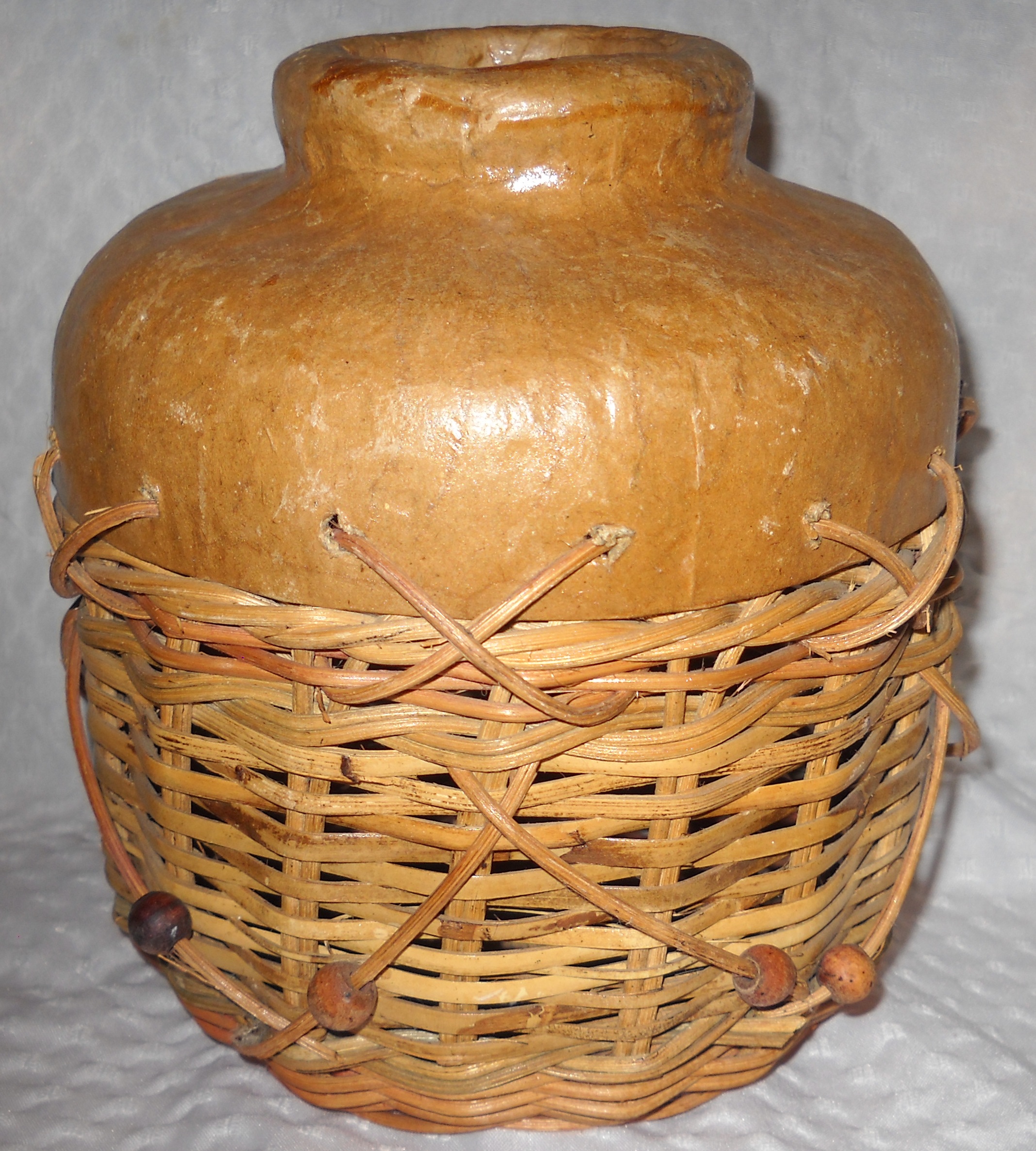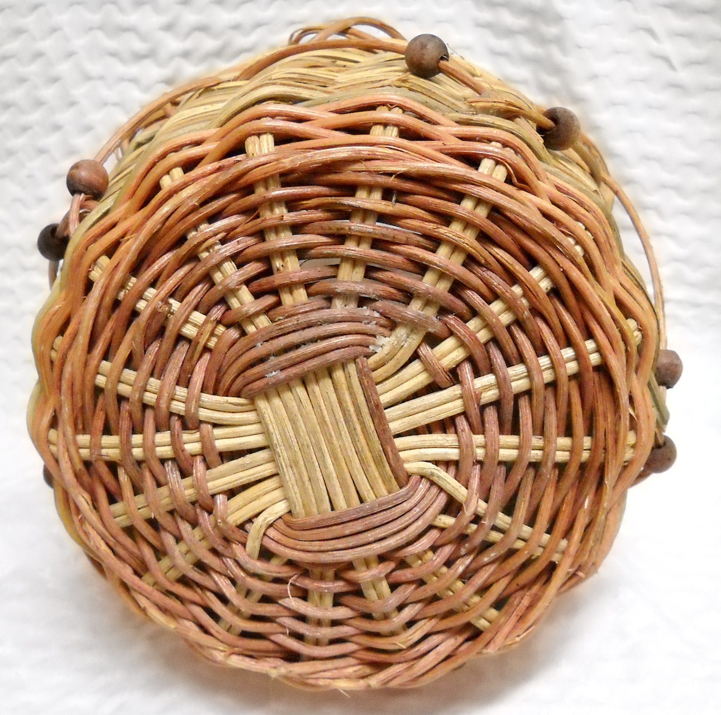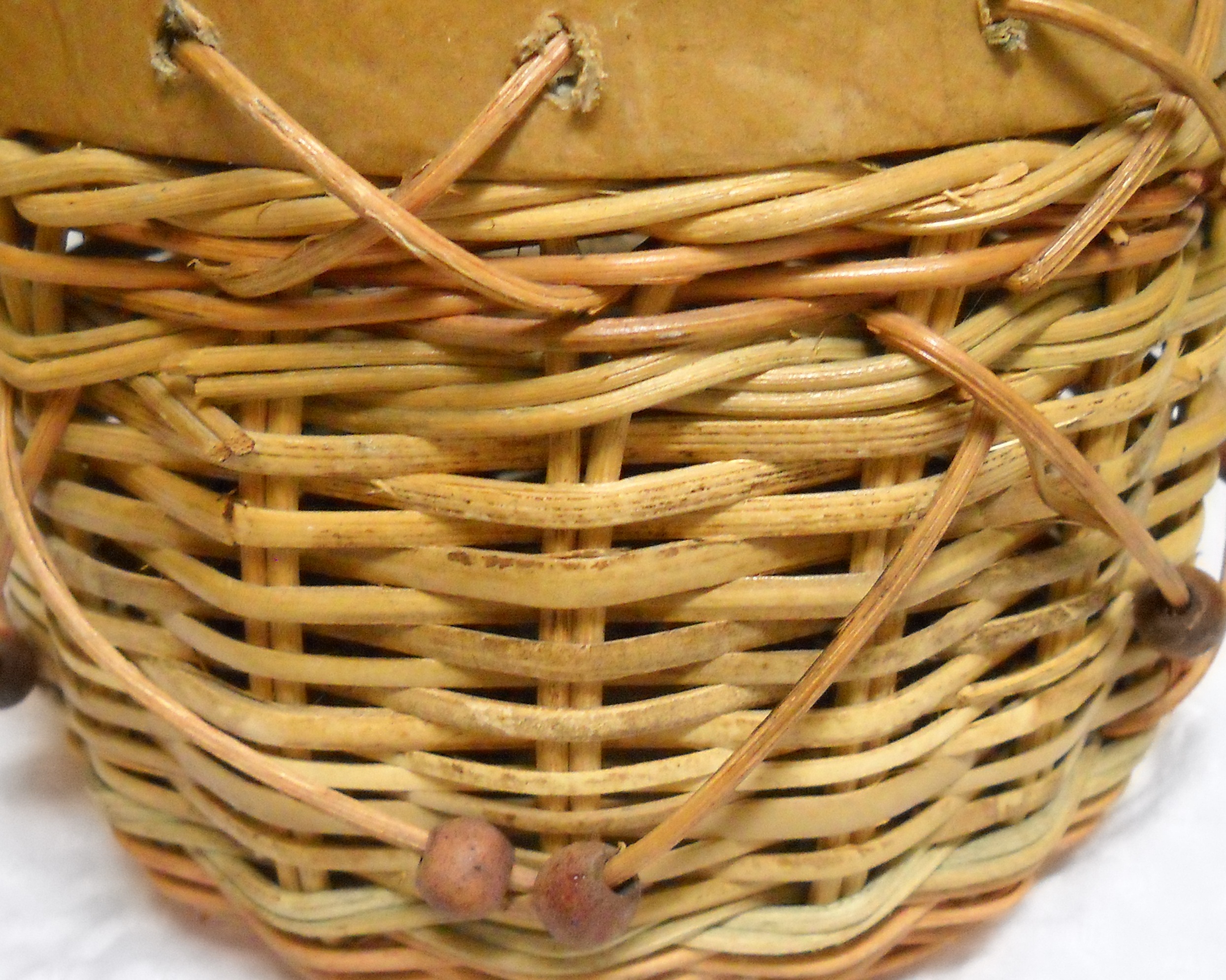 Wood beaded Primitive basket with smooth form fitted top strapped to bottom of basket