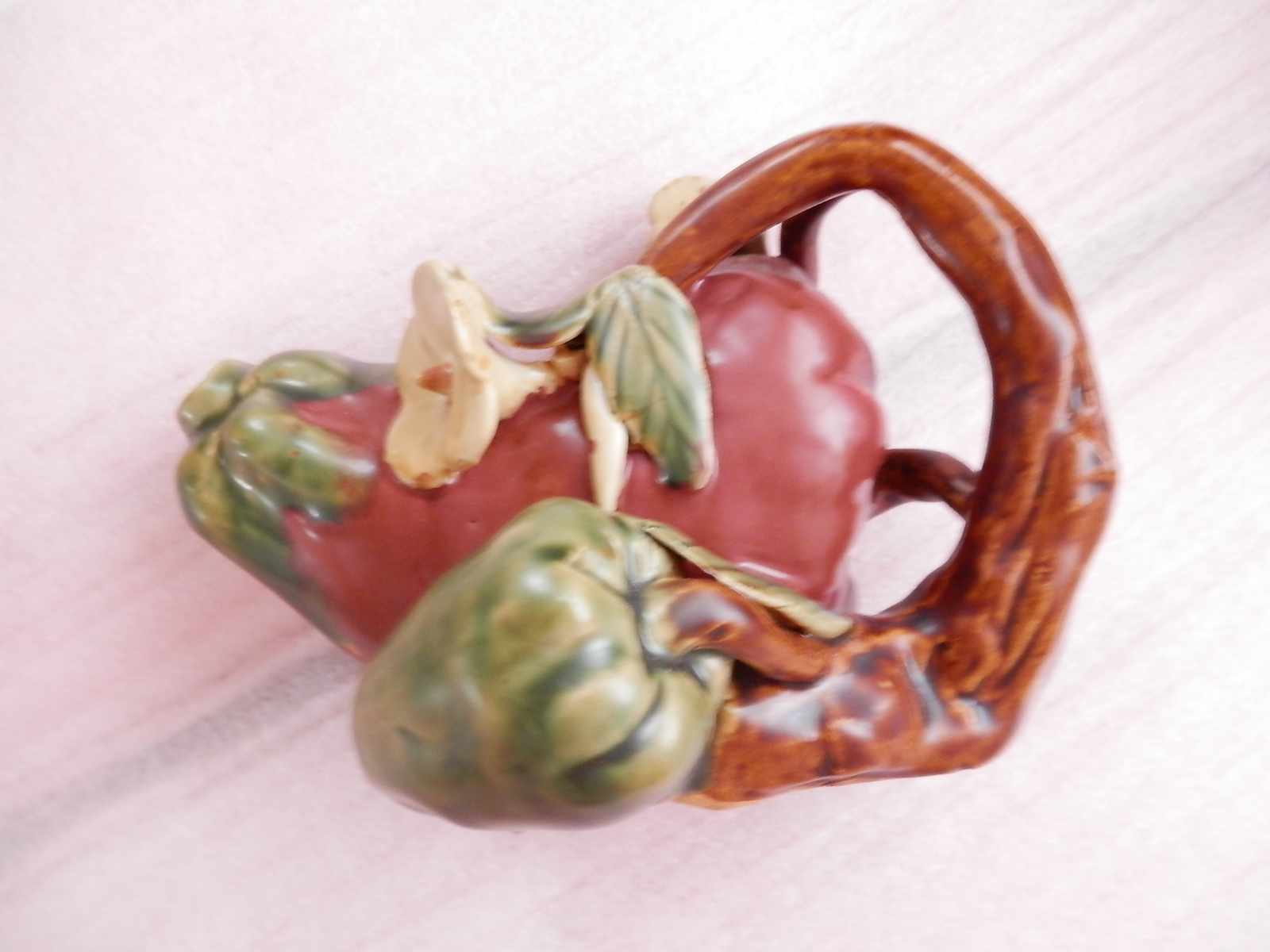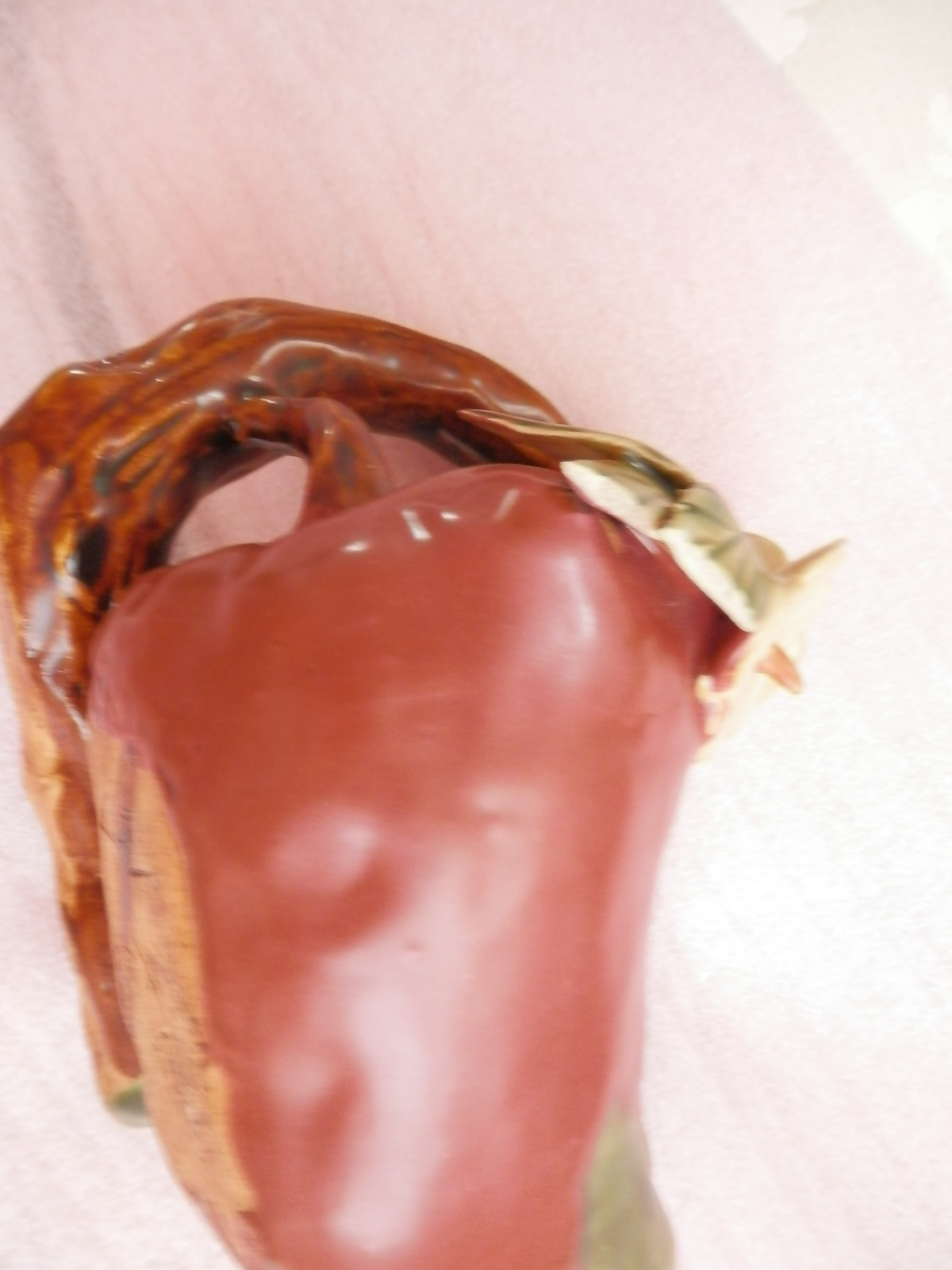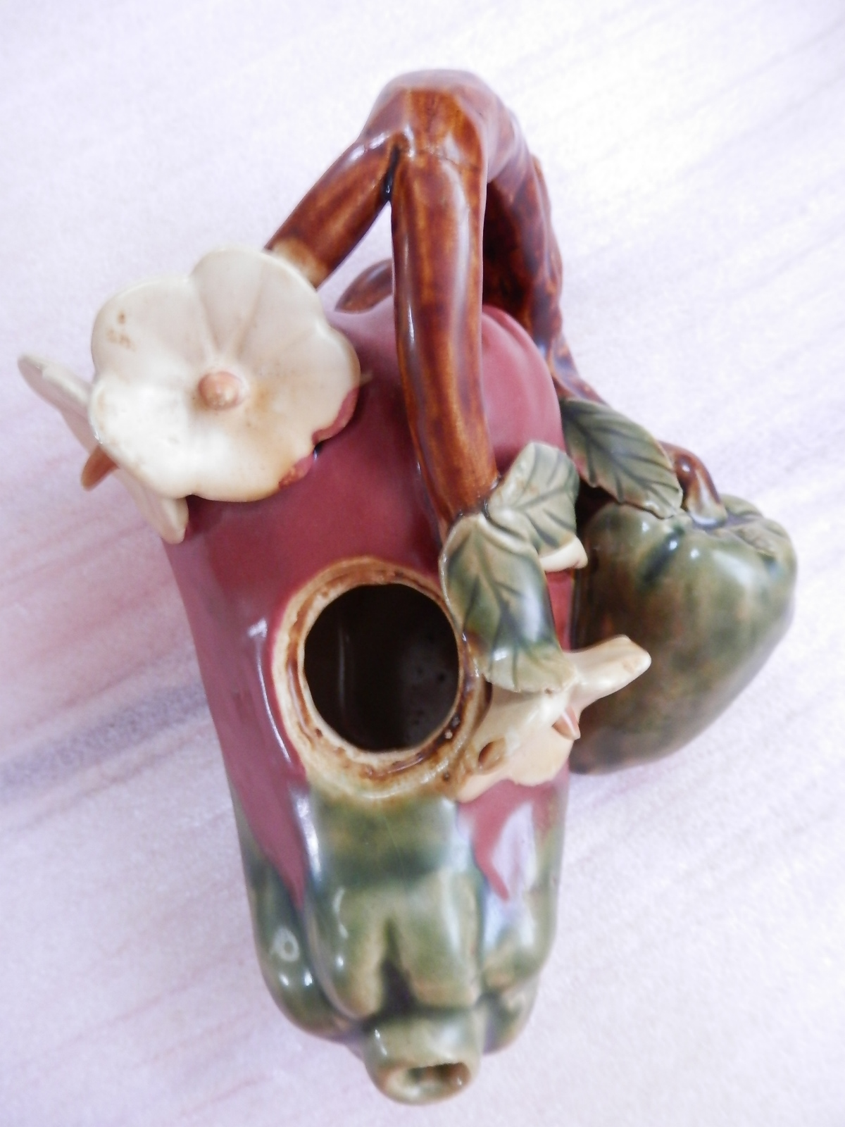 Very heavy pottery teapot. Looks like a red pepper (although very dark red) and green pepper with flowers and stems. The insides looks to be glazed but the hole is too small to photograph. I cannot read the maker's mark on the bottom, if that;s even what it is. I would appreciate any help in identifying this piece. Thank you!