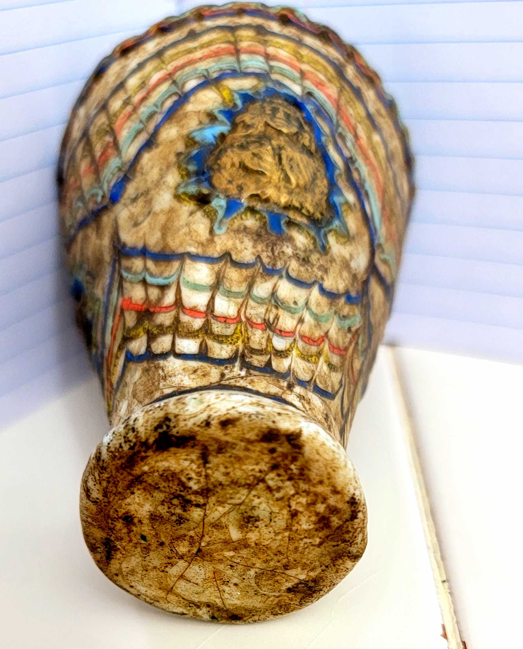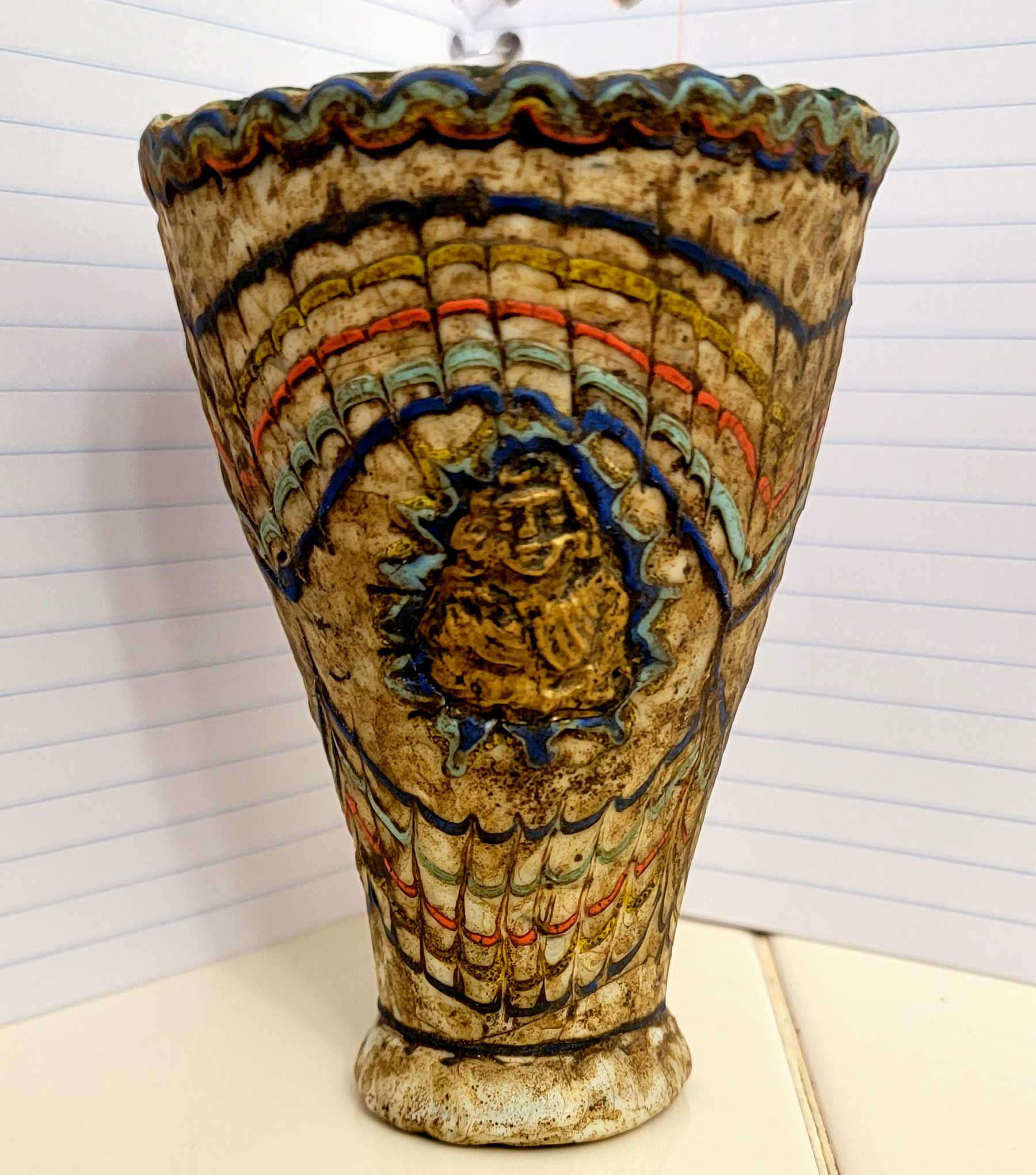I have a primitive, hand painted tapered cup of unknown composition, origin, or artist. It is 4.25" tall, 3" in diameter at the top and tapers to 1.5" at the base. It has a green patina on the interior and is thin enough to be translucent when held to a light.