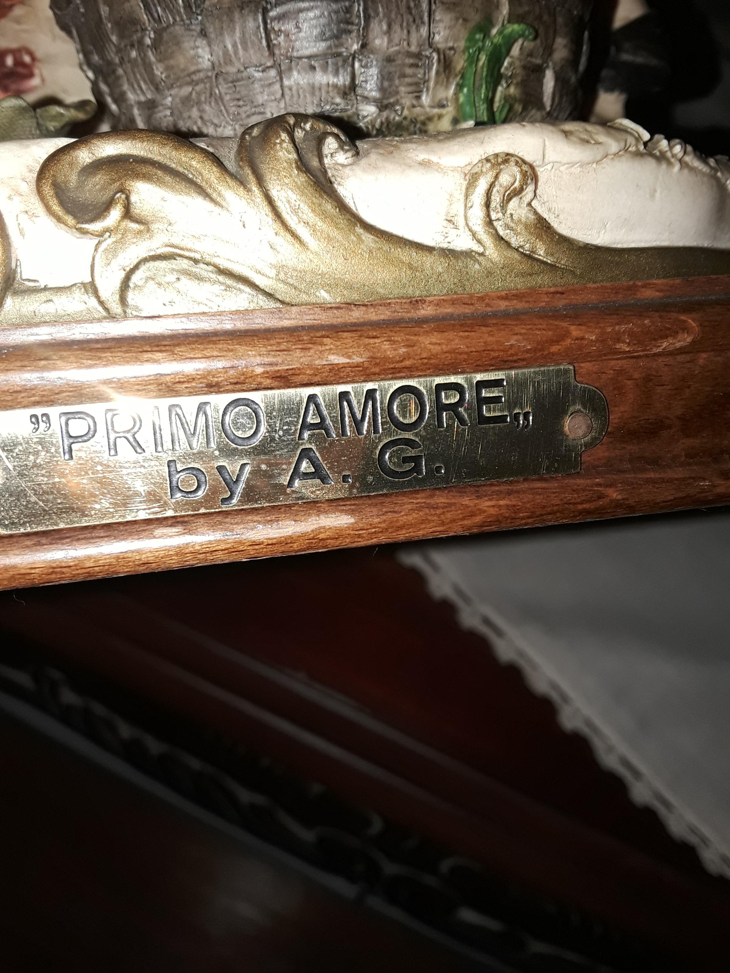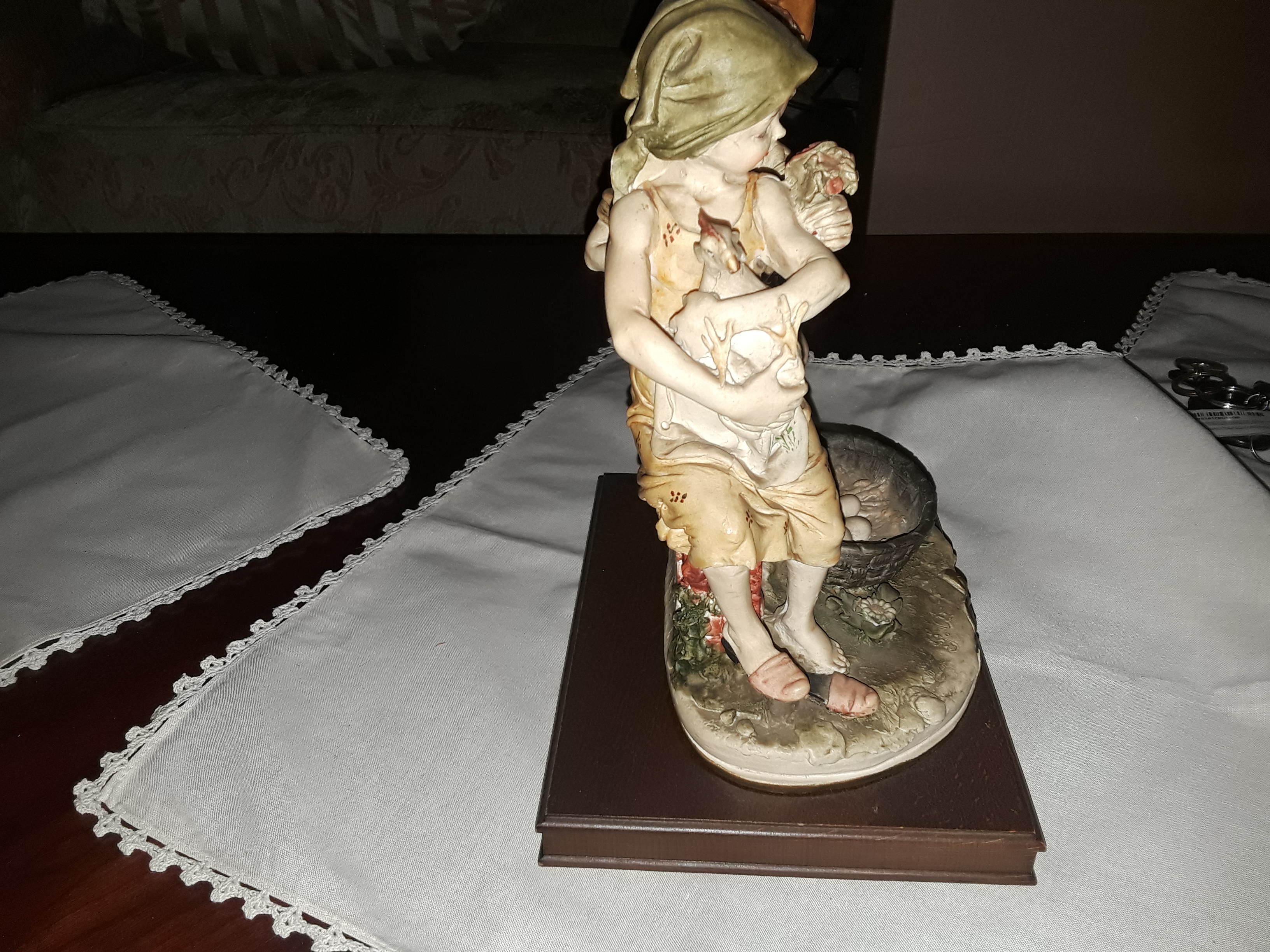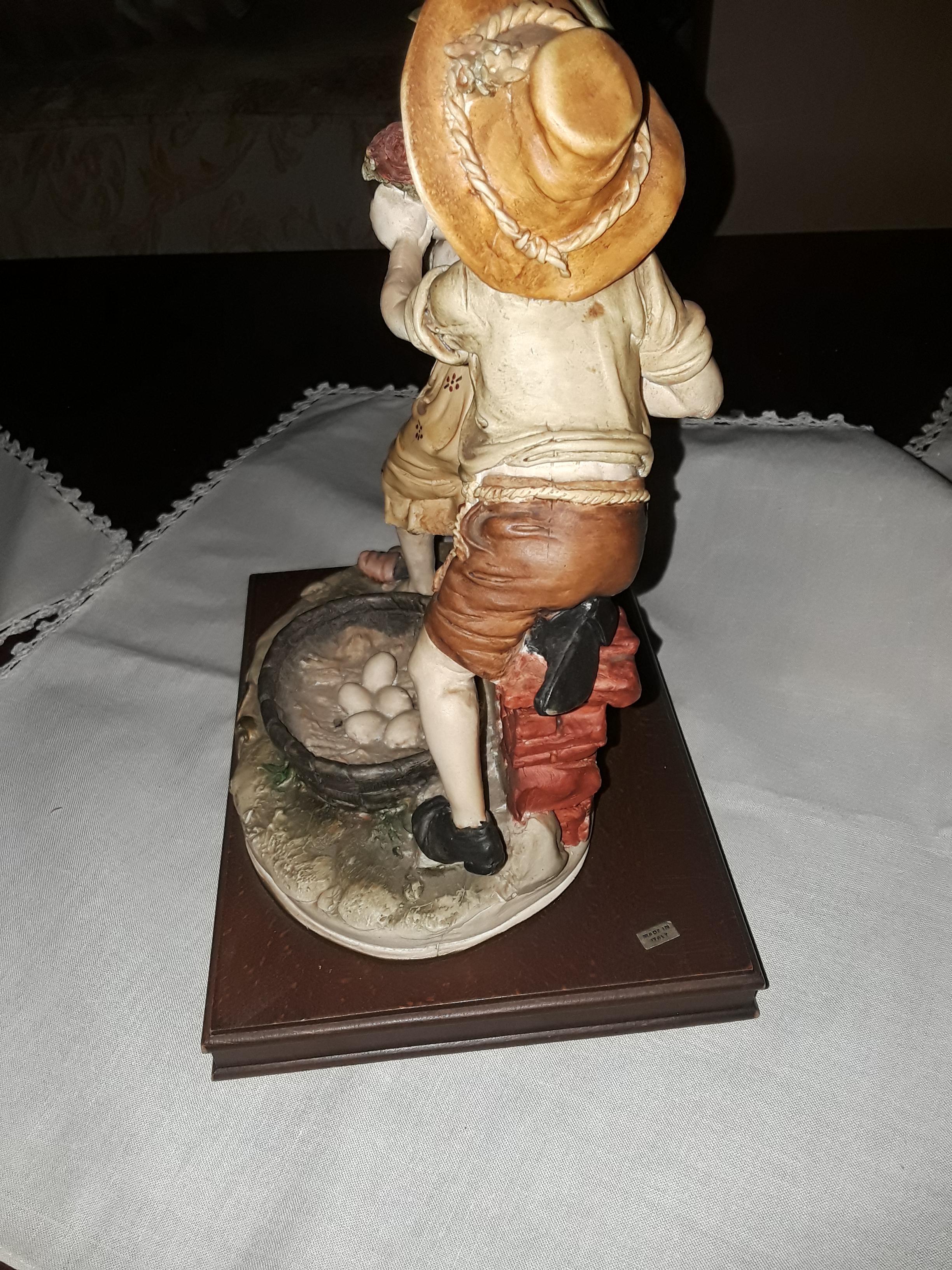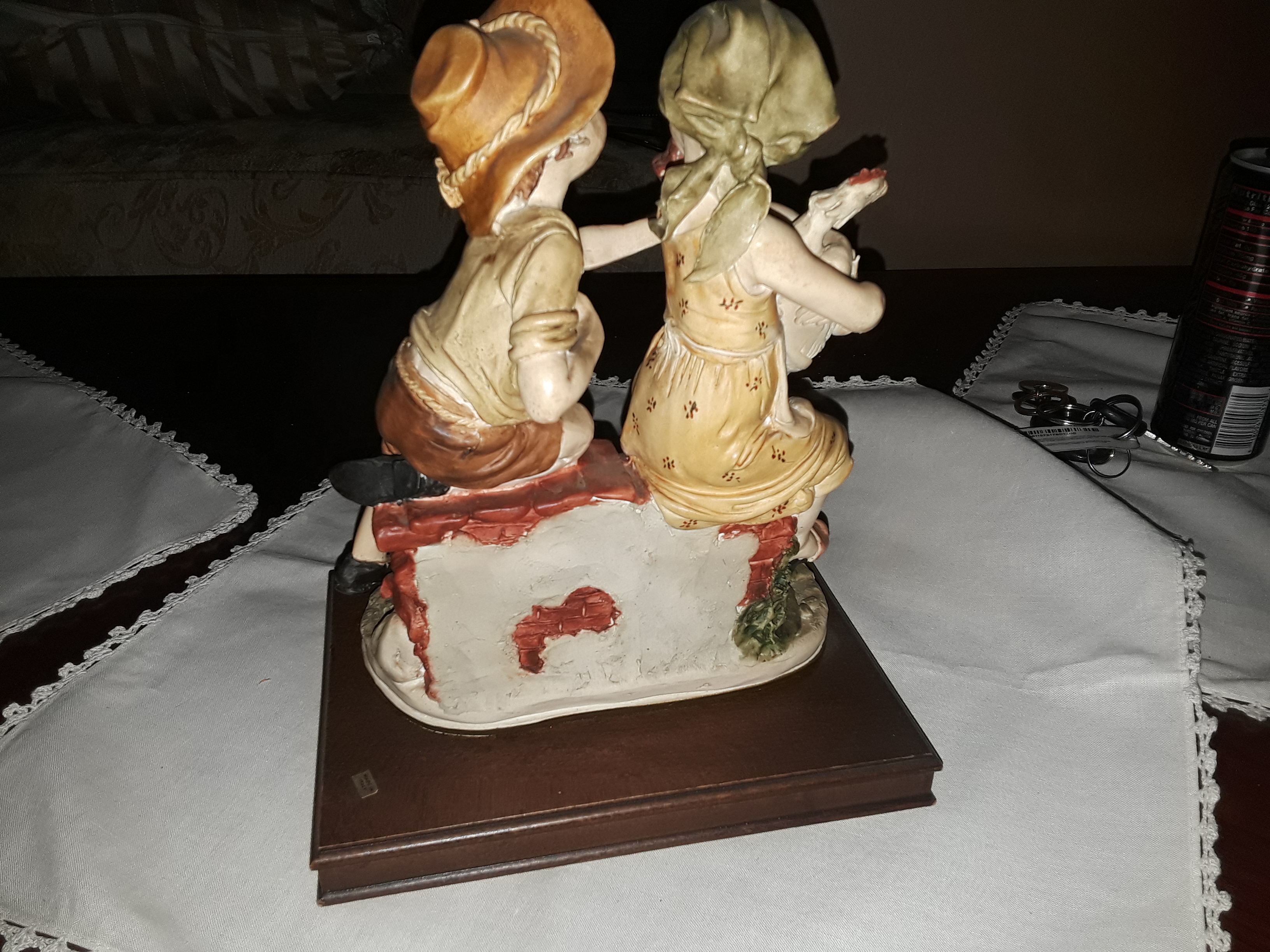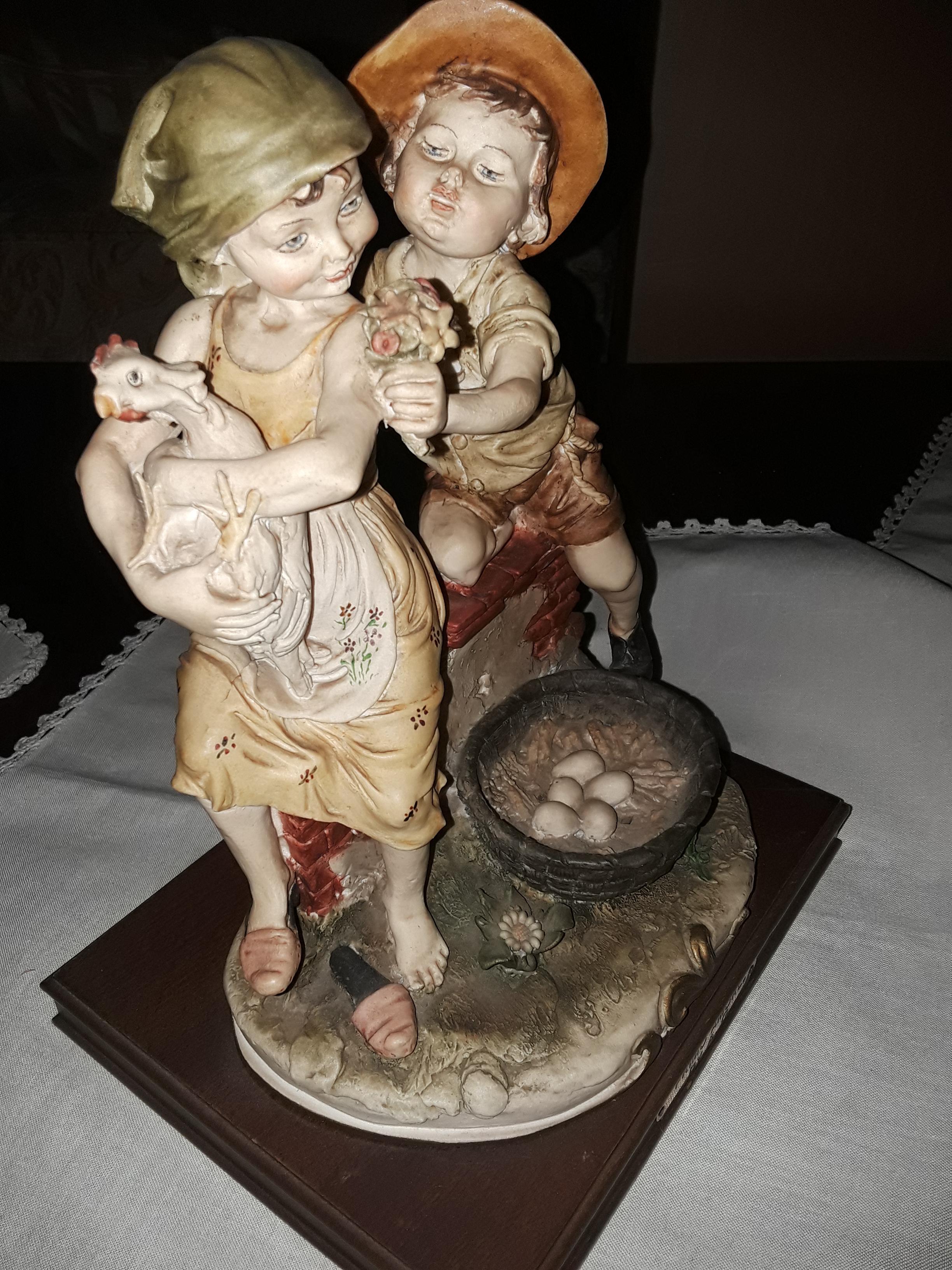 Figurine of boy and girl sitting on brick wall with chicken in her lap and egg basket sitting on floor.