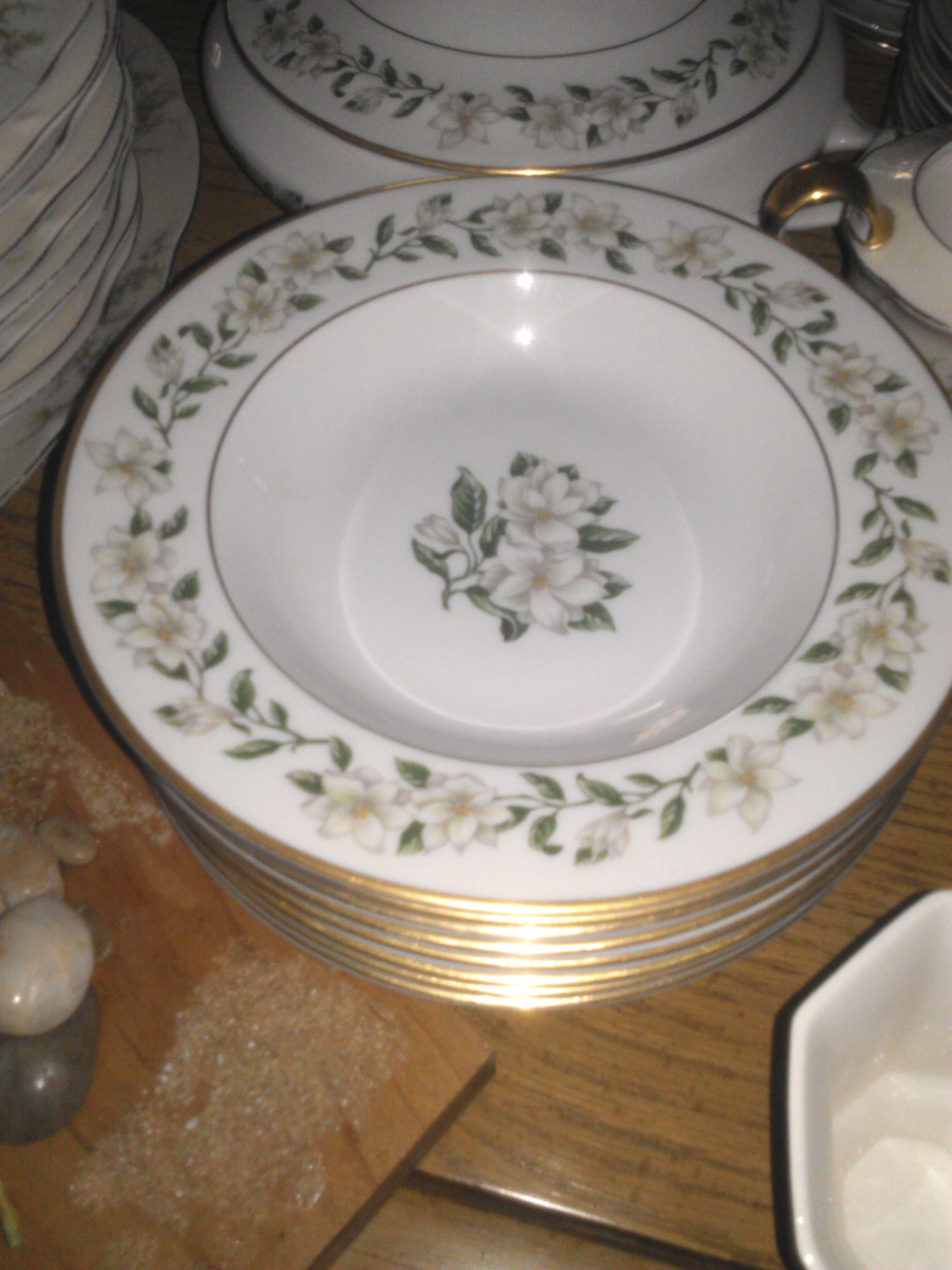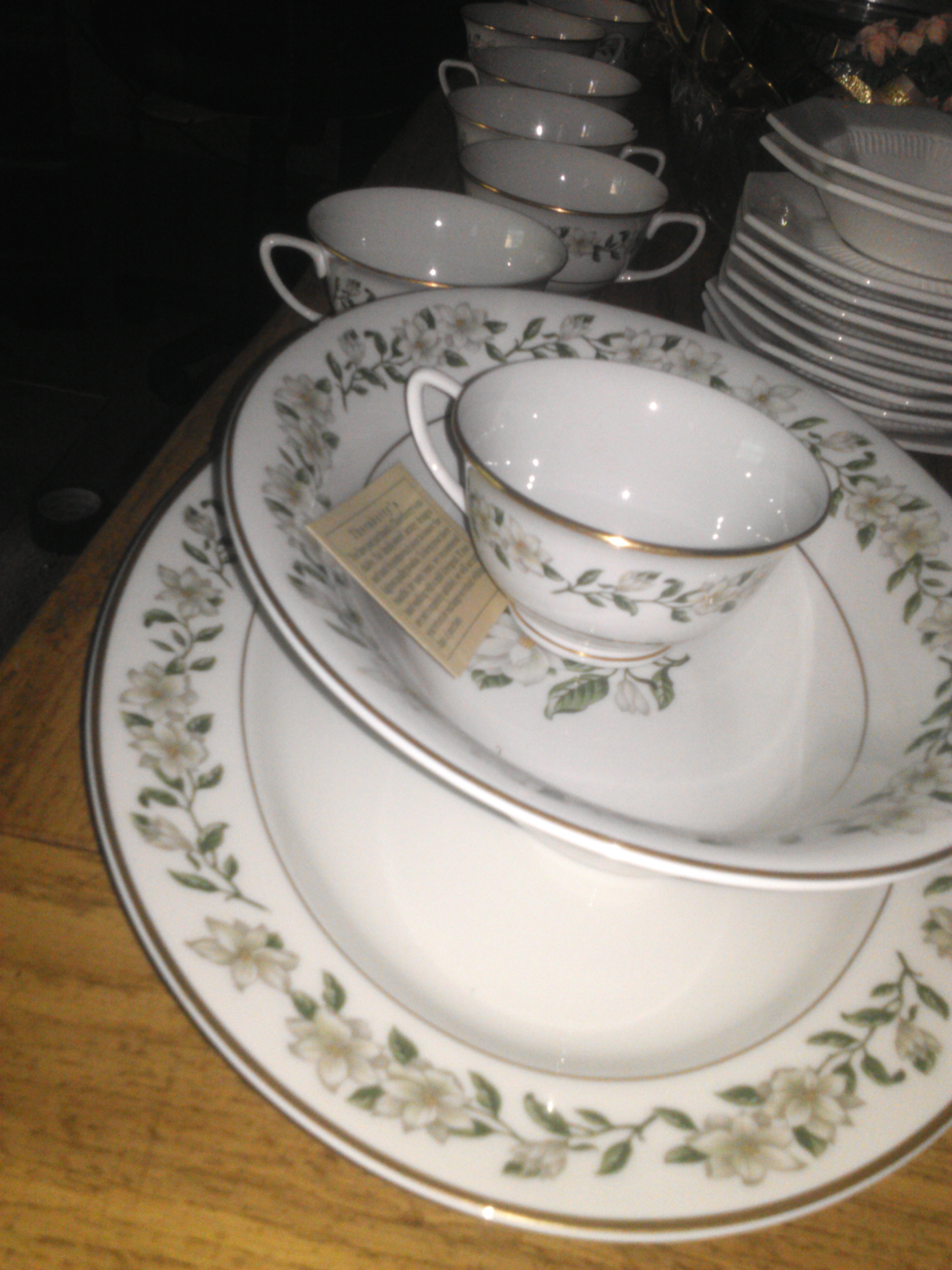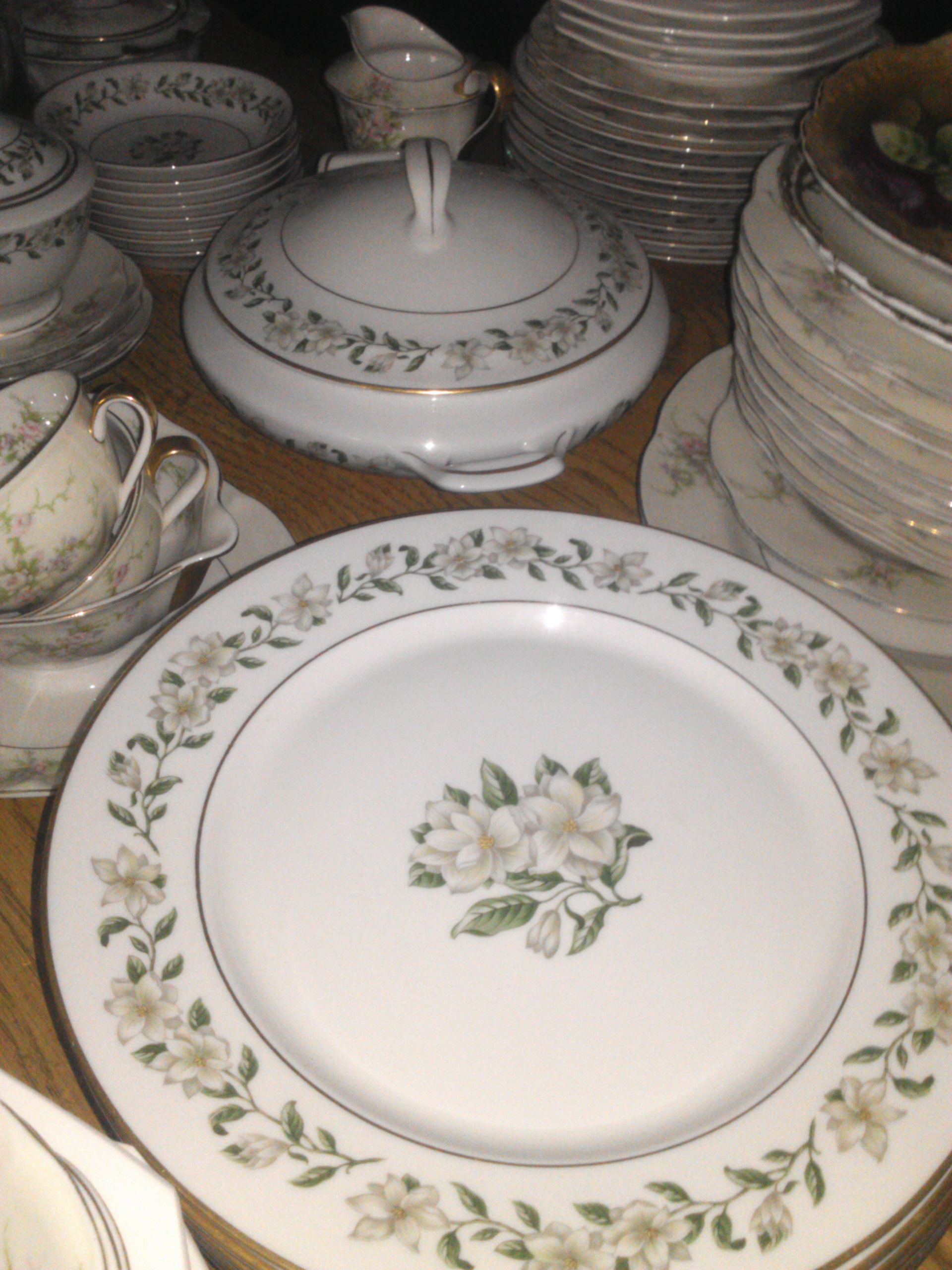 9 tea cups, 8 dinner plates,8 smaller plates,8 small bowl like plates, 8 smaller bowl like plates, 8 smaller plates, 5 tea cup plates, 1 big surving bowl, 1 big oval bowl, an oval surving plate, a what im guessing is for surgar, and some other tea cup size pouring thing... I'm obviously no fine china expert.