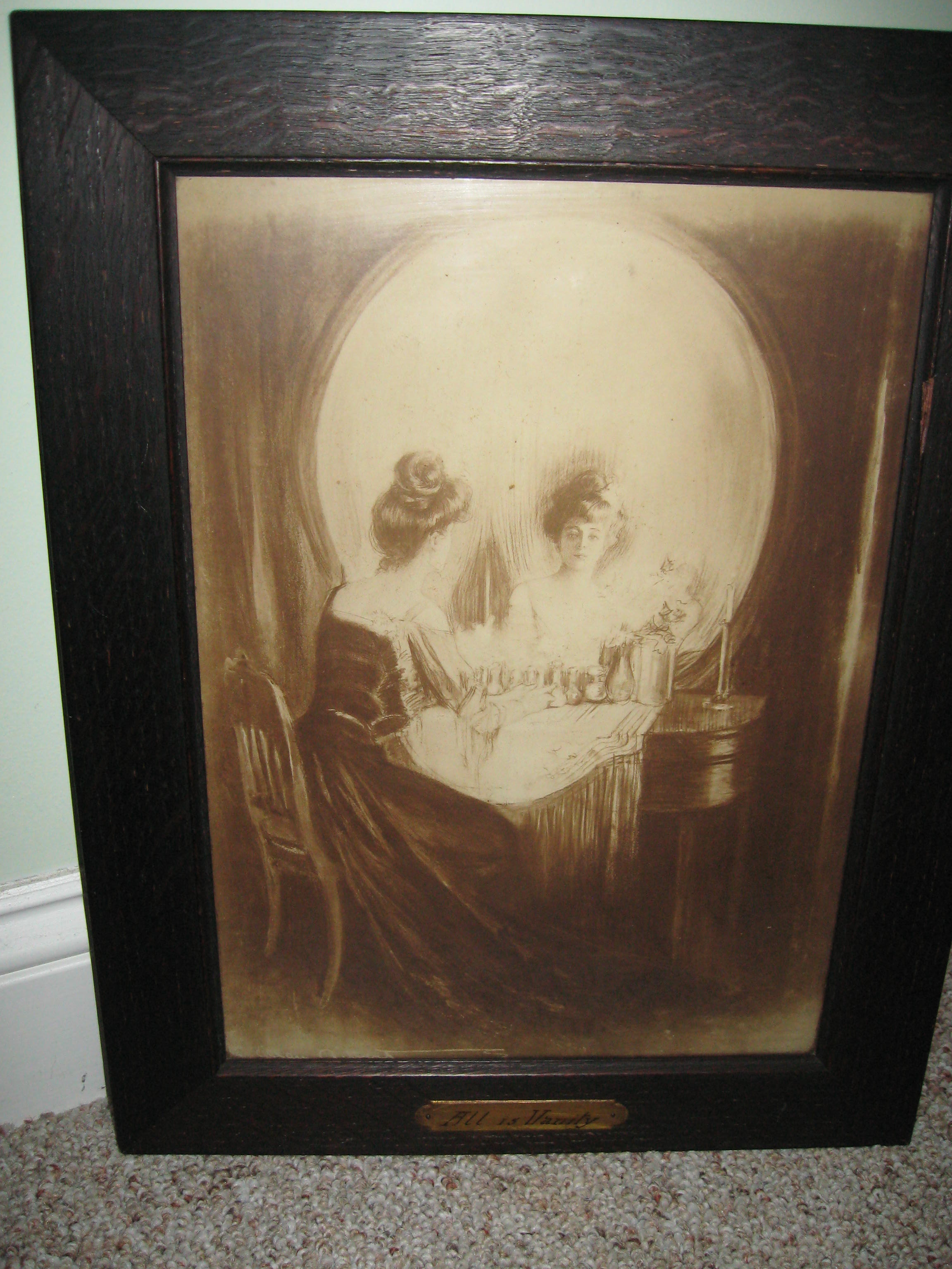 Print is in its original wood frame. has the vertical artifacts wich look like eraser smudges on forhead of skull. plaque saying All Is Vanity on frame.