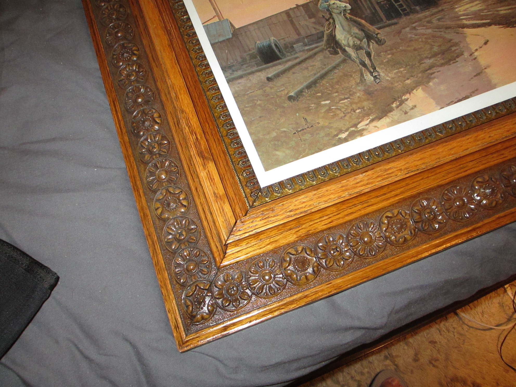 You have a very nice frame. From the pics it looks to be solid oak with very desirable victorian western elements. You should always include the artist's name. As for the print, artist name, open or limited edition, signed by the artist and the big one condition would all be factors in determining value.