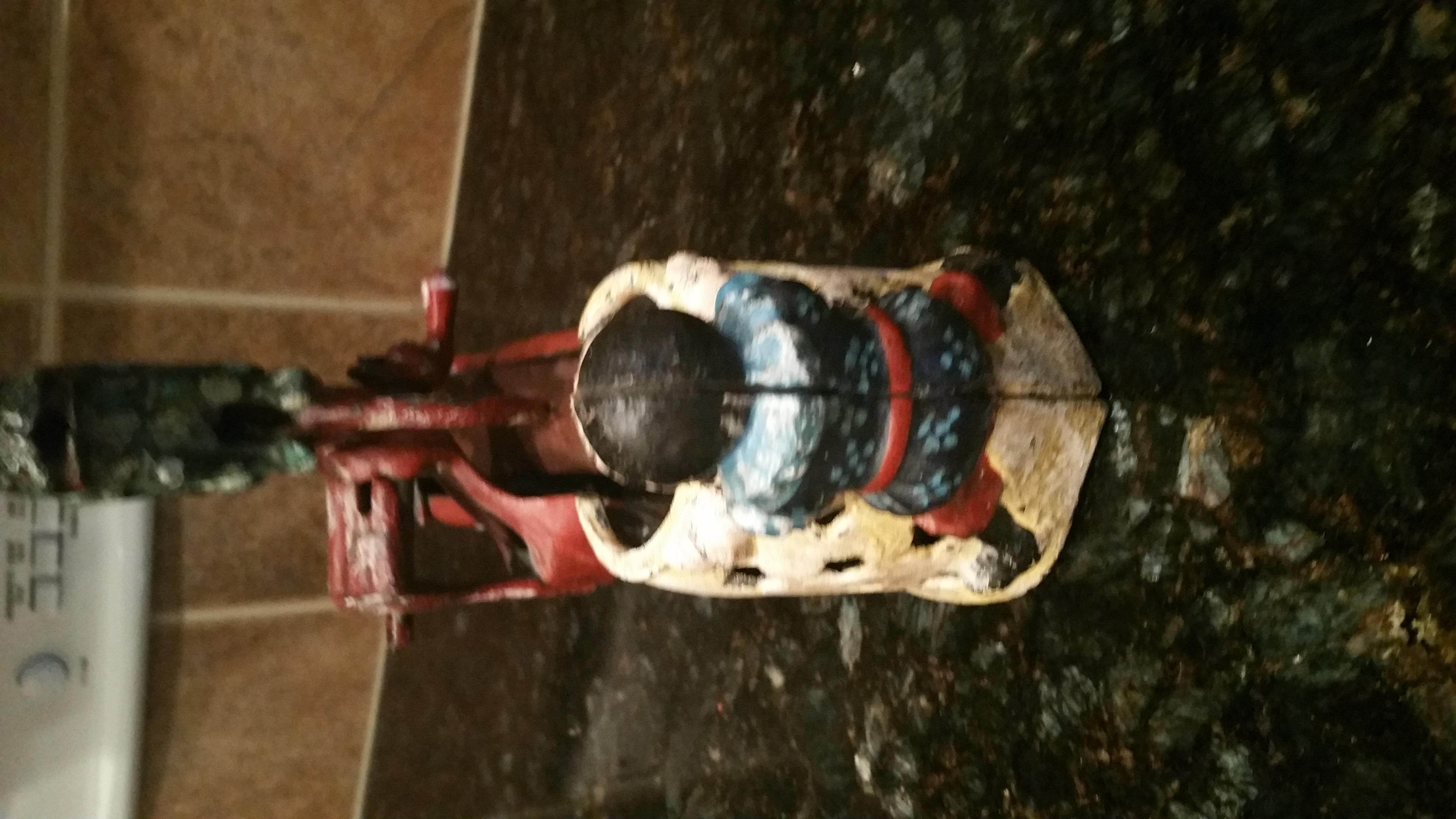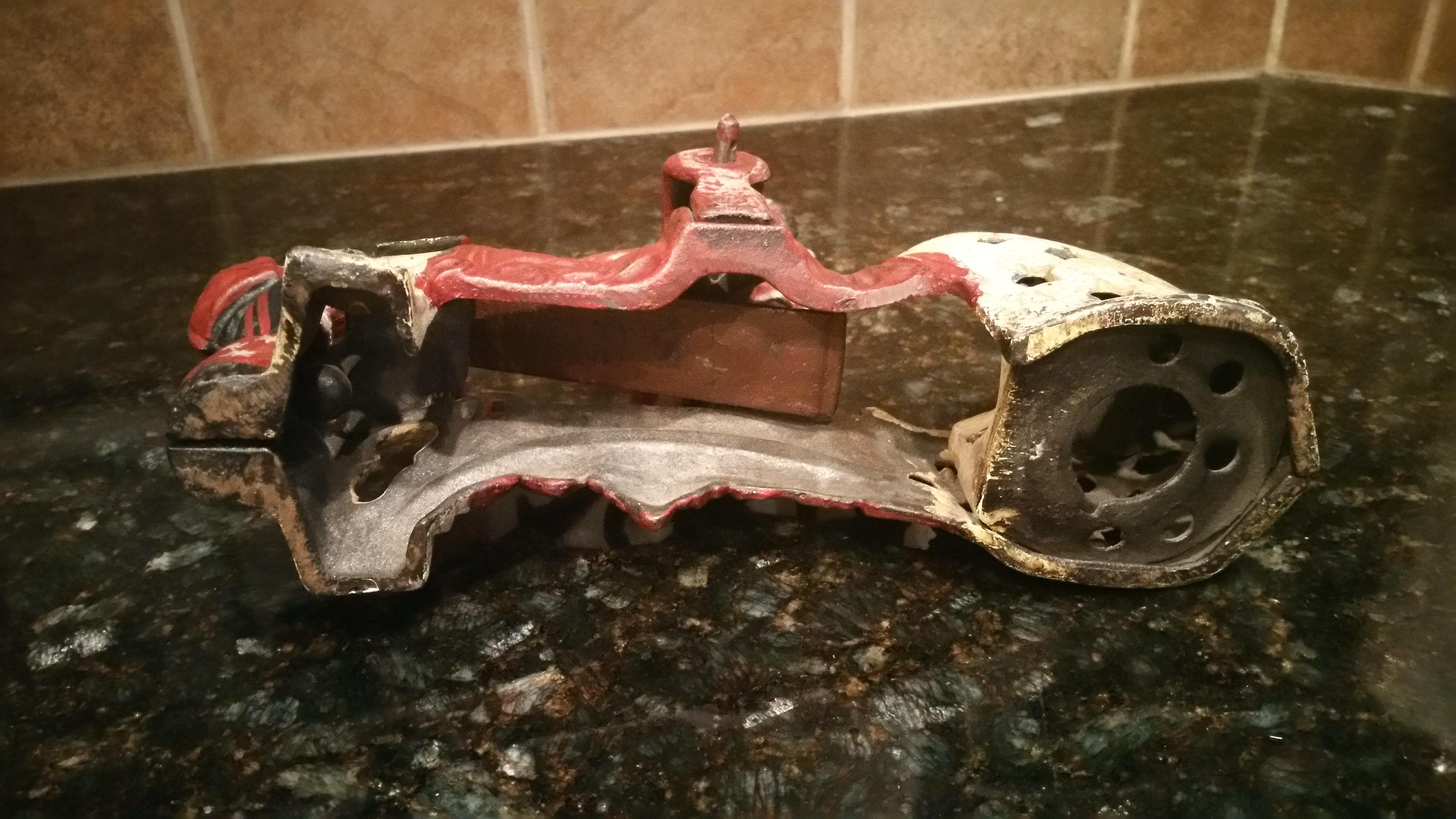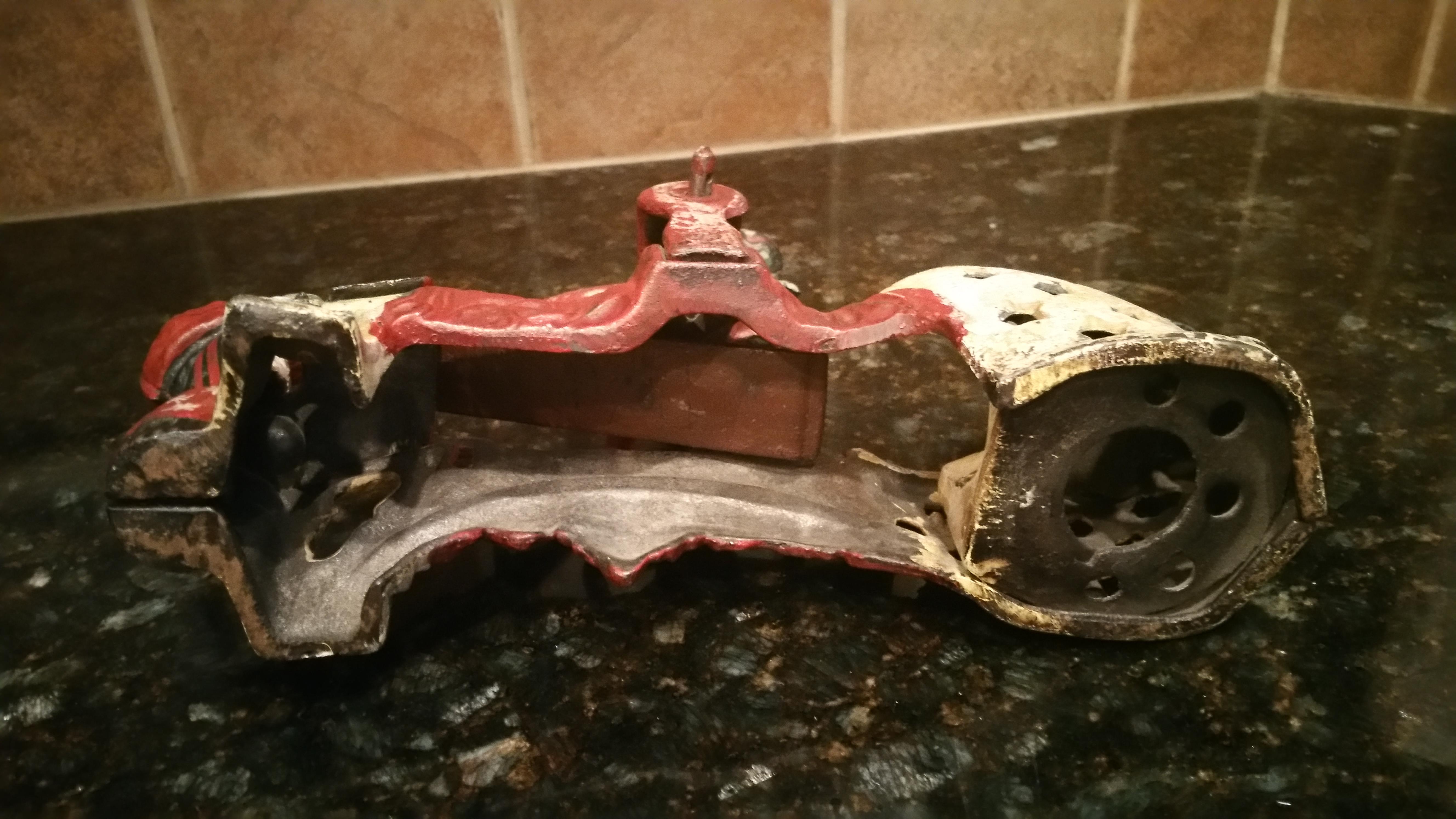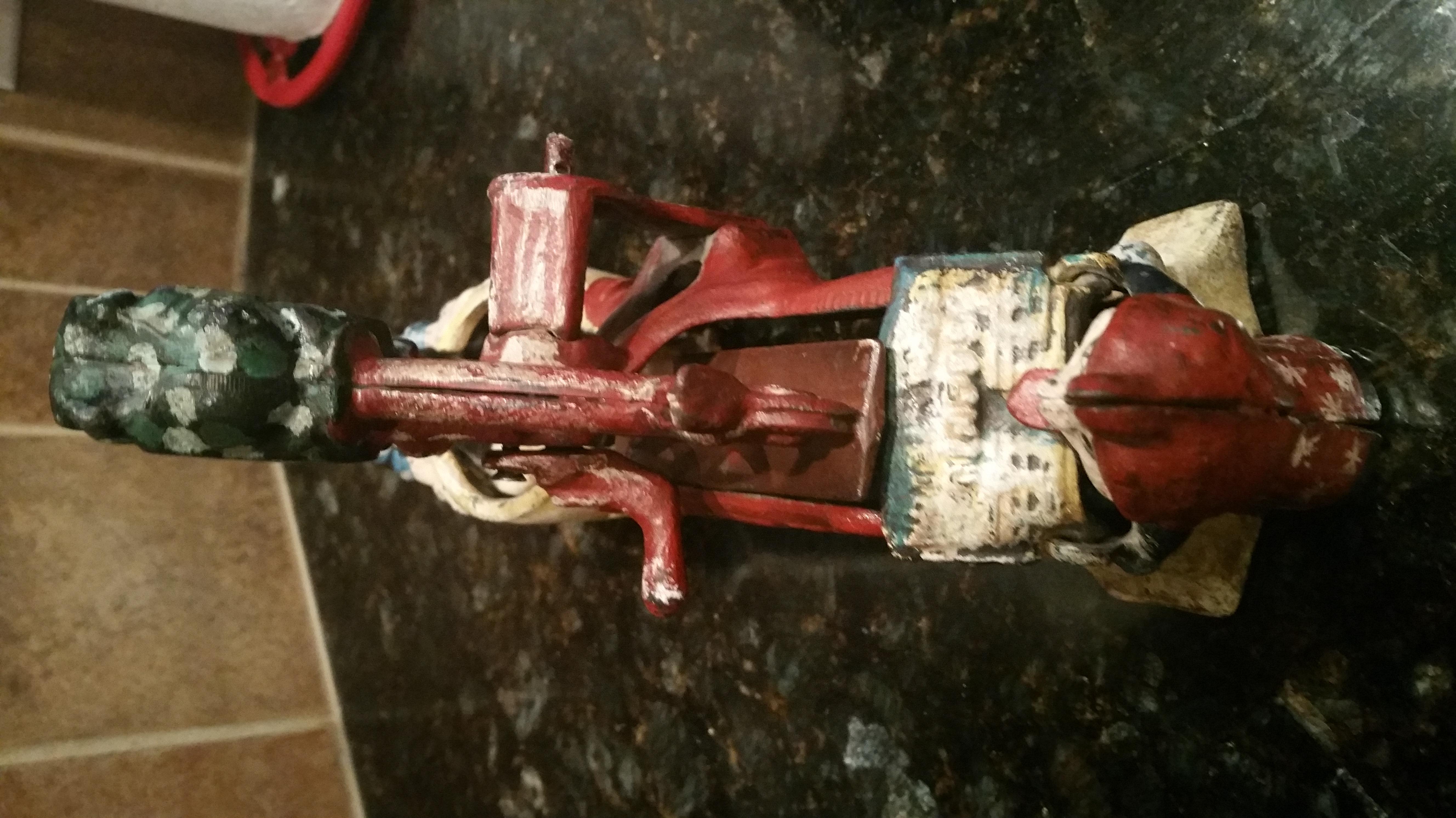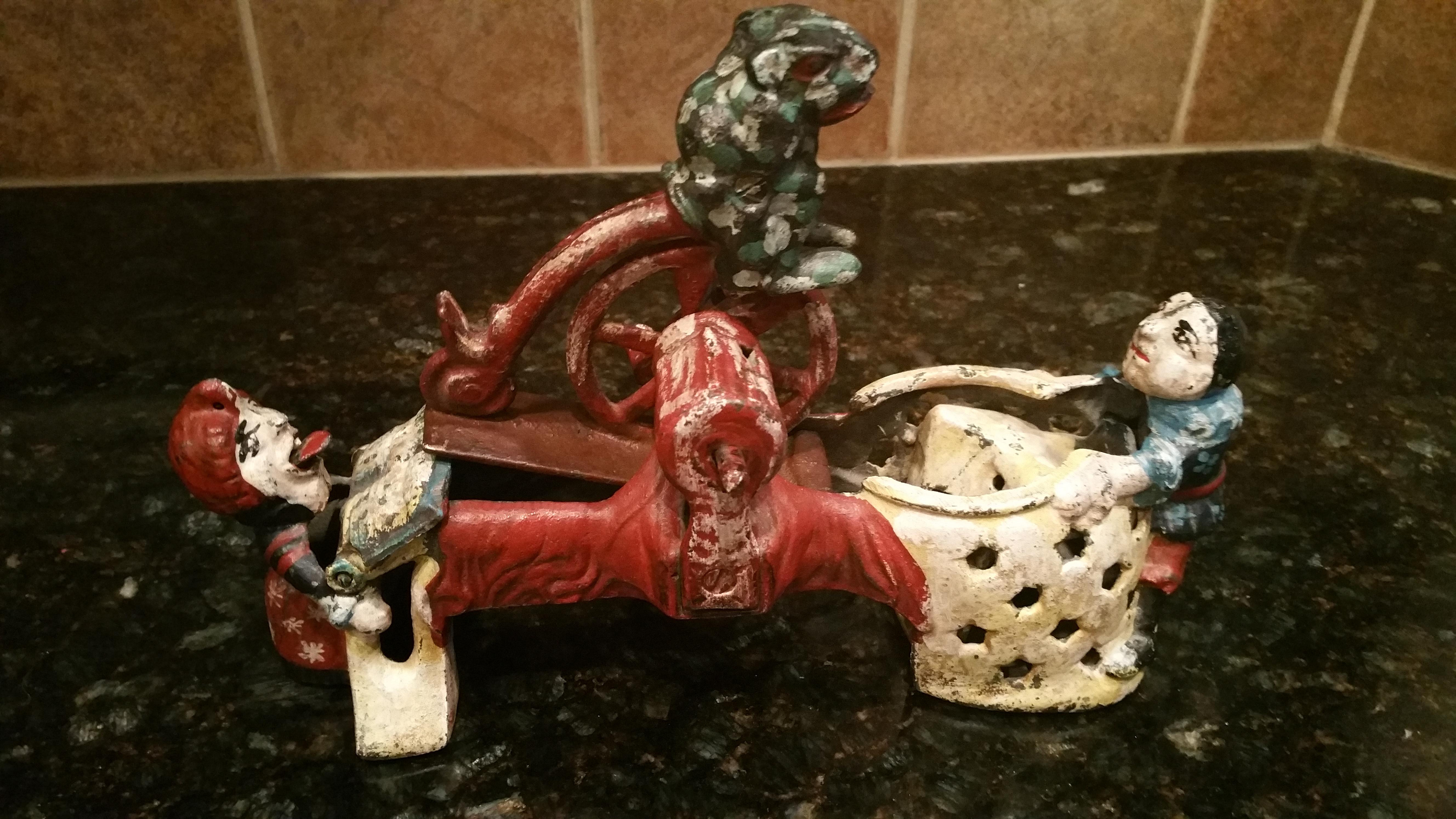 We purchased this in an antique store in Camden South Carolina last weekend. We know it is a stretch, but we only paid 12 for it and just wondered if it is an original or reproduction. It appears to be missing some parts that would make it work automatically.