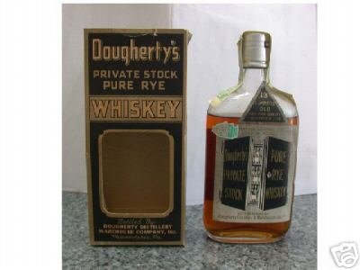 This is a bottle and box of an unopened bottle of doughertys private stock pure rye whiskey bottled in 1930. This is prohibition alcohol used for medicinal purposes only. This box as well as the bottle is both in very good condition.
