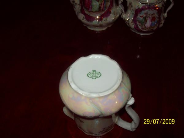 It's a three piece tea set, with three figures on it two ladies and a man . It also has gold flowers on it. It's a pearly white color.