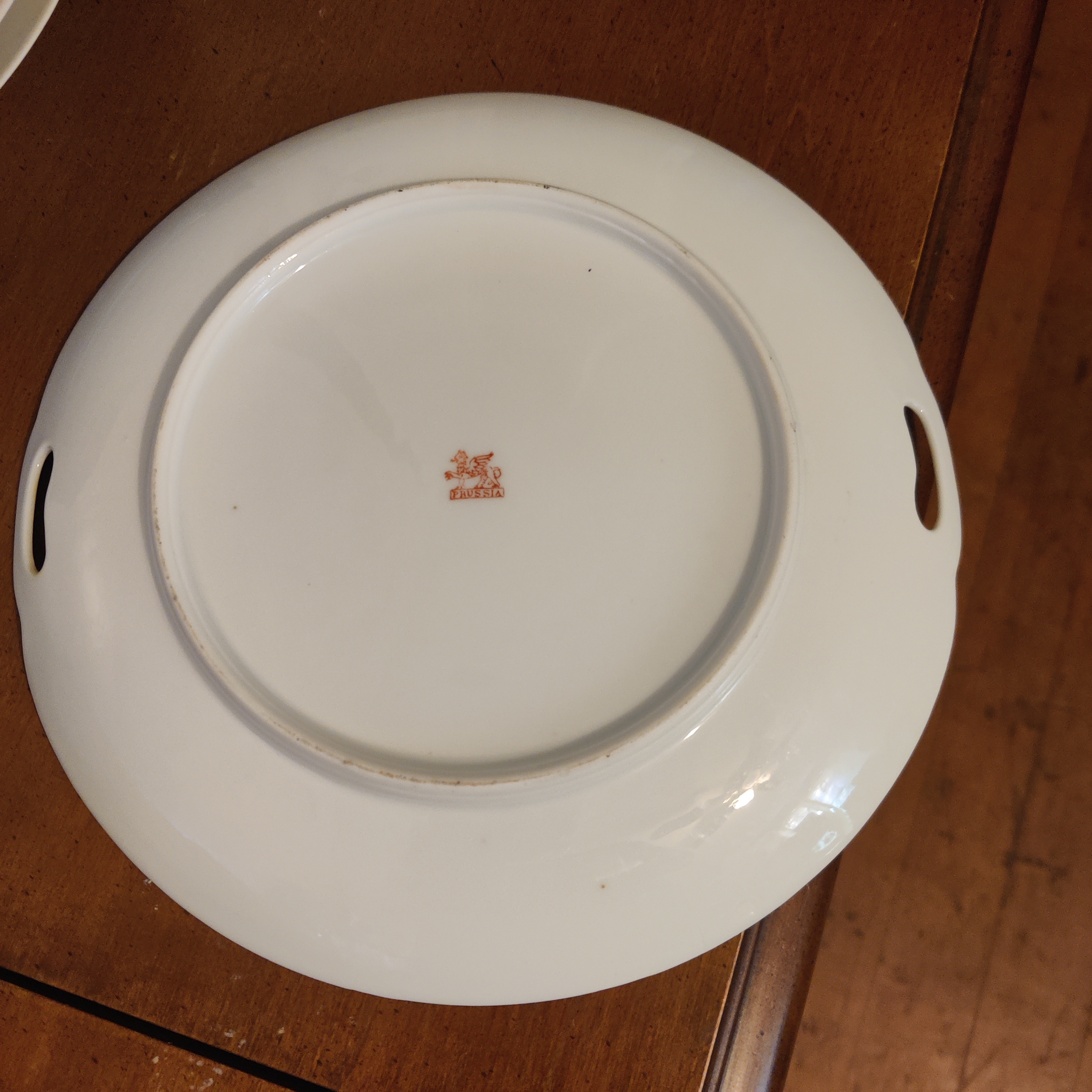 The mark is "Prussia" with a red winged griffin, a mark used by P. Donath circa 1910- 1916, Silesia, Germany.