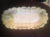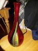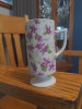 The pitcher is green at the bottom with a varigated base. The color turns yellow then gold at the top. Their is a purple flower on one side and purple and yellow flowers on the other. It has a spout and handle and is trimmed in gold paint.