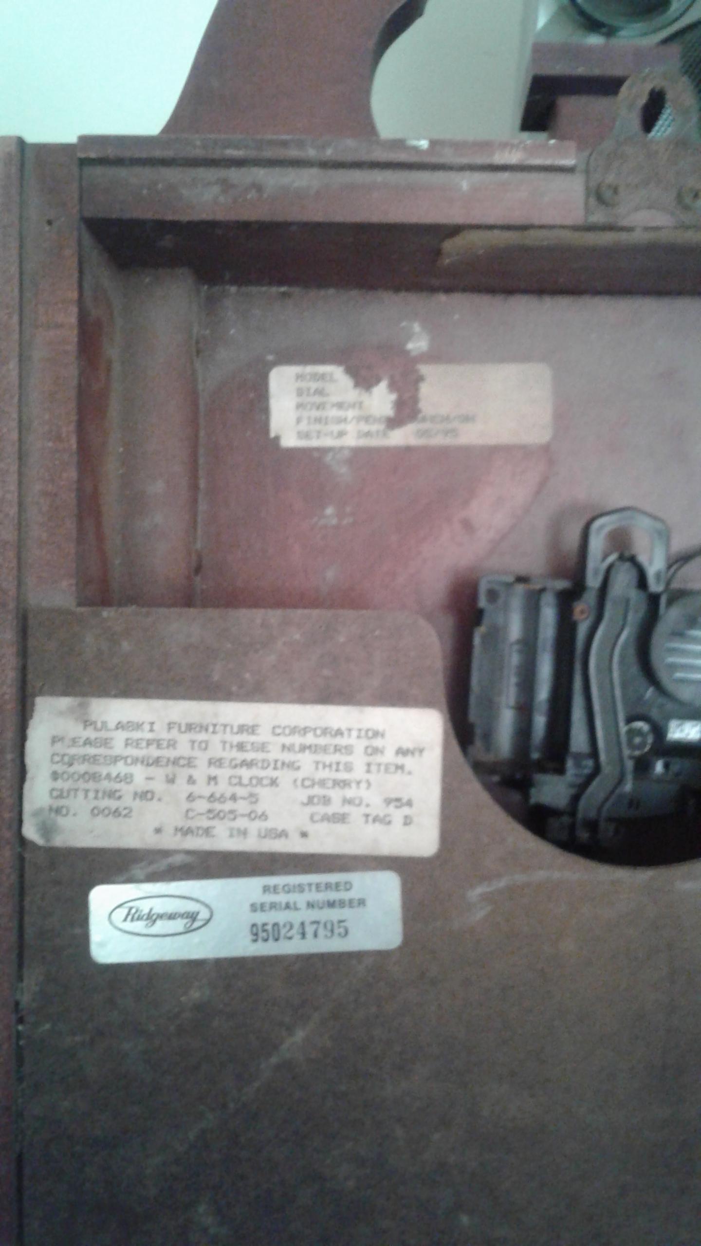 Wall clock made out of cherry wood. At the back it has a ridgeway serial number and a sticker that also says it's from a pulaski furniture company. Any info on this piece is much appreciated.