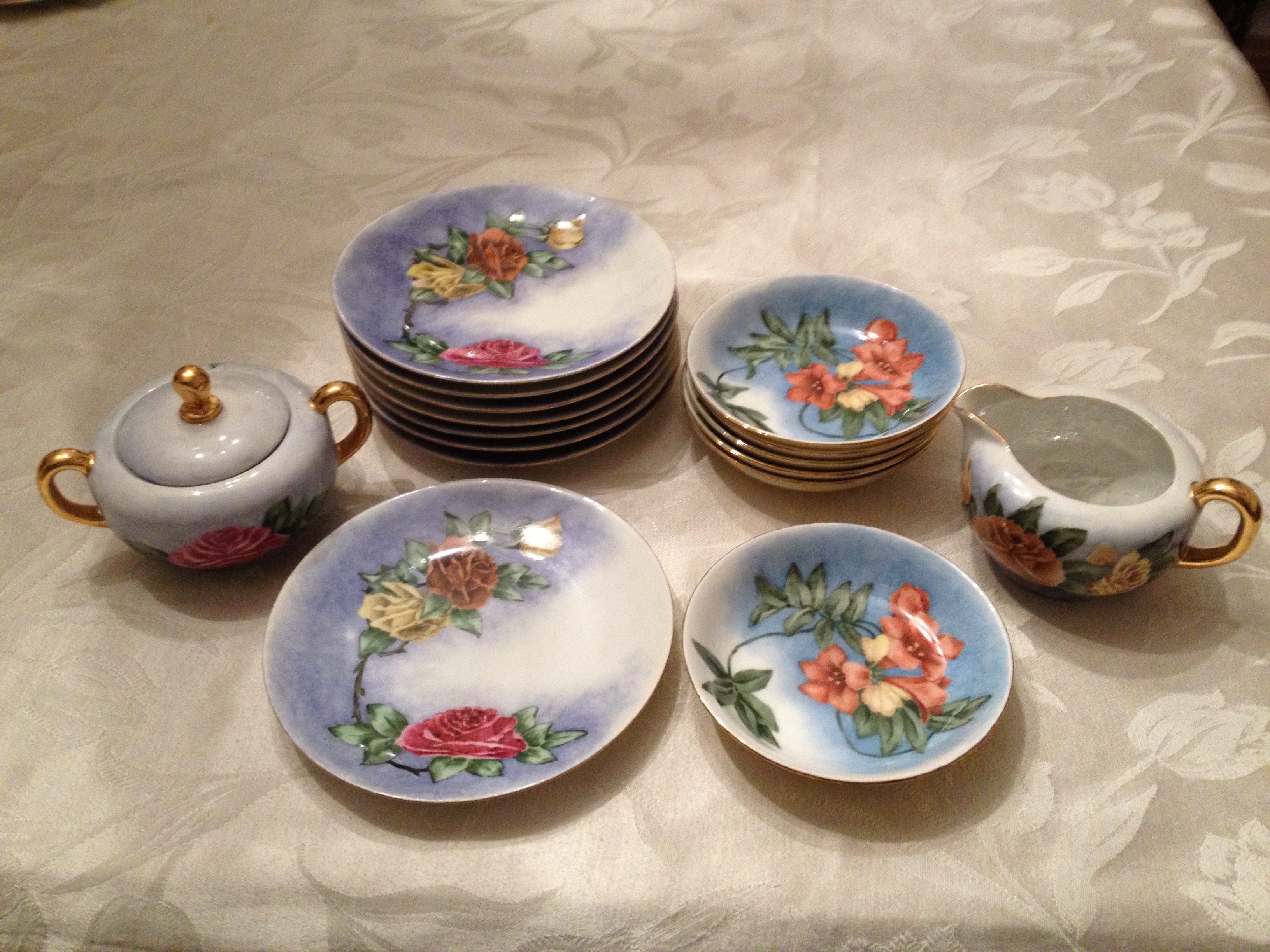 These pieces are believed to have been in my husband's family since the 1920s. Although the 7" plates and the sugar and creamer are very similar (almost identical) in pattern, the sugar and creamer are Czech, whereas the plates are marked Germany. ALL the pieces, though, have the same alpha-numerical marking, including the small coupe fruit bowls that have no other marking and clearly do not match.