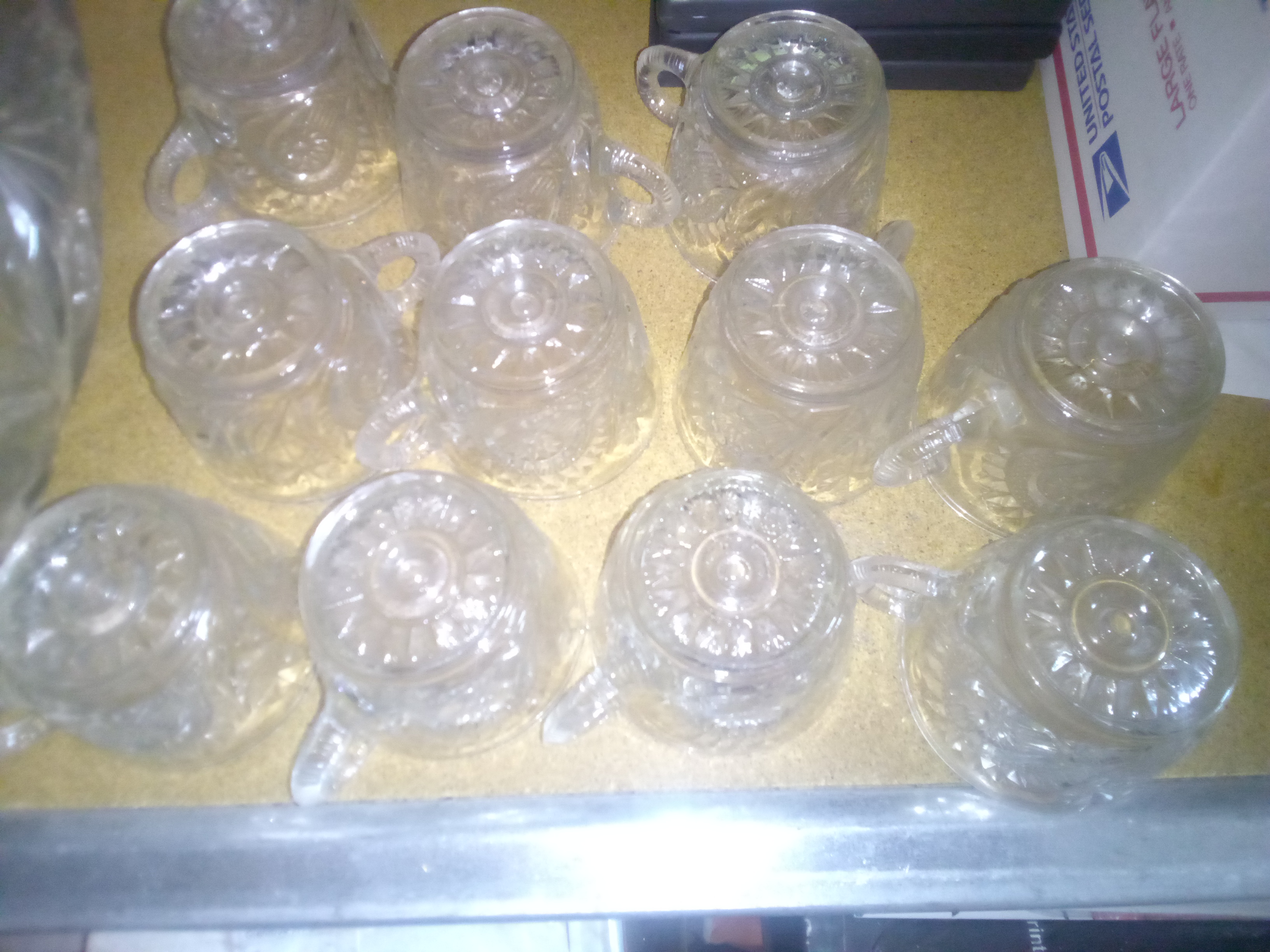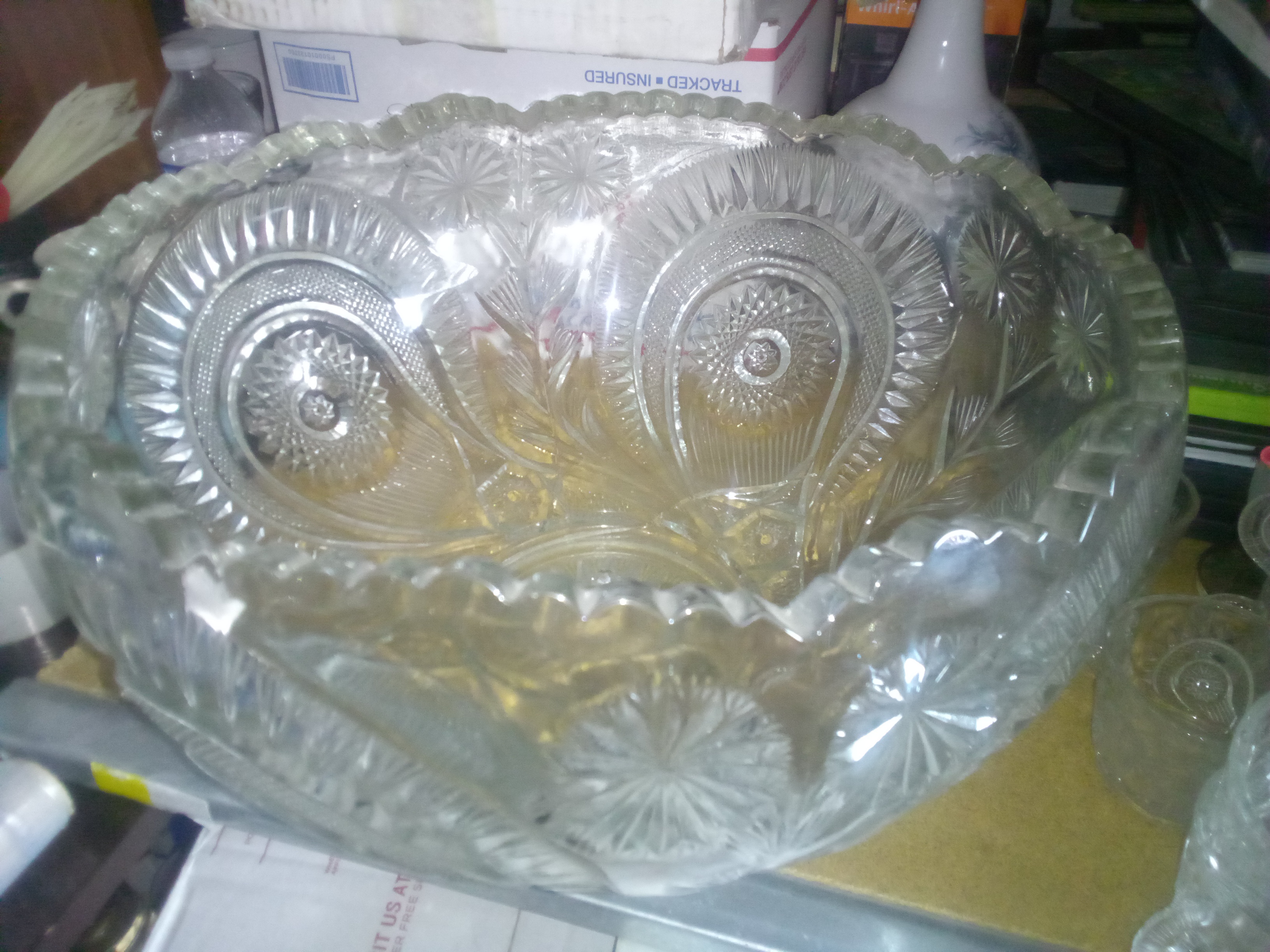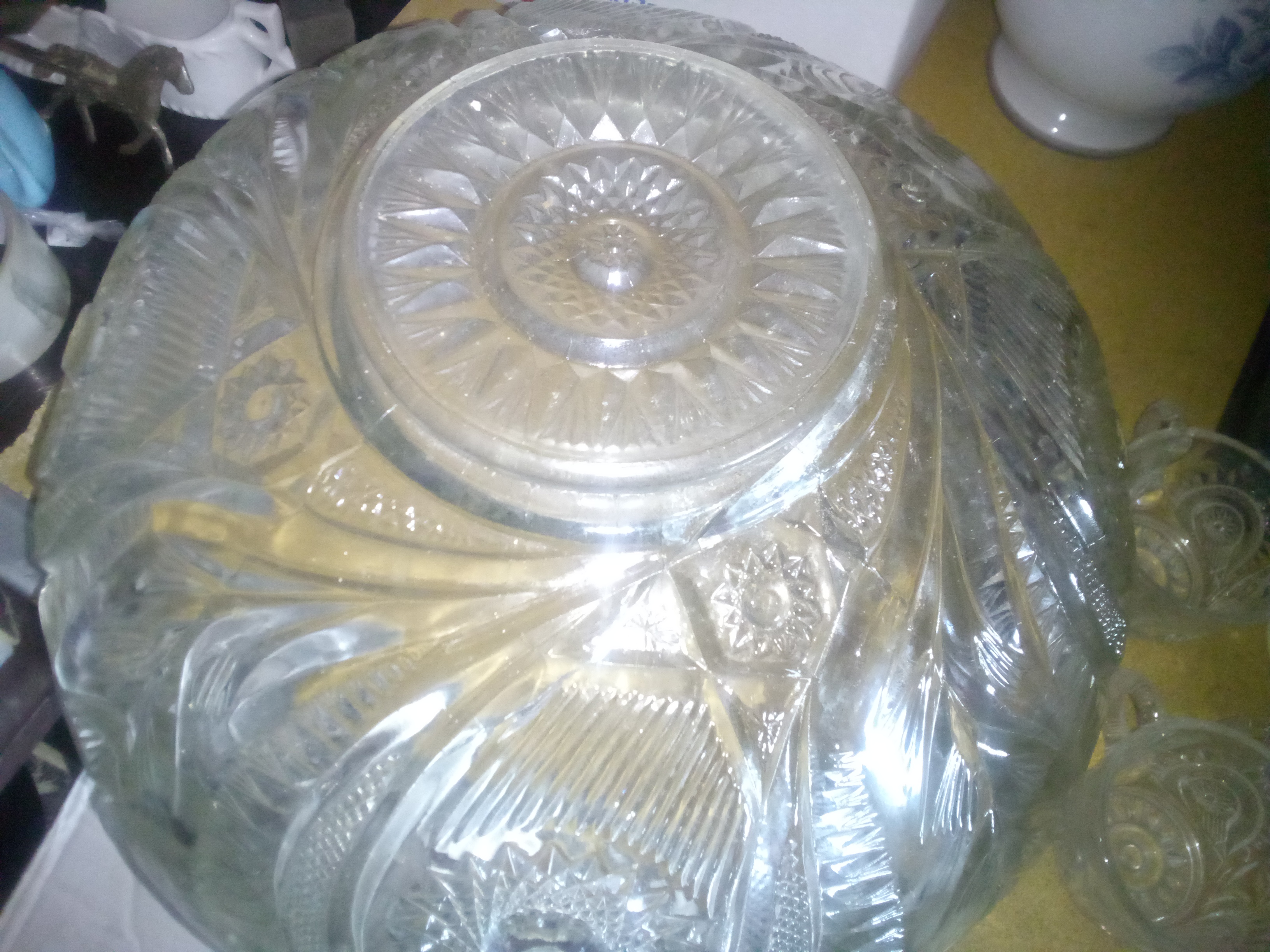 This is a substantial antique punch bowl accompanied by twelve matching cups. I believe it is cut glass, approximately 10 inches in depth.