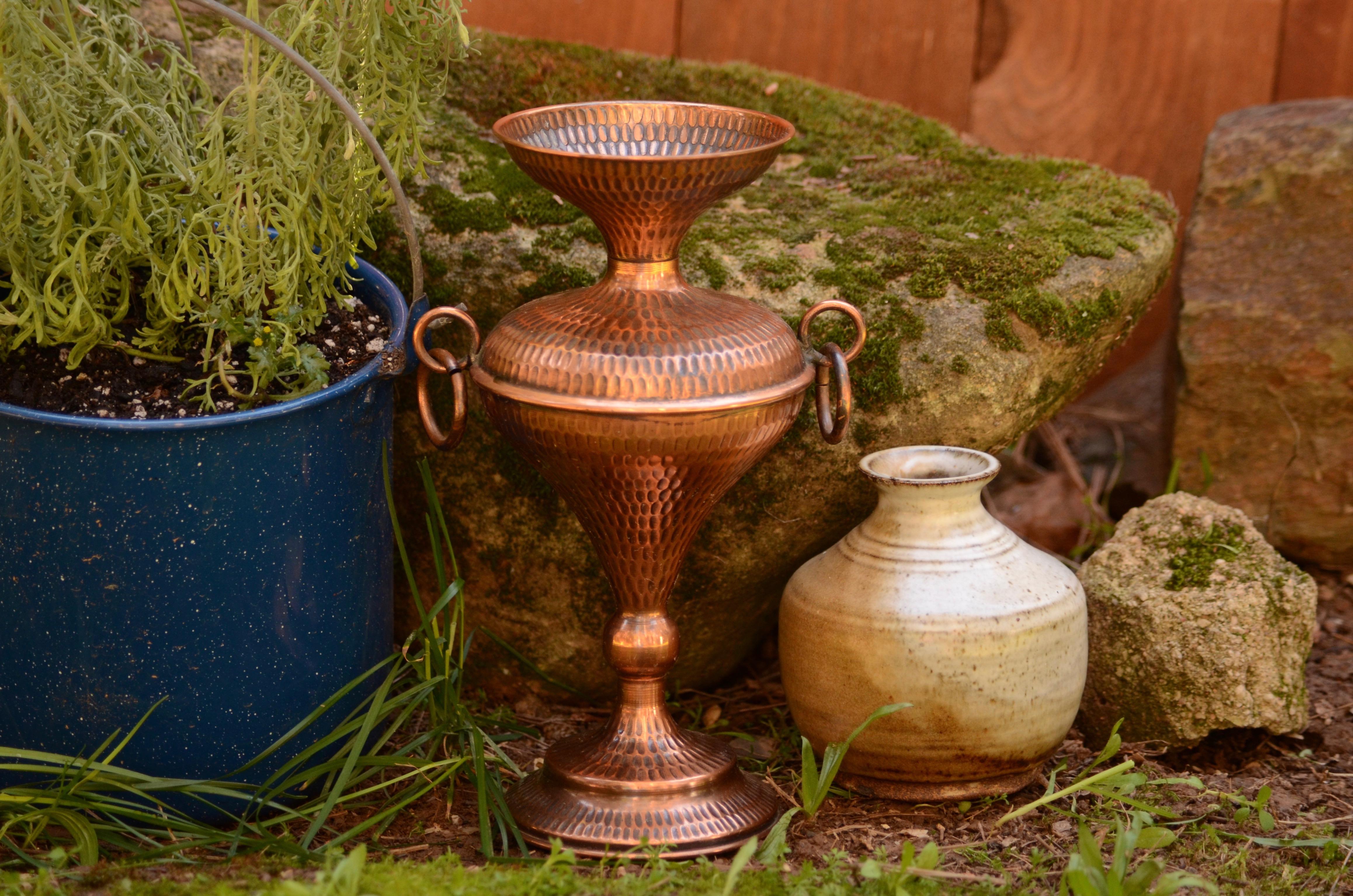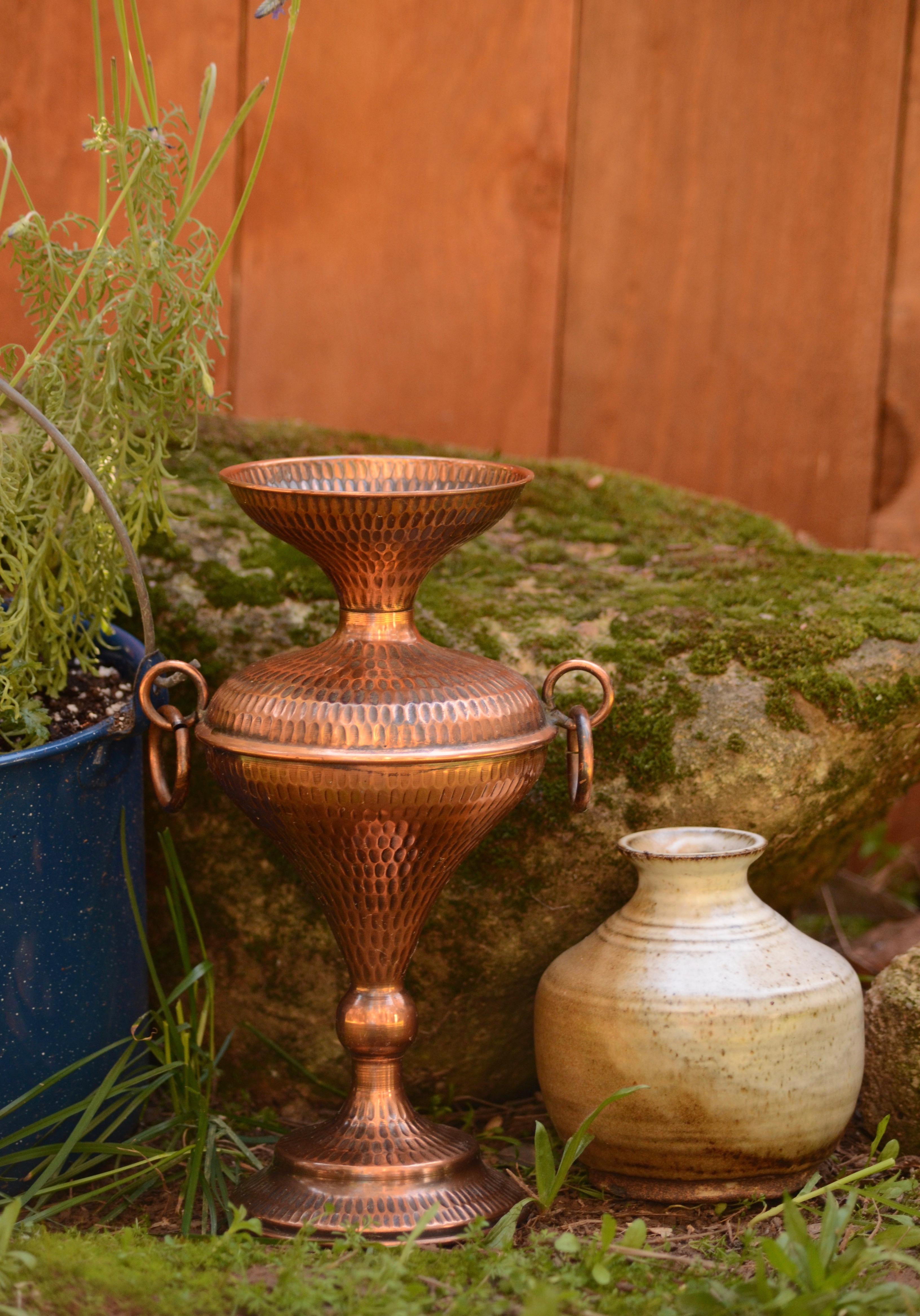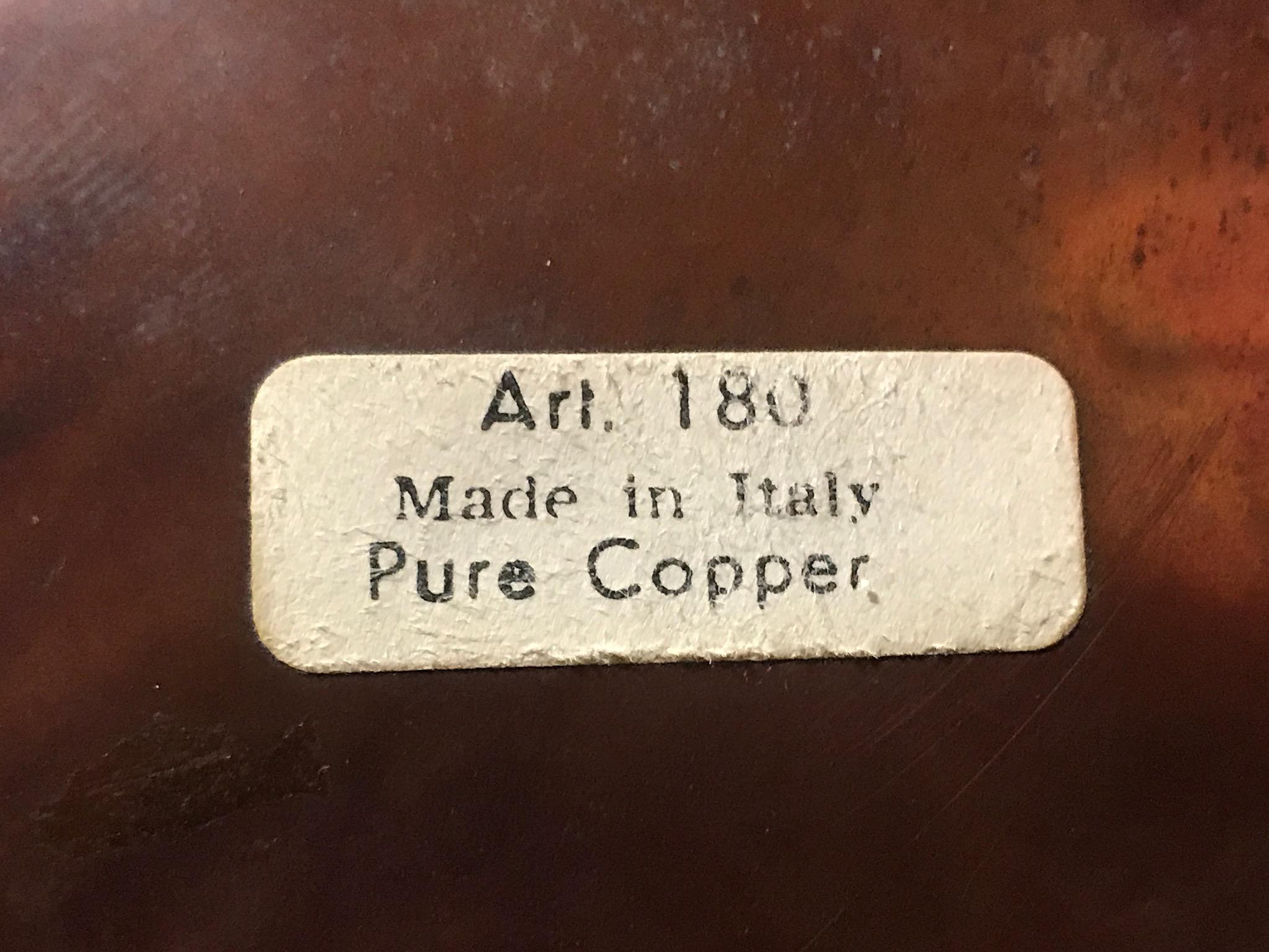 Hammered/stamped vase, date unknown, decorative rings, made in Italy, pure copper, a faint finger print is almost visible in the copper near the sticker stating art 180 made in Italy... I cannot find anything like this online to determine age or value. Please advise. Dimensions 10" tall by approximately 6.5" wide.