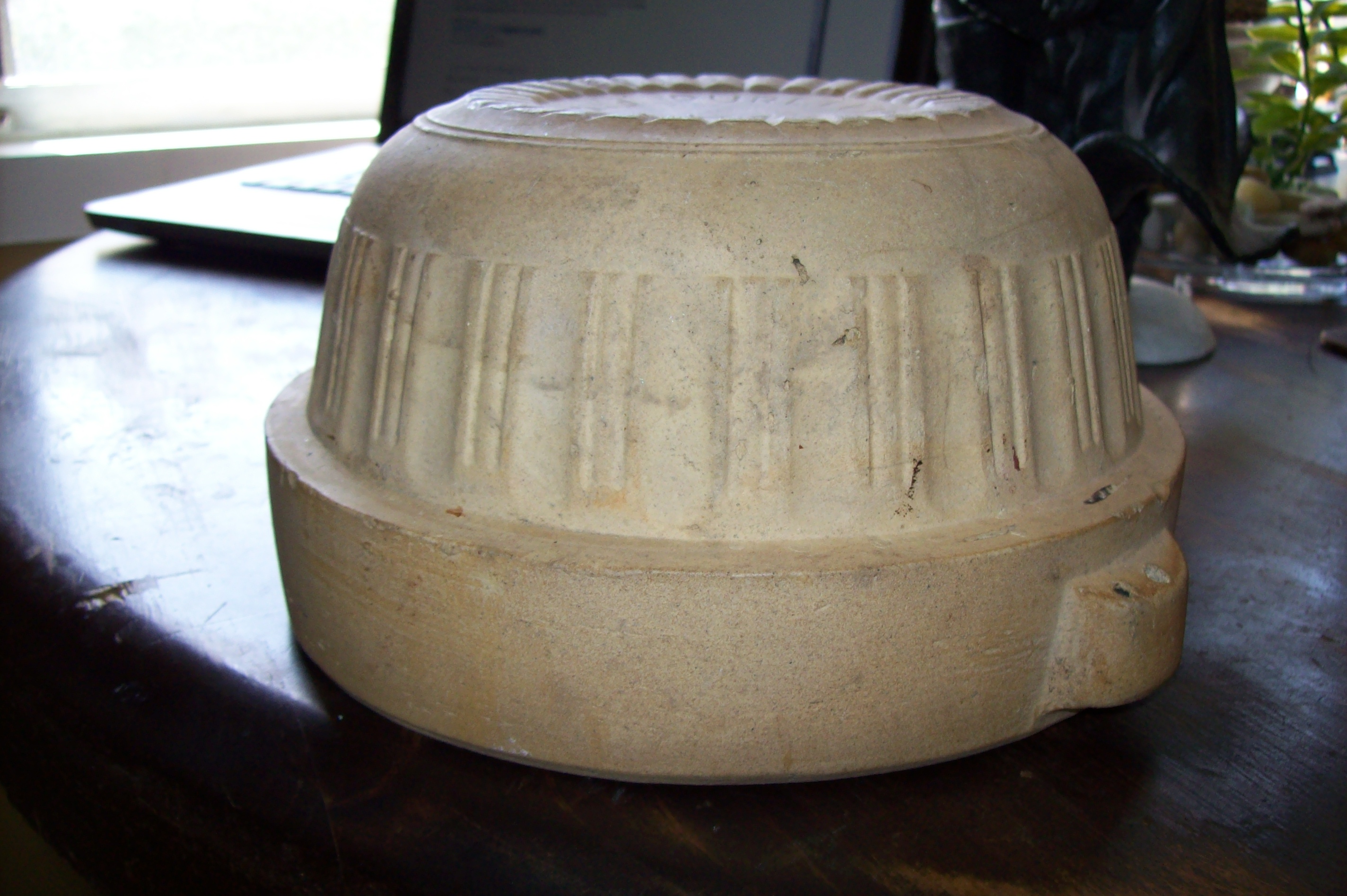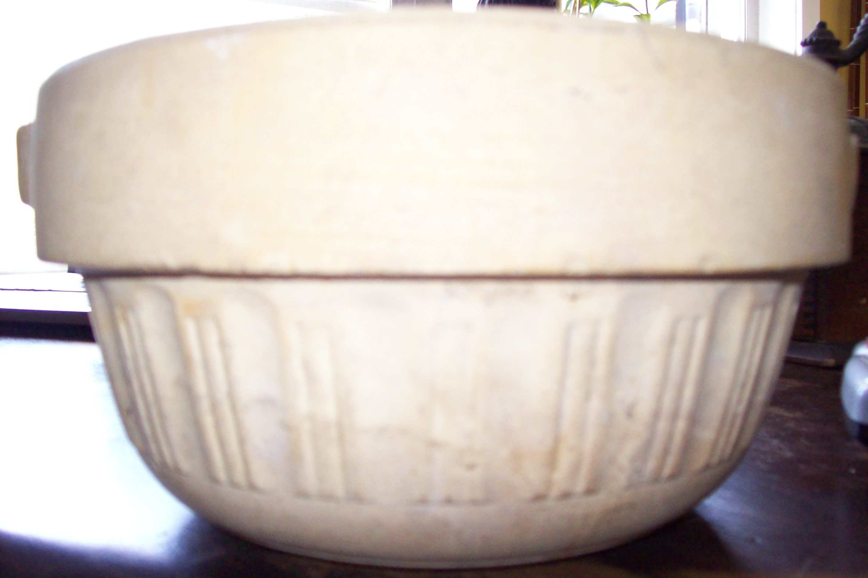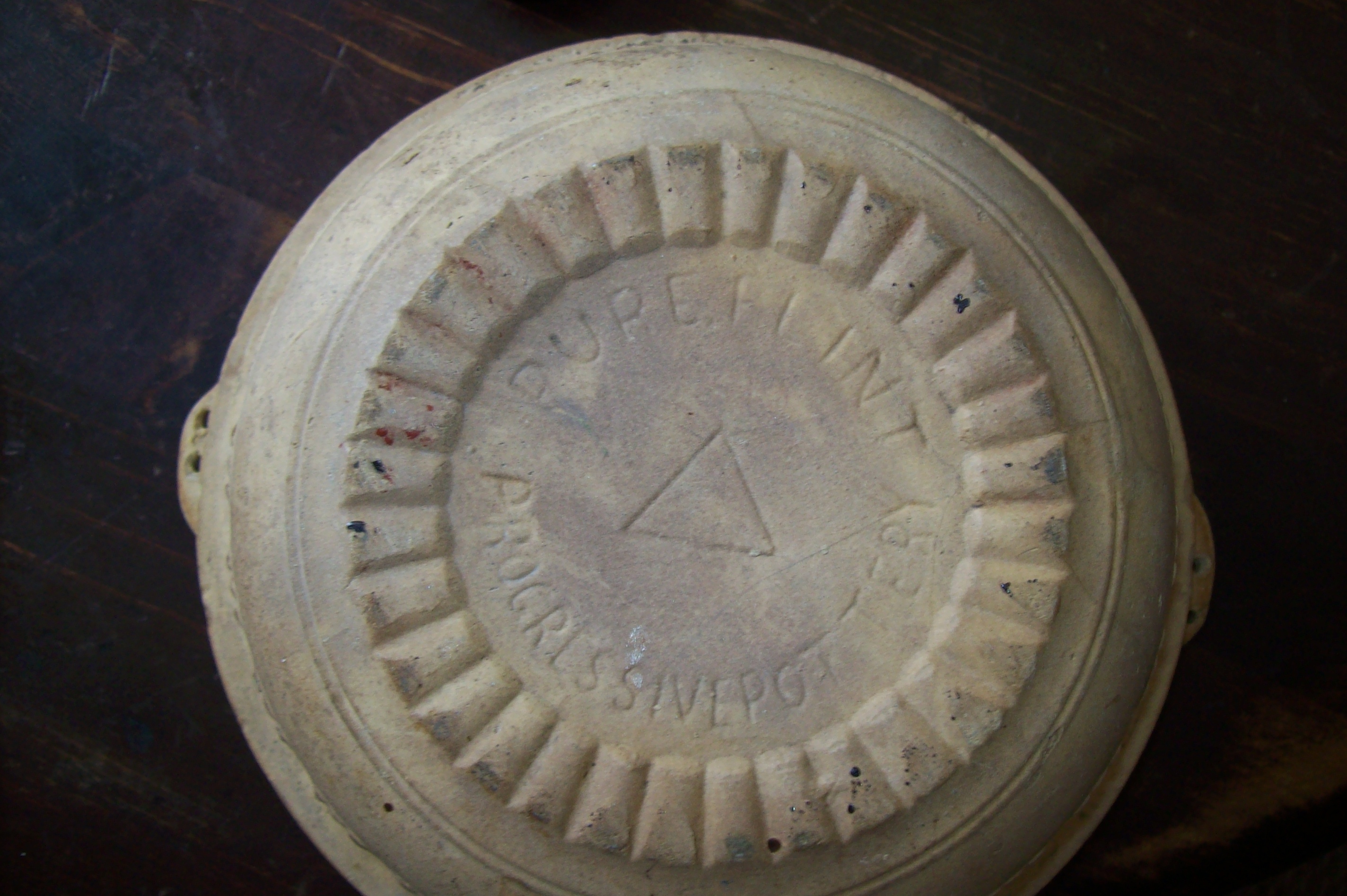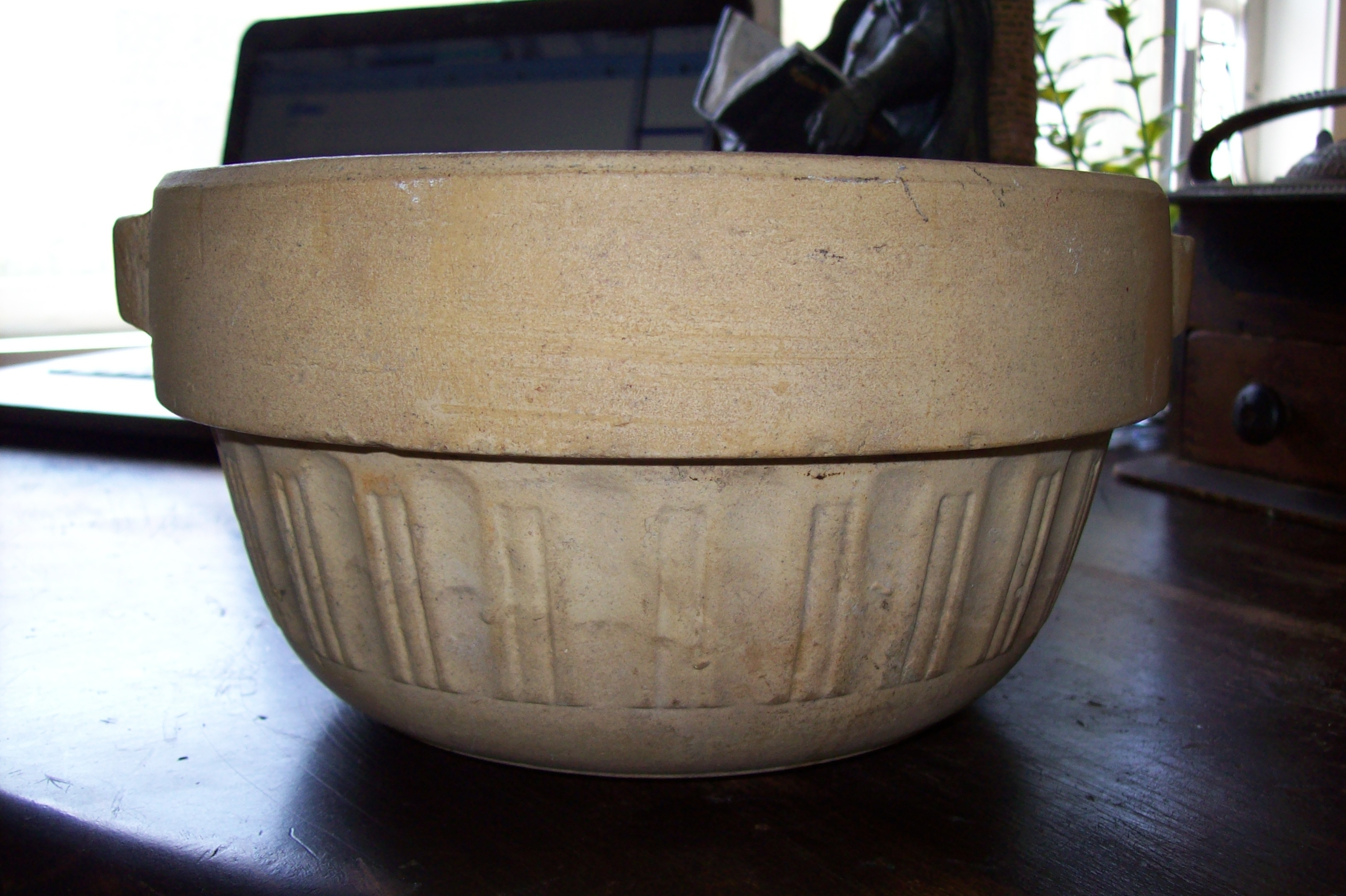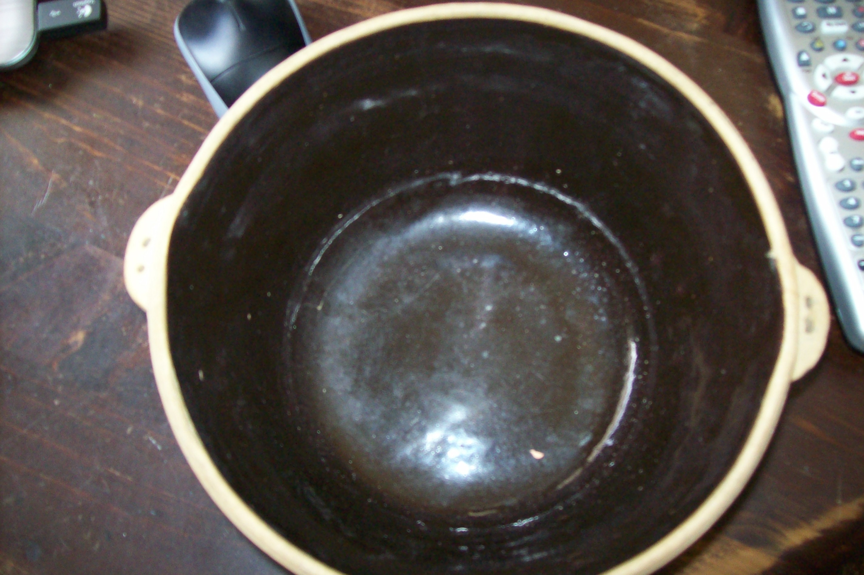 This is a tan pot of some sort the bottom is marked pure flint progressive potterythe inside has a very dark brown or black glaze to it very simple not much for frills
