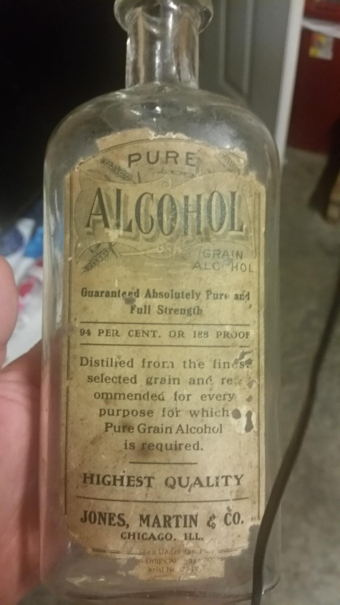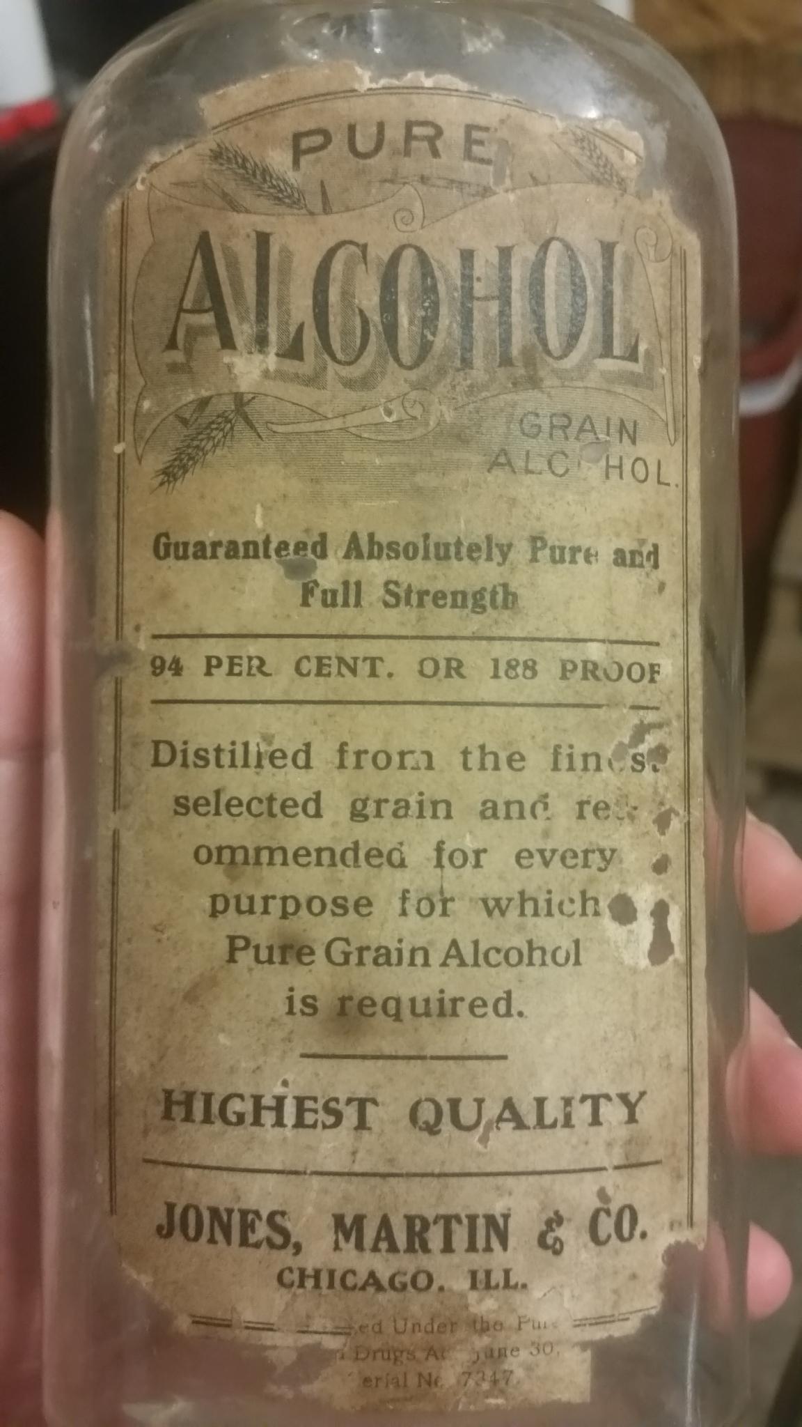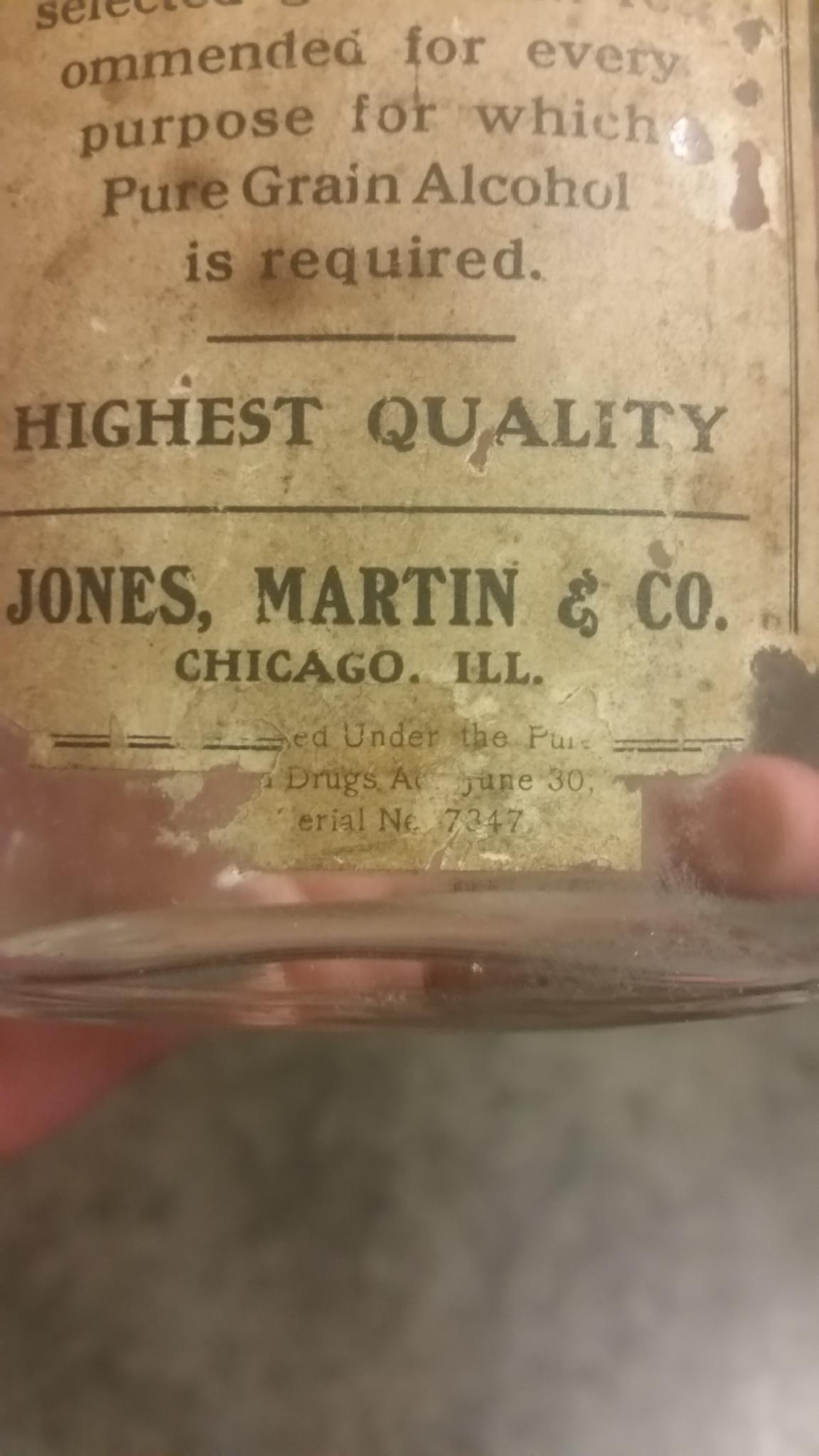 Pure grain alcohol bottled by Jones, Martin & Co. Chicago, IL with partial serial number sticker that says "bottled under the pure food and drug act of June 30 ----, Serial number -7347-. Any help anyone can give on this would be greatly appreciated.