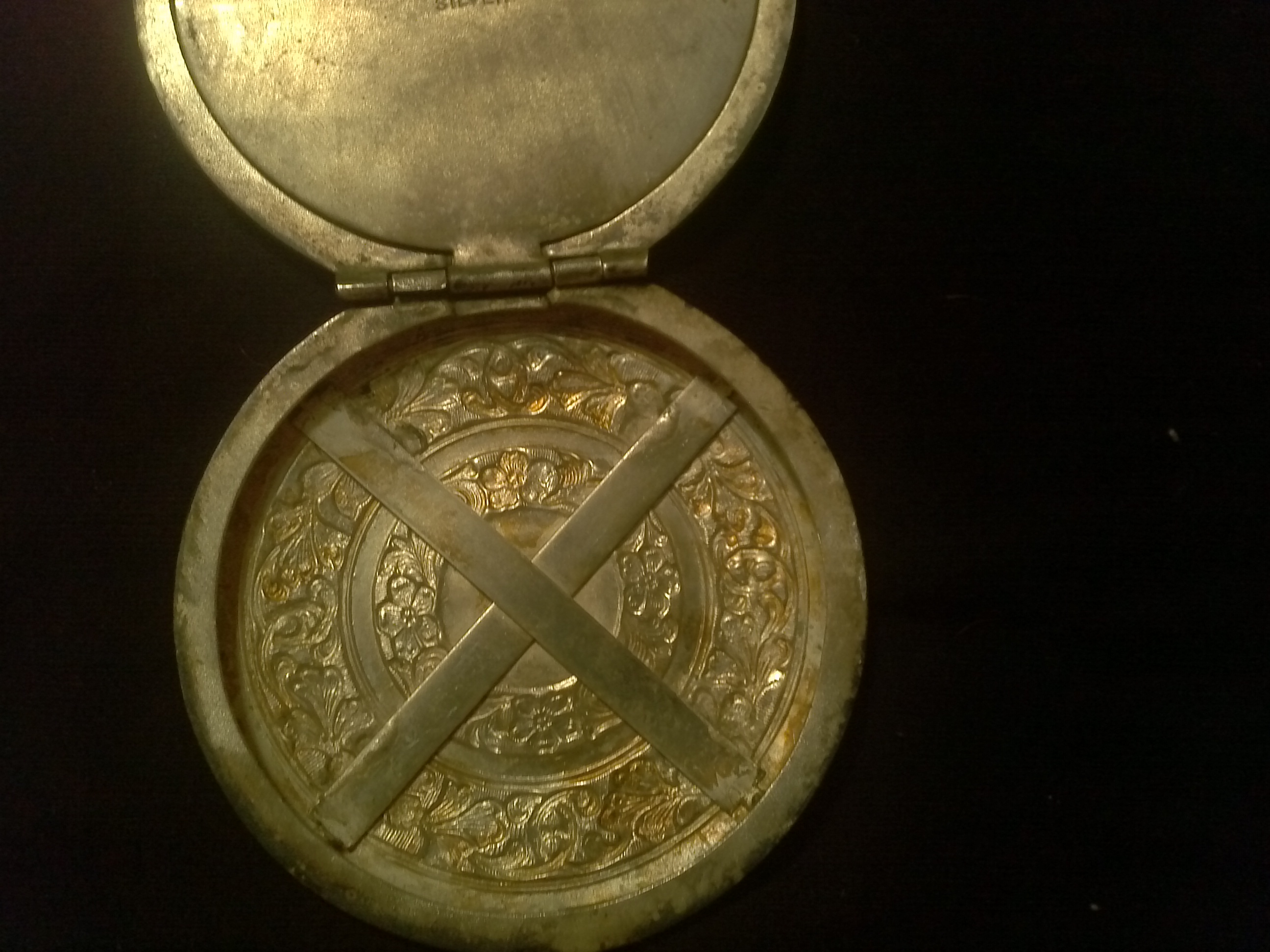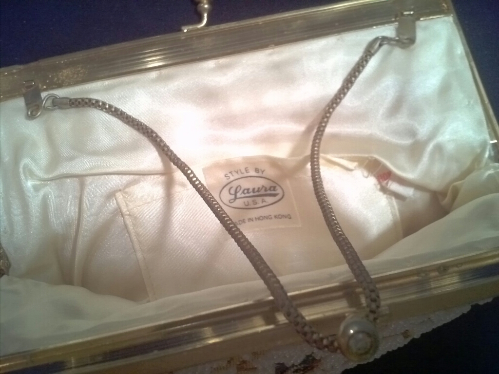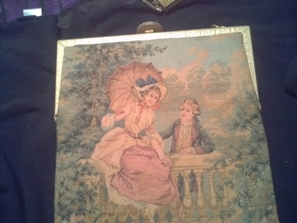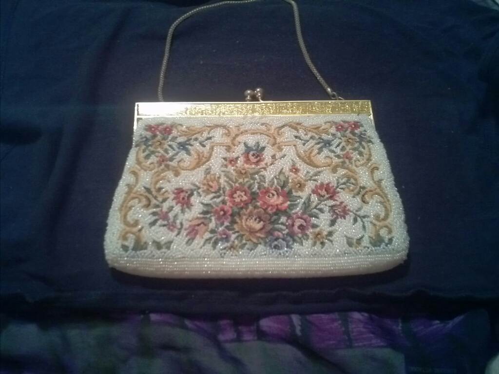 The first two purses are my mother inlaws they. the tapstry one was her grandmothers and the beaded one came from her aunt. my mother inlaw is 77. The silver one is a change compact from her grandmother. One side of the clasp is broke. it is from Germany.