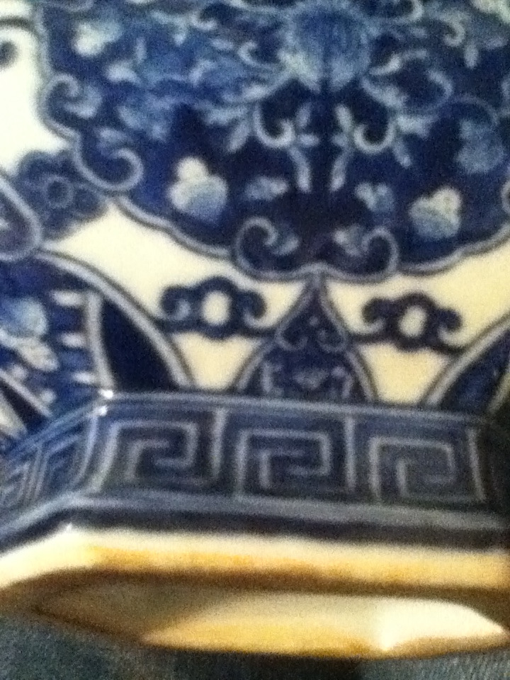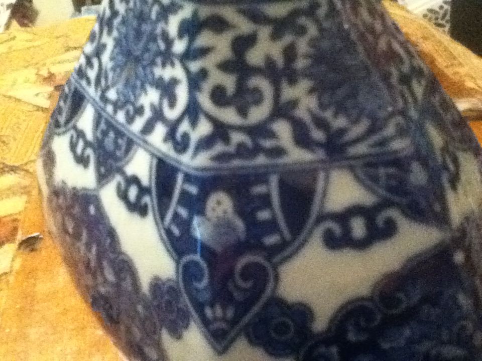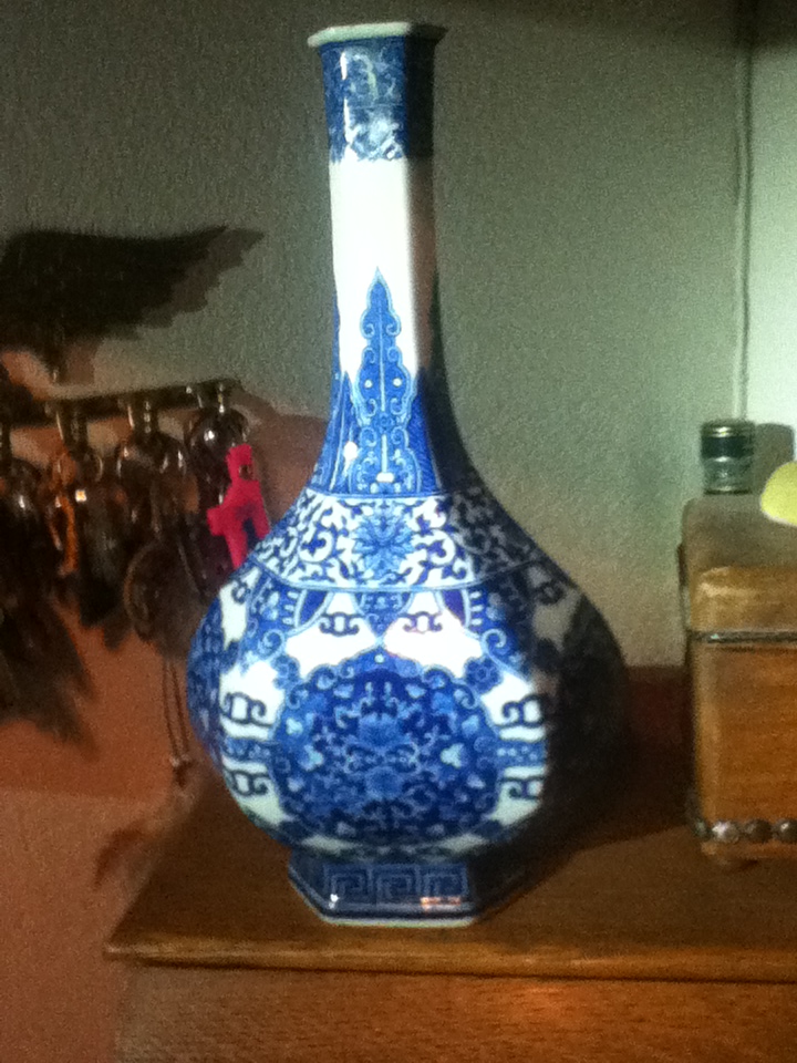 I do not have all the dimensions of this vase as it is at my mother's house. However, I can get them and send a follow-up email with all the information. Whatever information as to the authenticity and possible value of this piece without the above imformation would be greatly appreciated at this time. From what I understand, this vase has been in our family for a very long long time. It is a blue/white porcelain vase with hexigonal top and bottom. It has a mark on the bottom which looks to be from the Qing Dynasty, Qianlong Period. It is on a removable carved wooden base. Exquisite detail. I can provide better quality photos, as well as, the dimensions if needed. It is a nice size vase and heavy. Sorry for the lack of detail here but, I just wanted to get any info available at this time. Thanks so much for your time and I hope to here from you soon. Photos are attached.