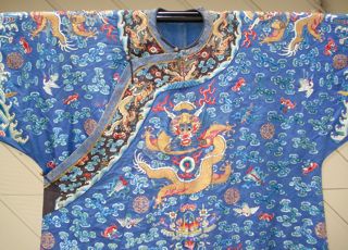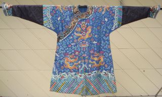 Qing Dynasty Chinese Emperor Robe in Good to Very Good condition. Hand sewn, gold thread, made of silk. Only a few minor areas that will need restoration. Slight fraying of silk on about 1/8" on each sleeve edge, very minimal soiling around the bottom, one 1/4" hole in fabric, a few strands of gold thread pulled out from one of the main dragon designs.