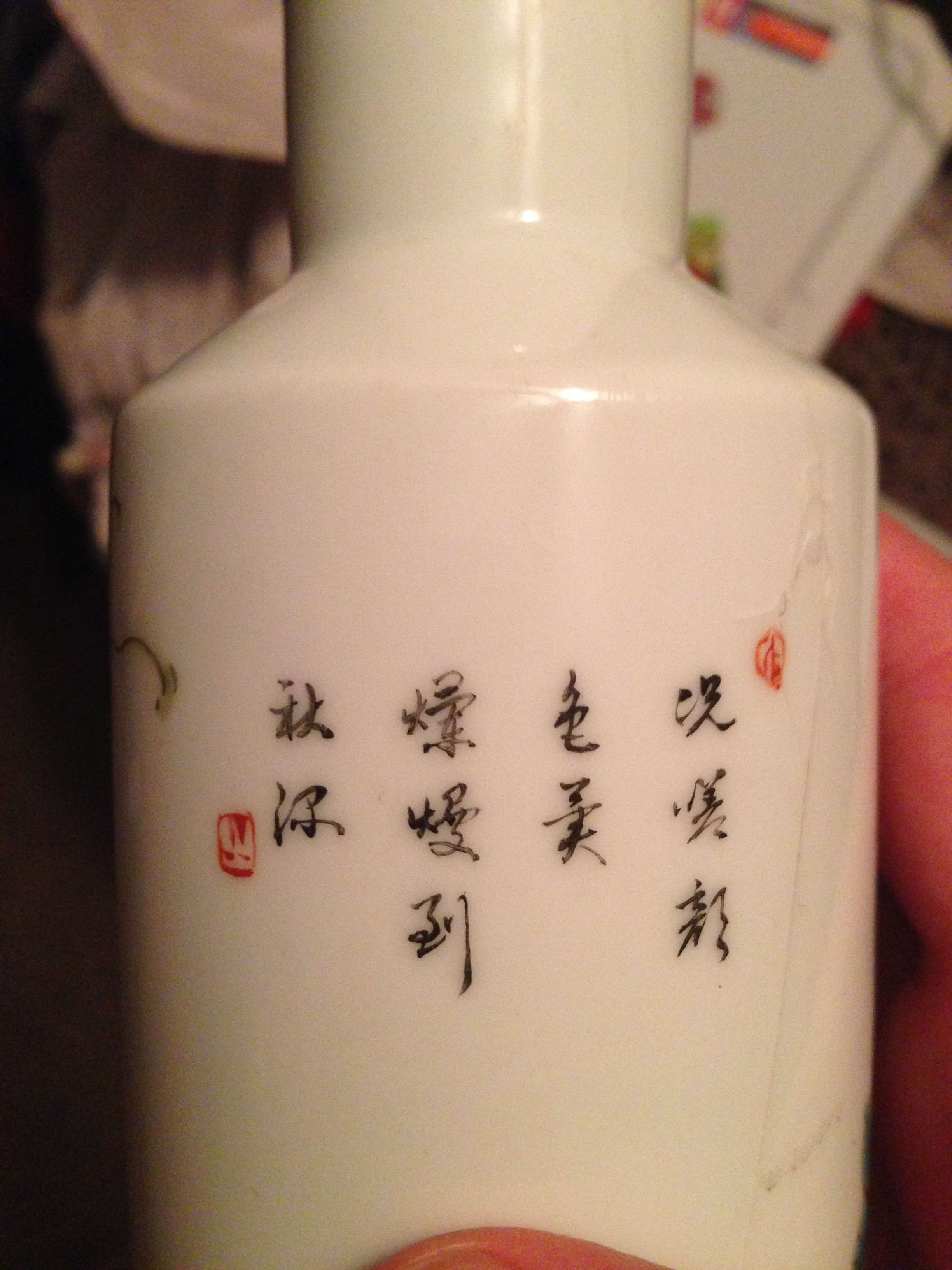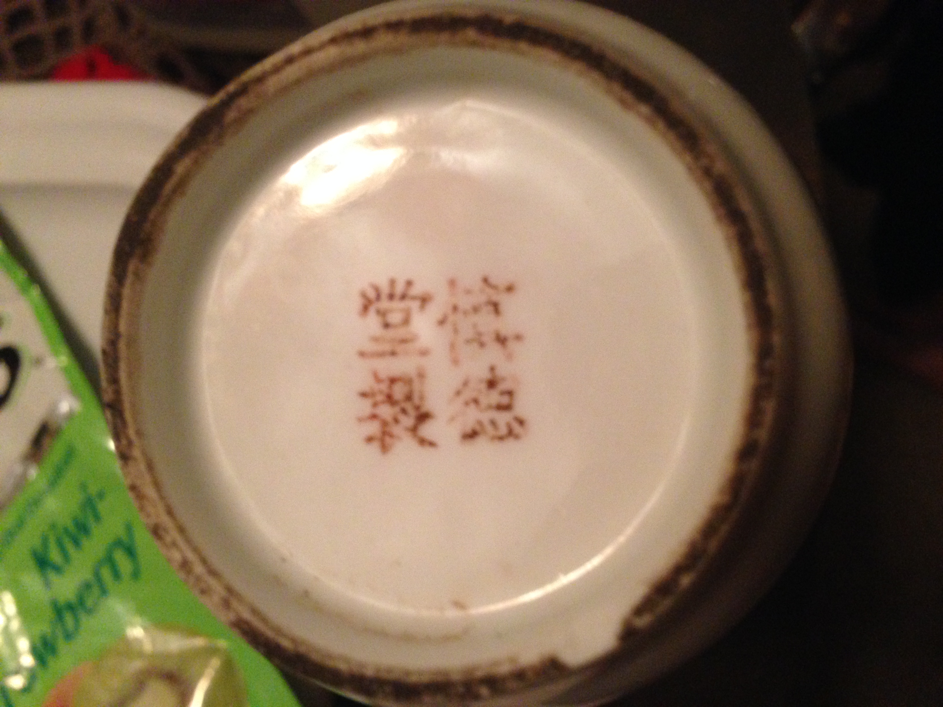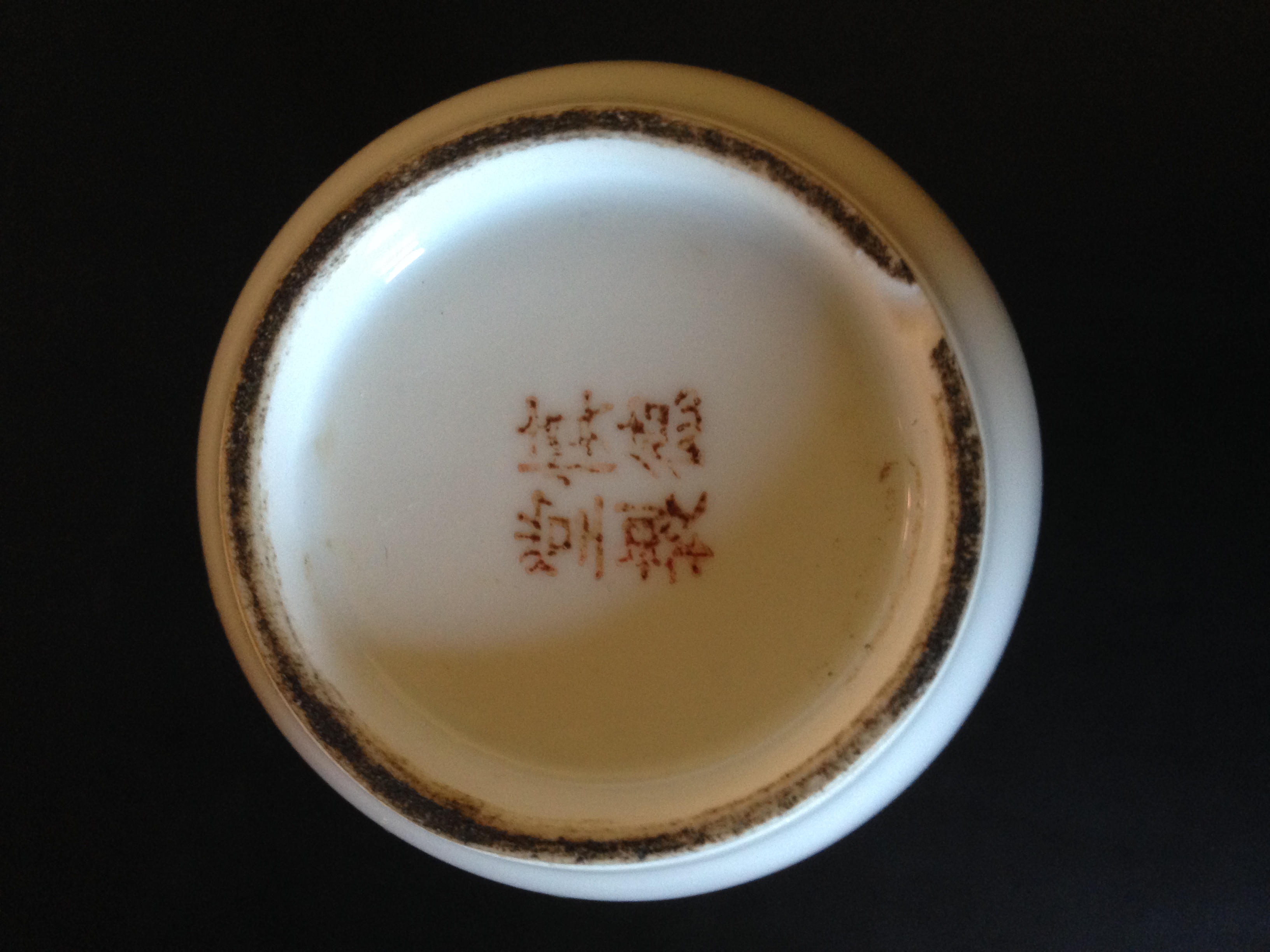 This vase appears to have an apocryphal 20th century mark of "Shendetang Zhi" (慎德堂製 - "Made for the Hall for the Cultivation of Virtue"). Shendetang had been a residence and administrative hall at the Summer Palace near Beijing from the Kangxi reign (1662-1722) before being razed by foreign troops in 1860. Porcelains made for the hall were entirely handmade and decorated to imperial quality standards. This mark looks like it was stamped on.