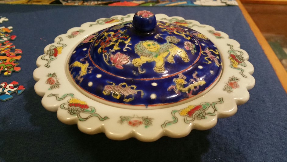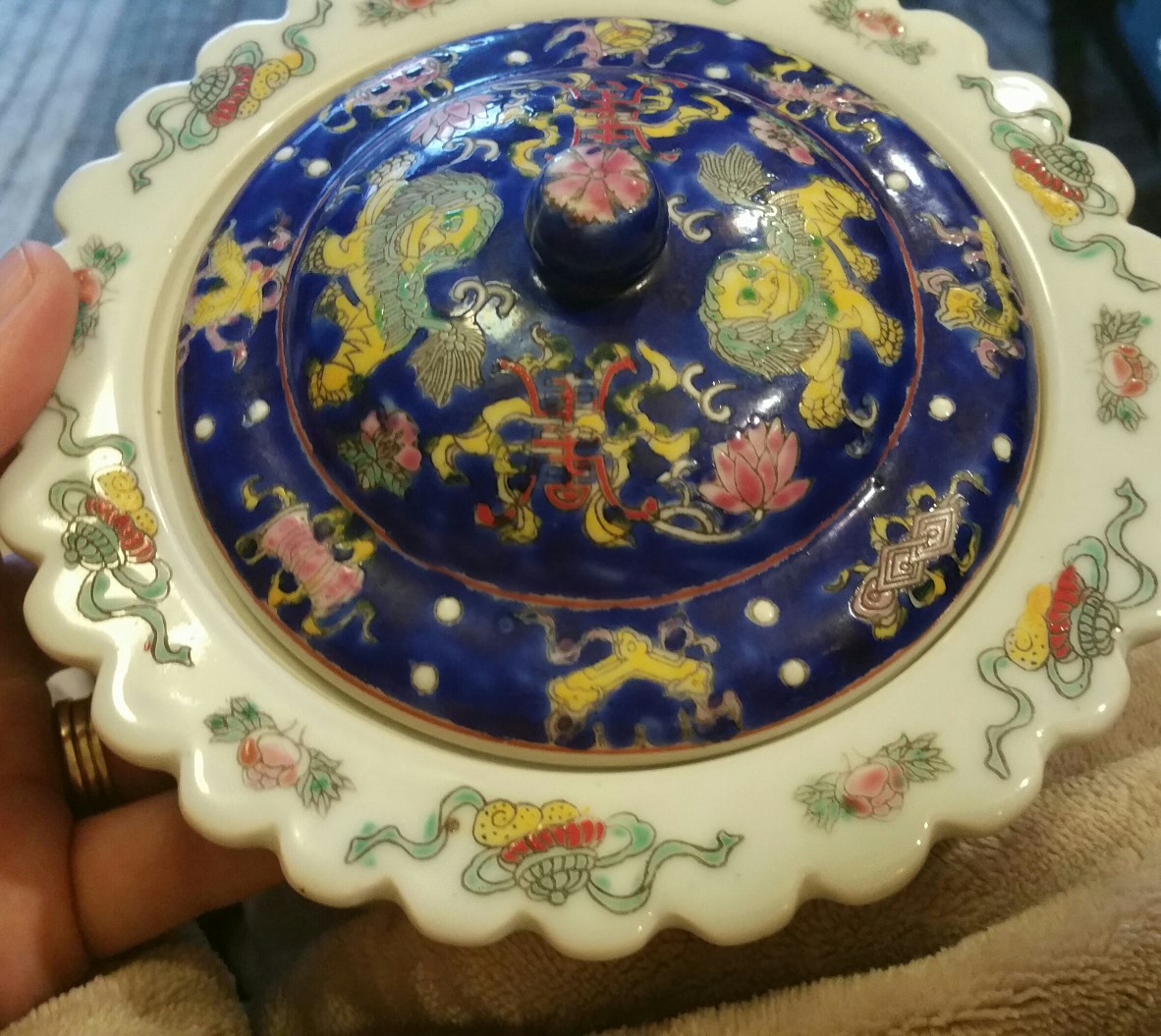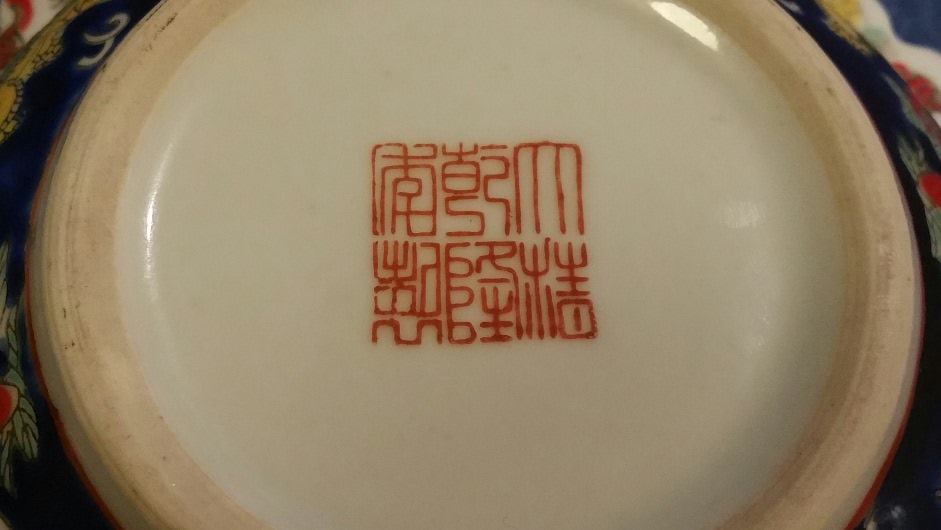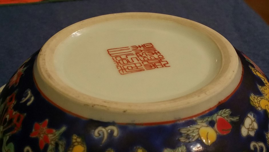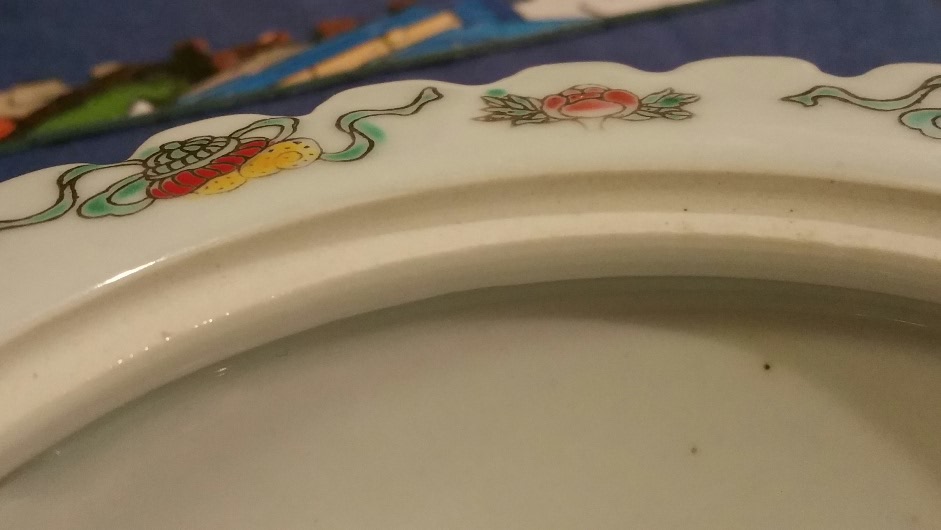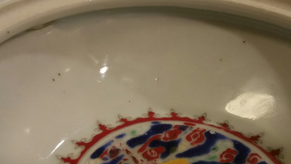 Hello. My name is Nicole and I am a newer collector of Asian porcelain items. I came across this bowl at a resale store and I'm hoping it is something really special. My research of the backstamp indicates it is Qing Dynasty with a Qianlong mark. The colors seem appropriate as does the subject matter. However I am unable to find anything with a painting inside like this. I also fear how clean the edges are for its supposed age. I read somewhere that the iron dots in the porcelain matter, but I'm not sure if that's what I'm looking at.