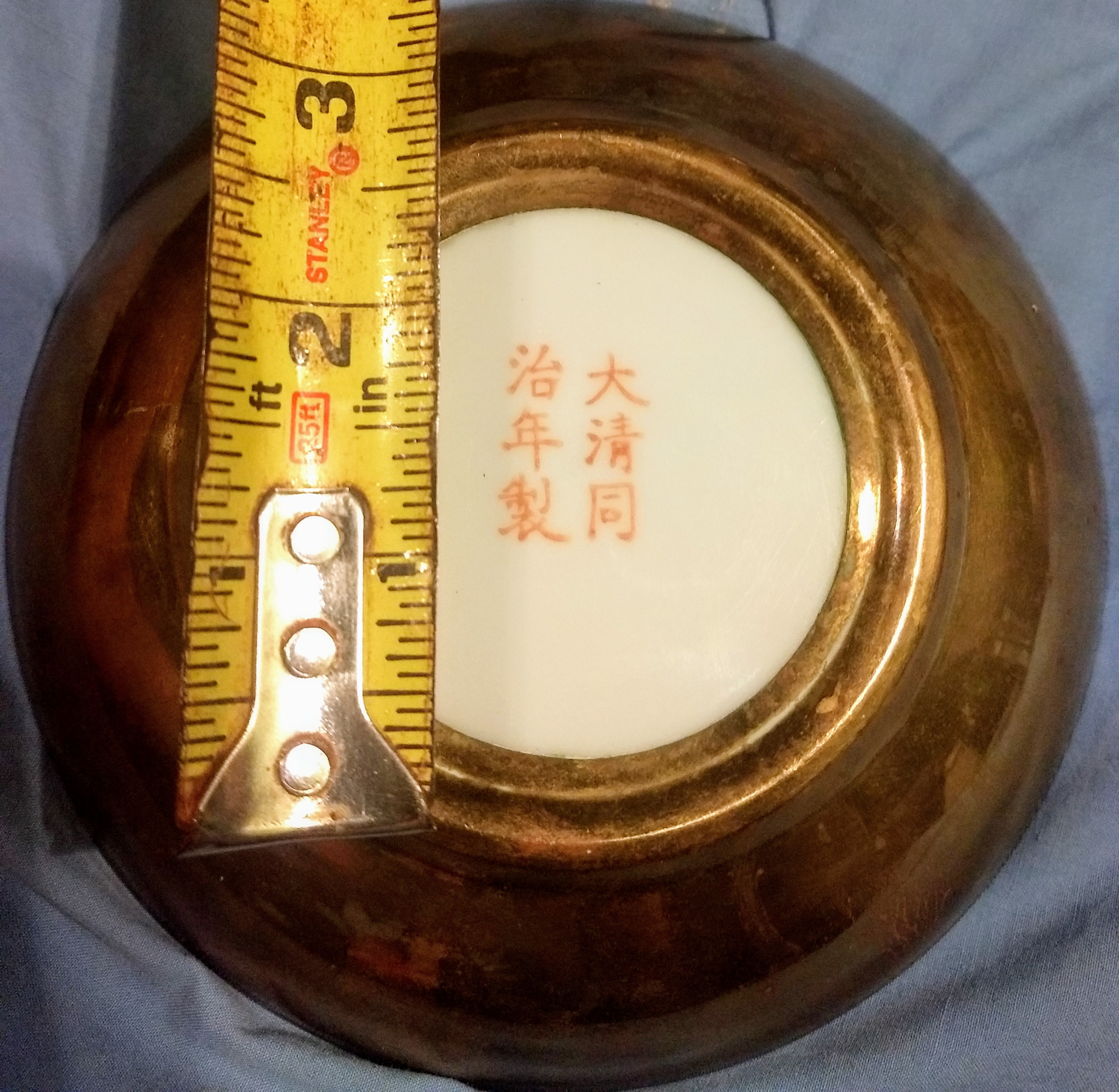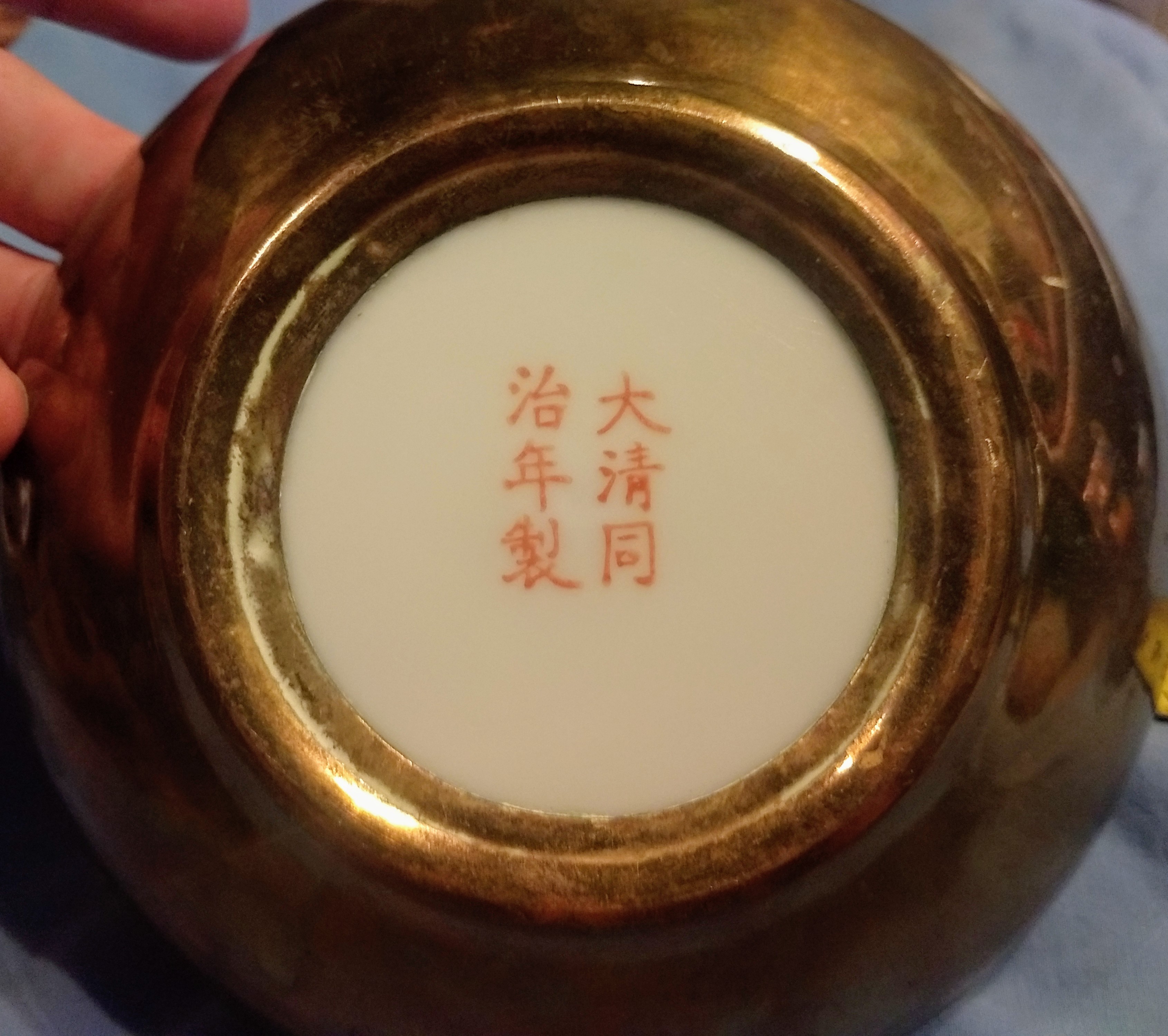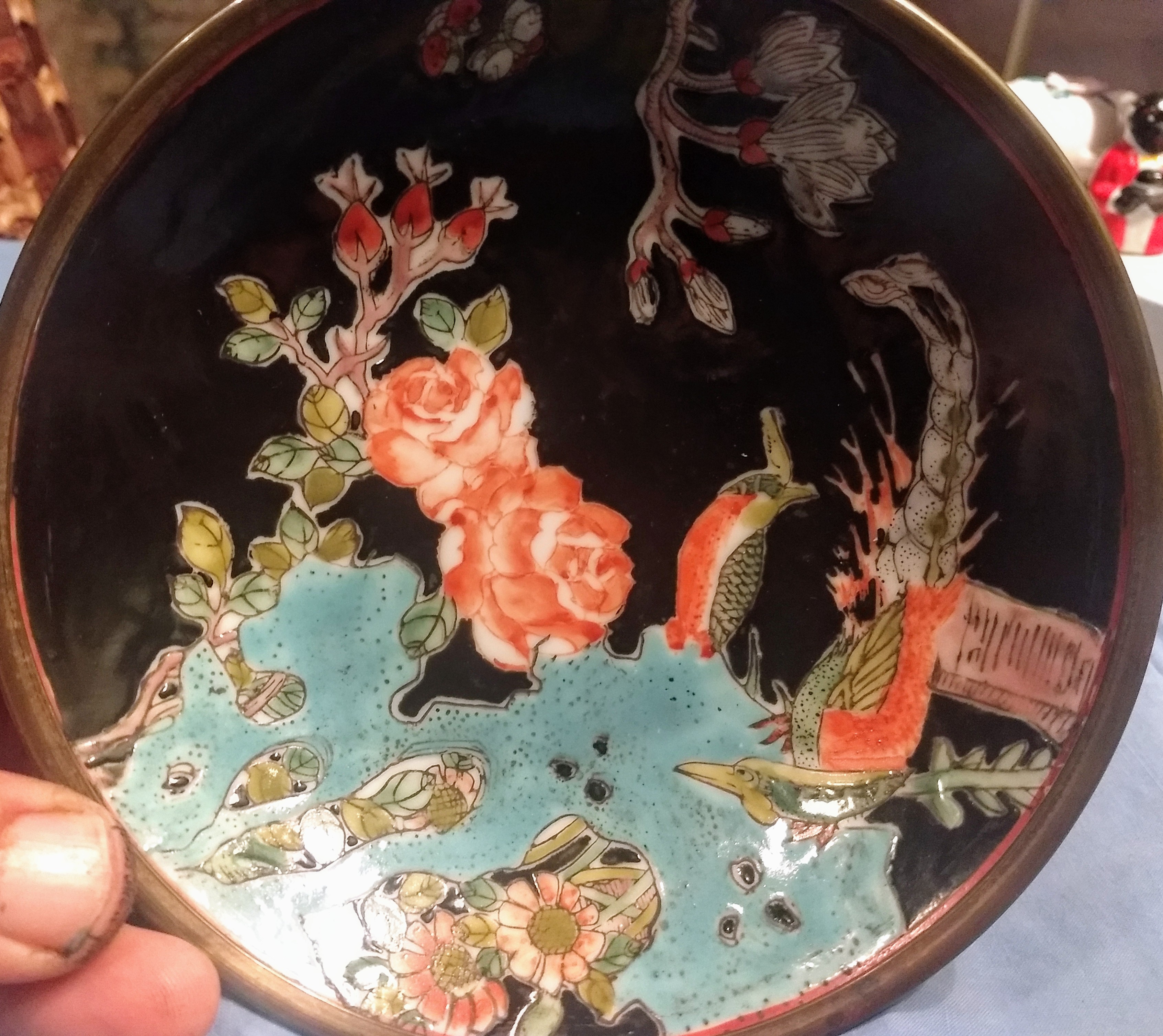 Qing Dynasty tongzhi era mark, famille noire - bronze encased dish. Enamel is in beautiful condition, the entire dish is. 1.5" deep, 5.5" circumference. I found this dish at a second hand store that takes donations from the area. I paid $1, and am really hoping to find a value, I have heard these dishes were given to people by the emperor and later the family would encase in bronze, to protect from damage. I thought it looks like brass, but was told different. Cannot find anything like it in the Tongzhi Era, only one encased from a different emperor that auctioned at 5k...please enlighten me, thank you