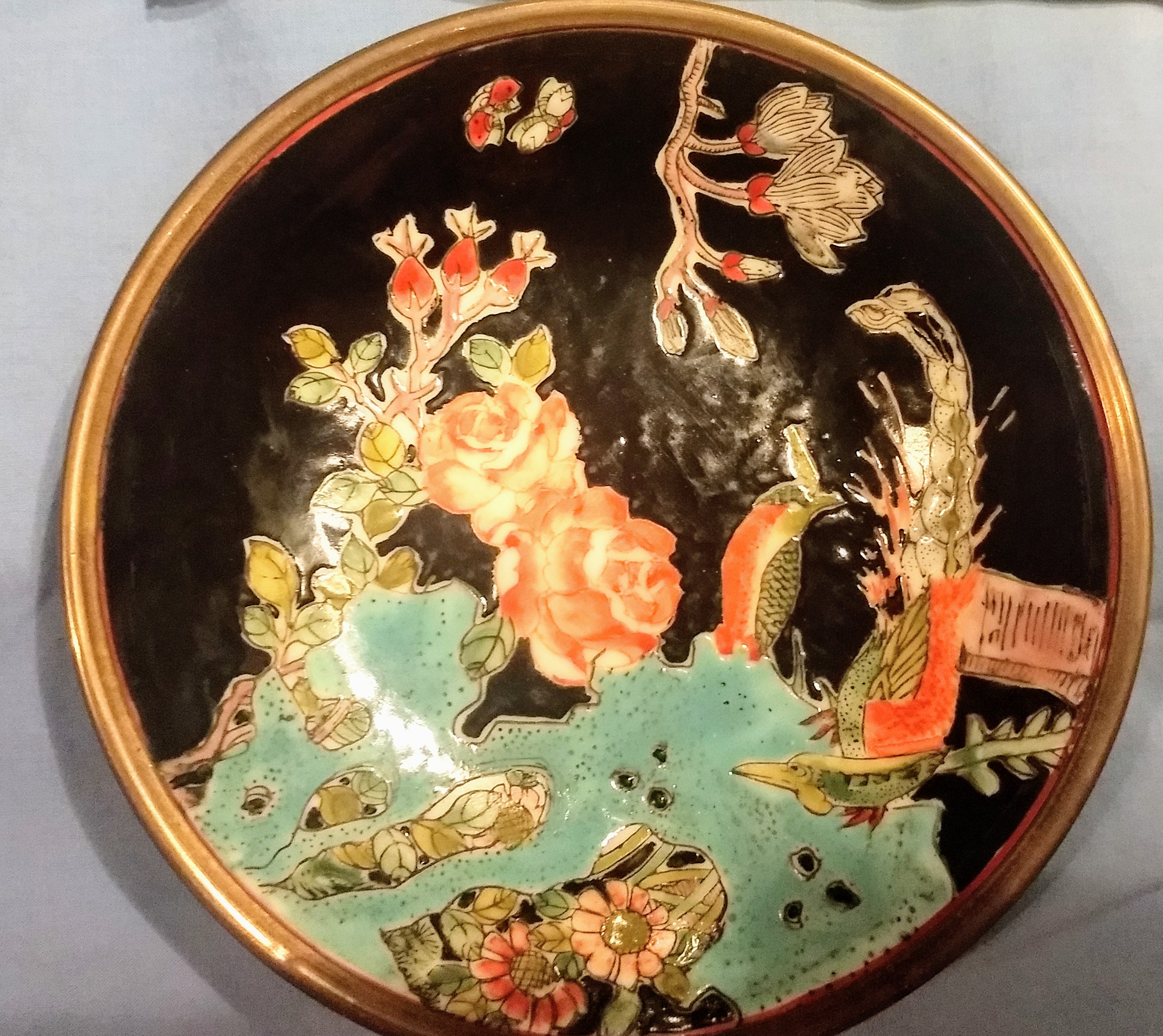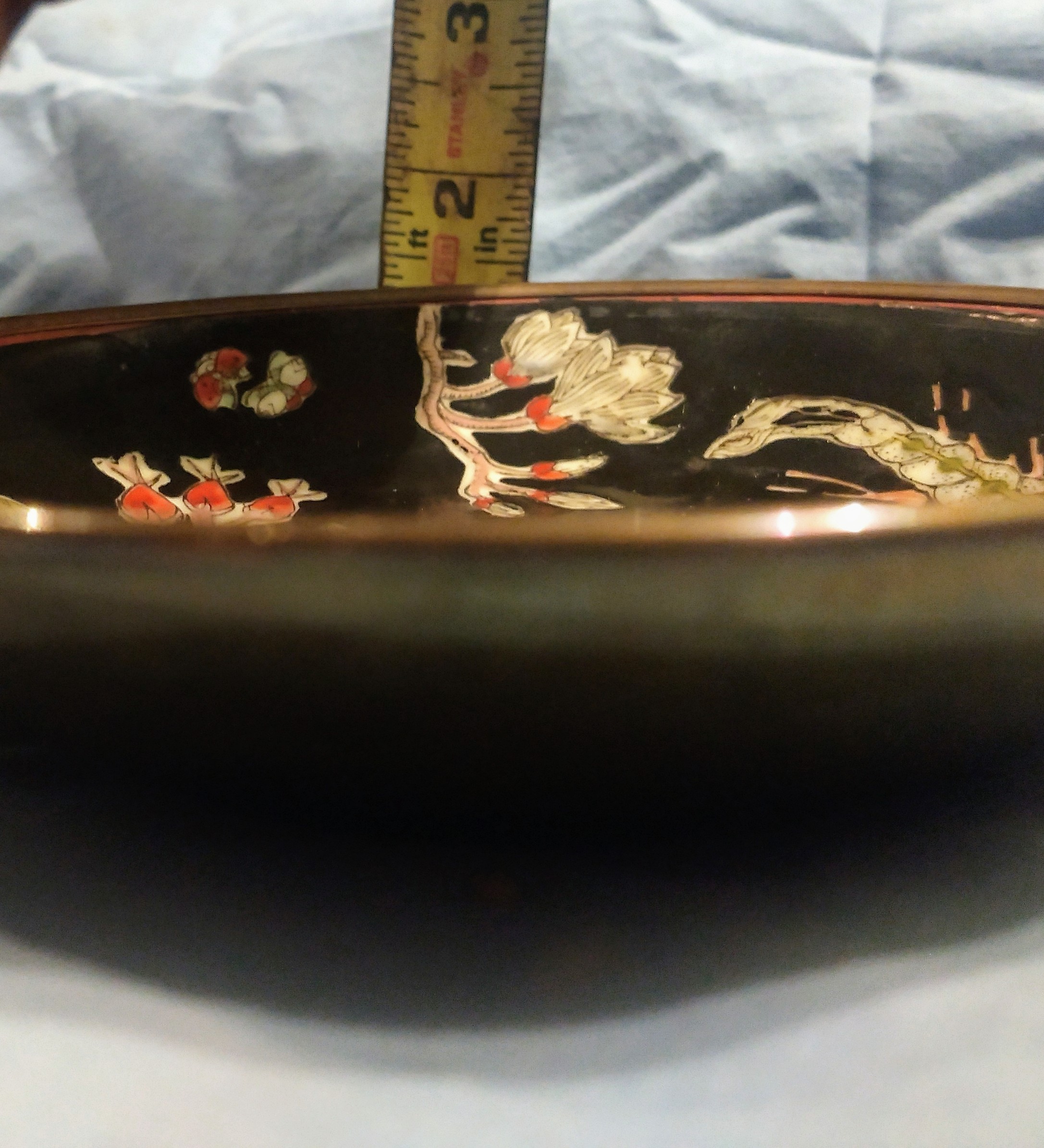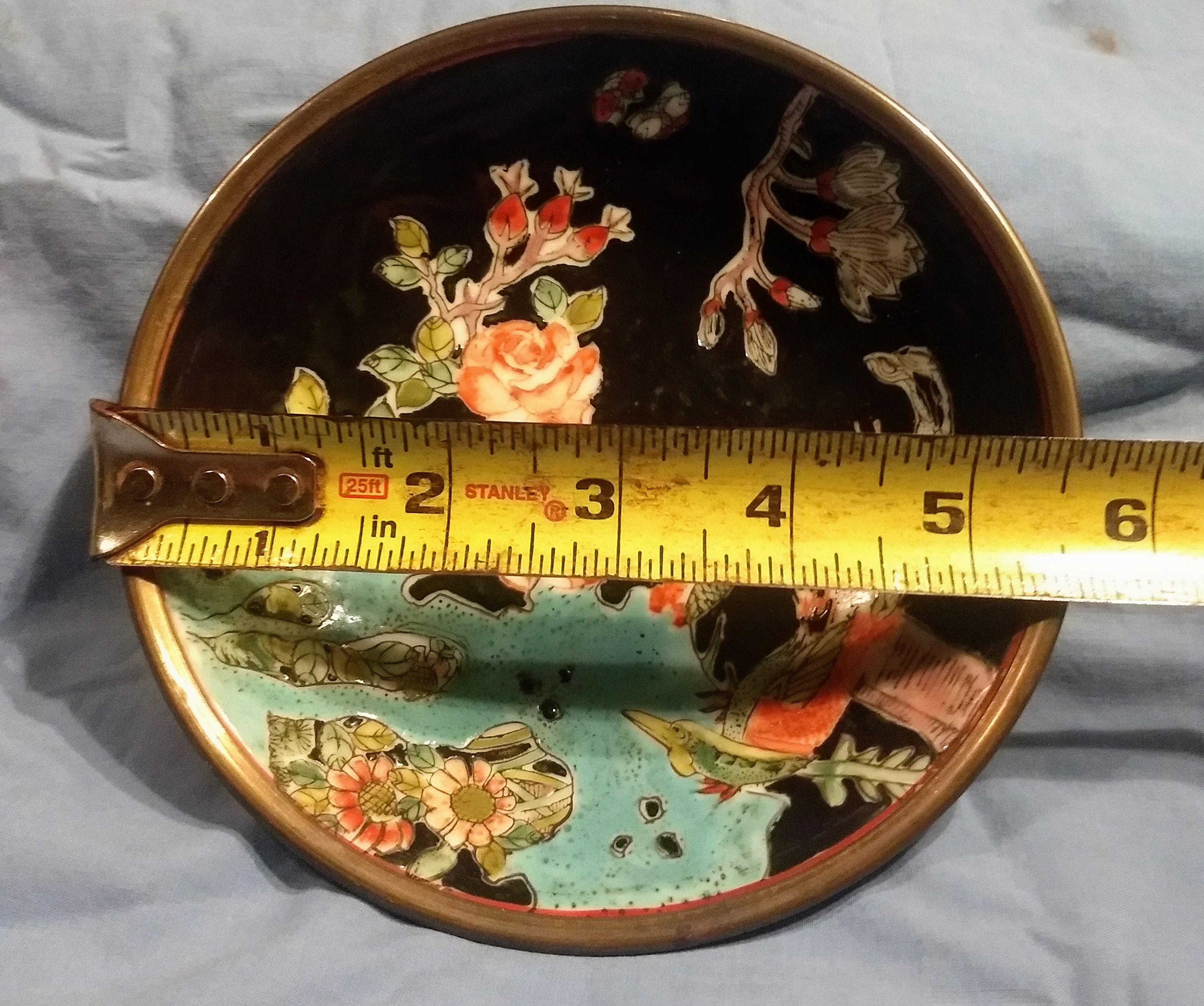 Qing Dynasty tongzhi era mark, famille noire - bronze encased dish. Enamel is in beautiful condition, the entire dish is. 1.5" deep, 5.5" circumference. I found this dish at a second hand store that takes donations from the area. I paid $1, and am really hoping to find a value, I have heard these dishes were given to people by the emperor and later the family would encase in bronze, to protect from damage. I thought it looks like brass, but was told different. Cannot find anything like it in the Tongzhi Era, only one encased from a different emperor that auctioned at 5k...please enlighten me, thank you