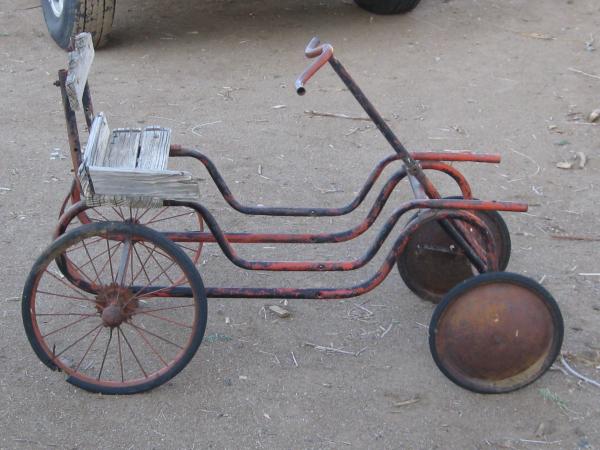 light gauge steel tubing frame wooden seat sits to riders soap box type tires/wheels on front steel spoke with solid ruber tires on rear chain and sproket foot pedal powered handle bar steering front end may have a basket not sure color orange kids quad cycle