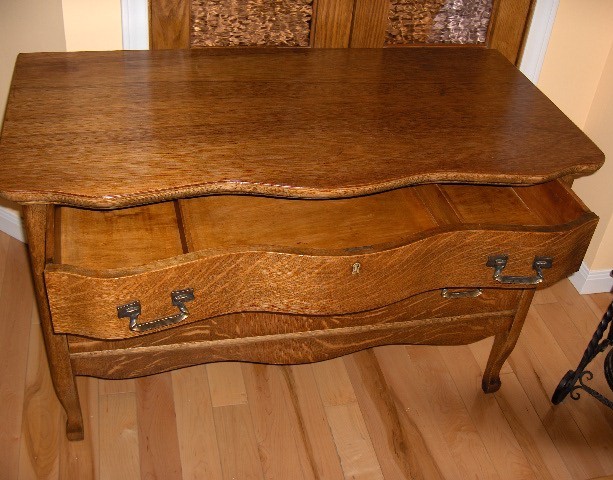 The 2 drawers have a bow front that shows the beautiful grain pattern of the quartersawn tiger stripe oak. Or is it perhaps curly oak? It is constructed with dovetail joints. There are 2 nice brass keyholes, the key is missing. There are several stress marks on the top, not distracting at all, and a slightly darker are that we could almost but not completely hide as there was a water mark. Again, it is really not distracting from the overall beauty. The original handles had been replaced with new ones, we will have to find better ones, these will have to do for now.