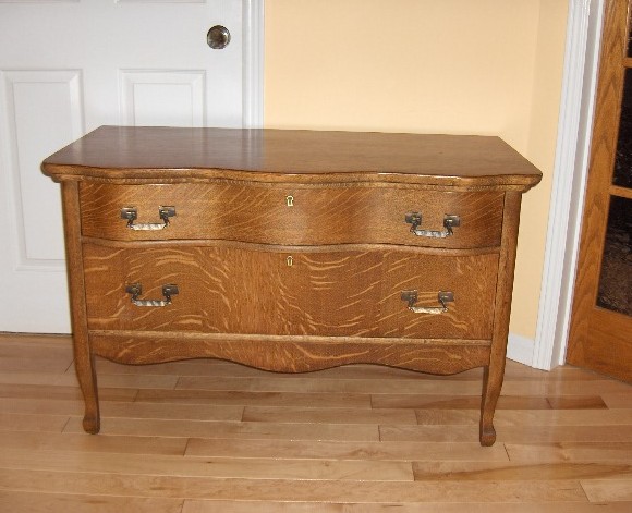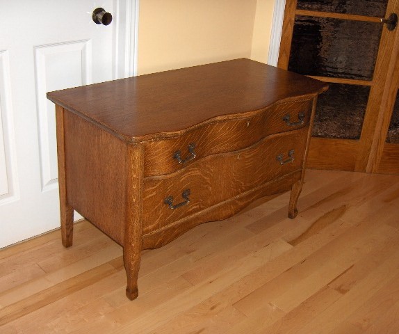 we just stripped and refinished a now very pretty looking 2 drawer low boy oak veneer dresser.