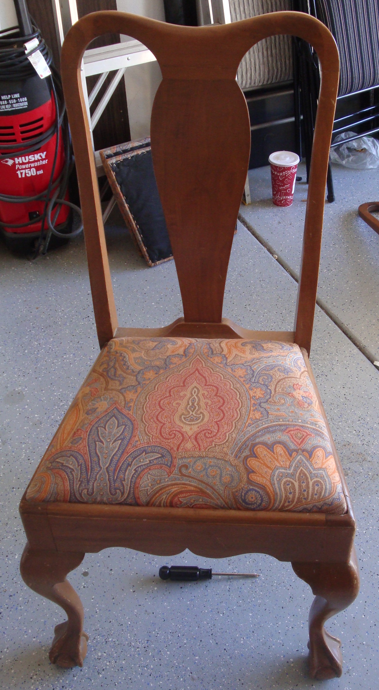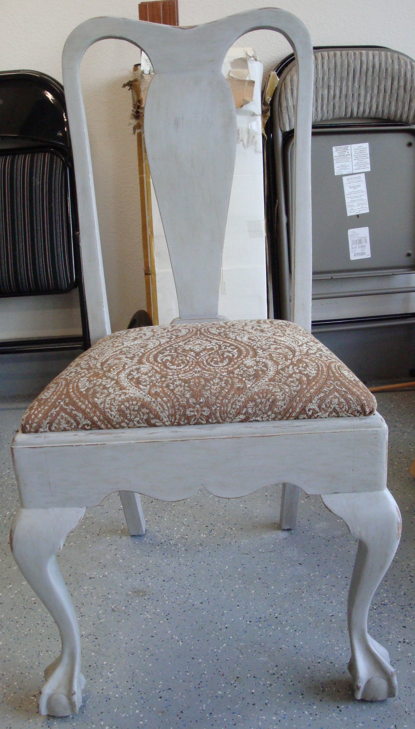 4 Queen Anne style chairs. They have been stained and have been reupohlstered several times and plastic protectors have been added to the feet. Two of the chairs have had to have 2 of the 4 seat support pieces replaced but everything else is original. It also looks like it was had carved because not every curve is the same. I am just curious as to when they were made and what they would have been worth. I have since painted and reupohlstered them to resell. I paid $80 for all four of them. There are no markings but the lady I bought them from said she had dated them from around the 1700's by searching online.