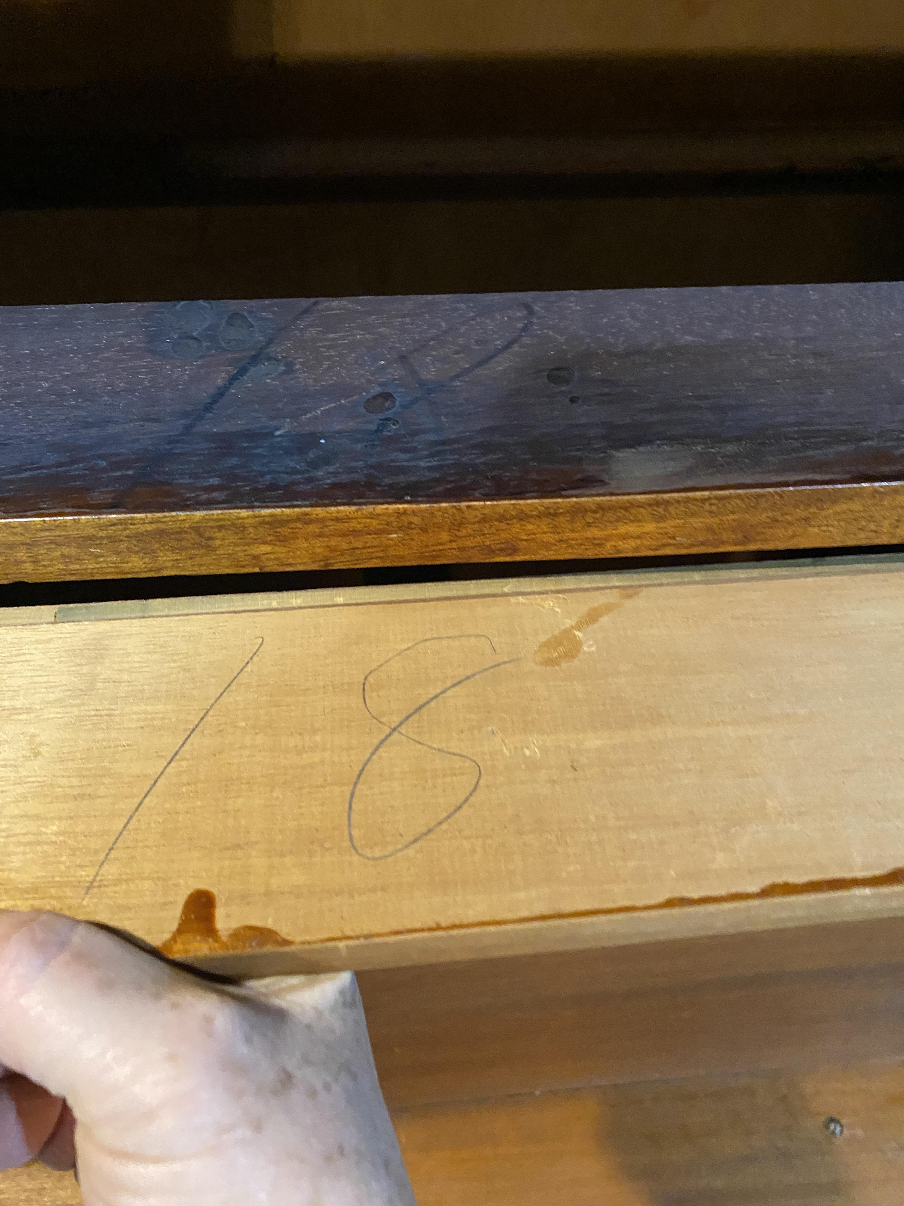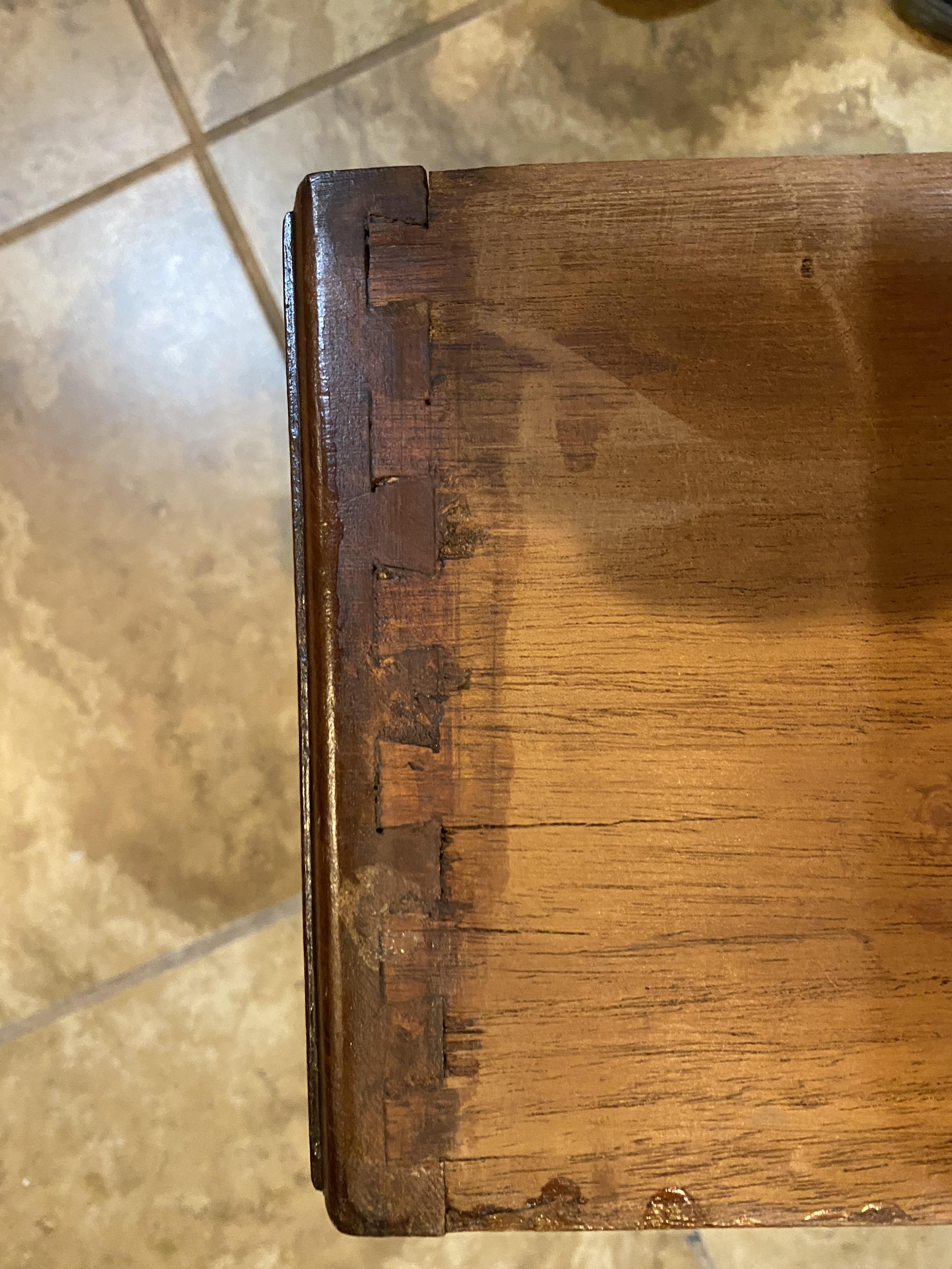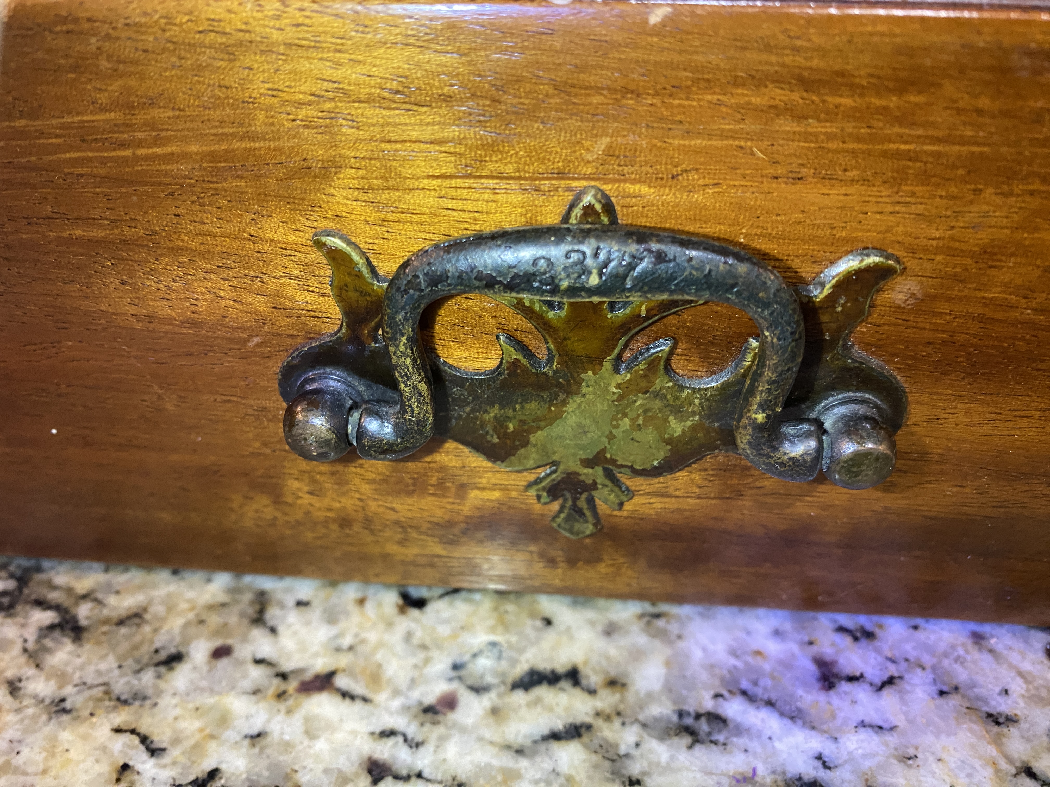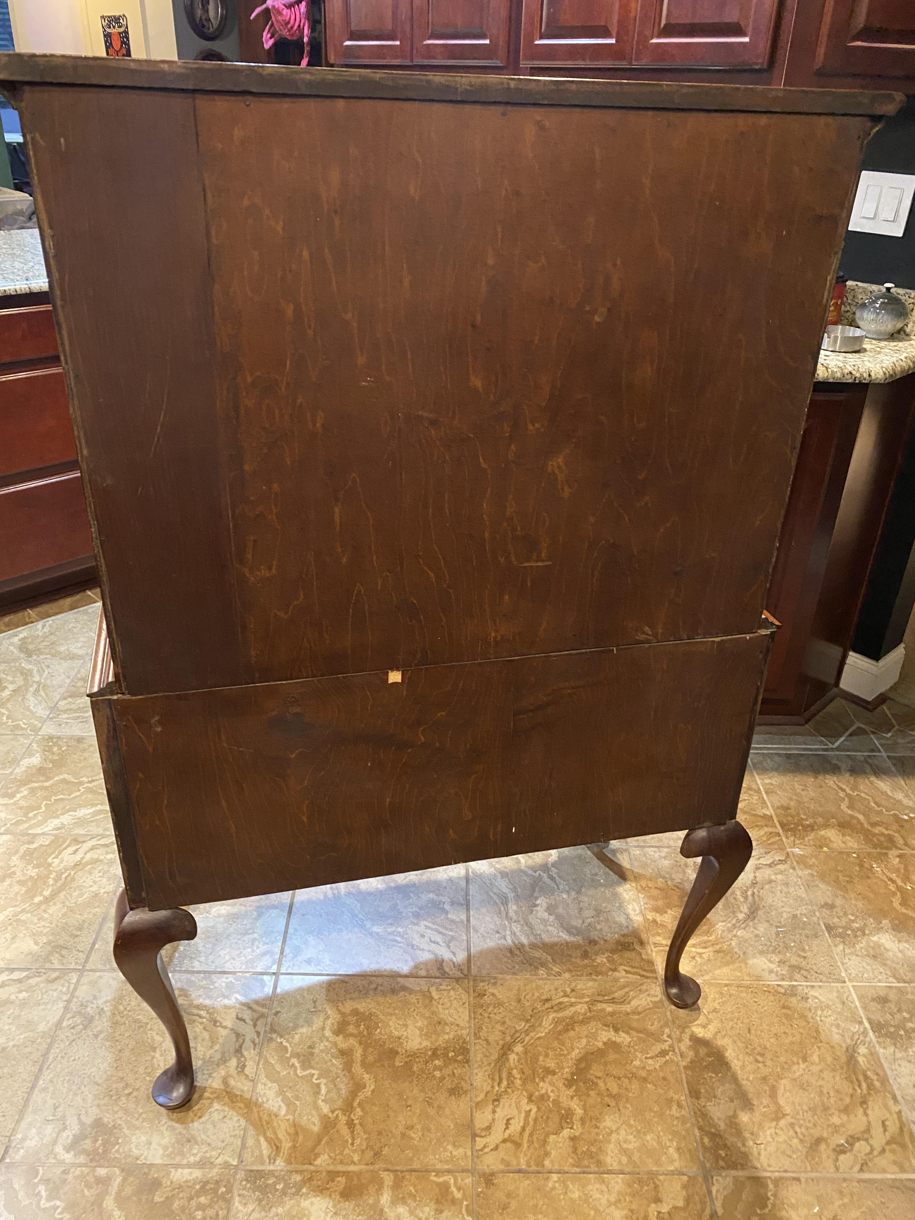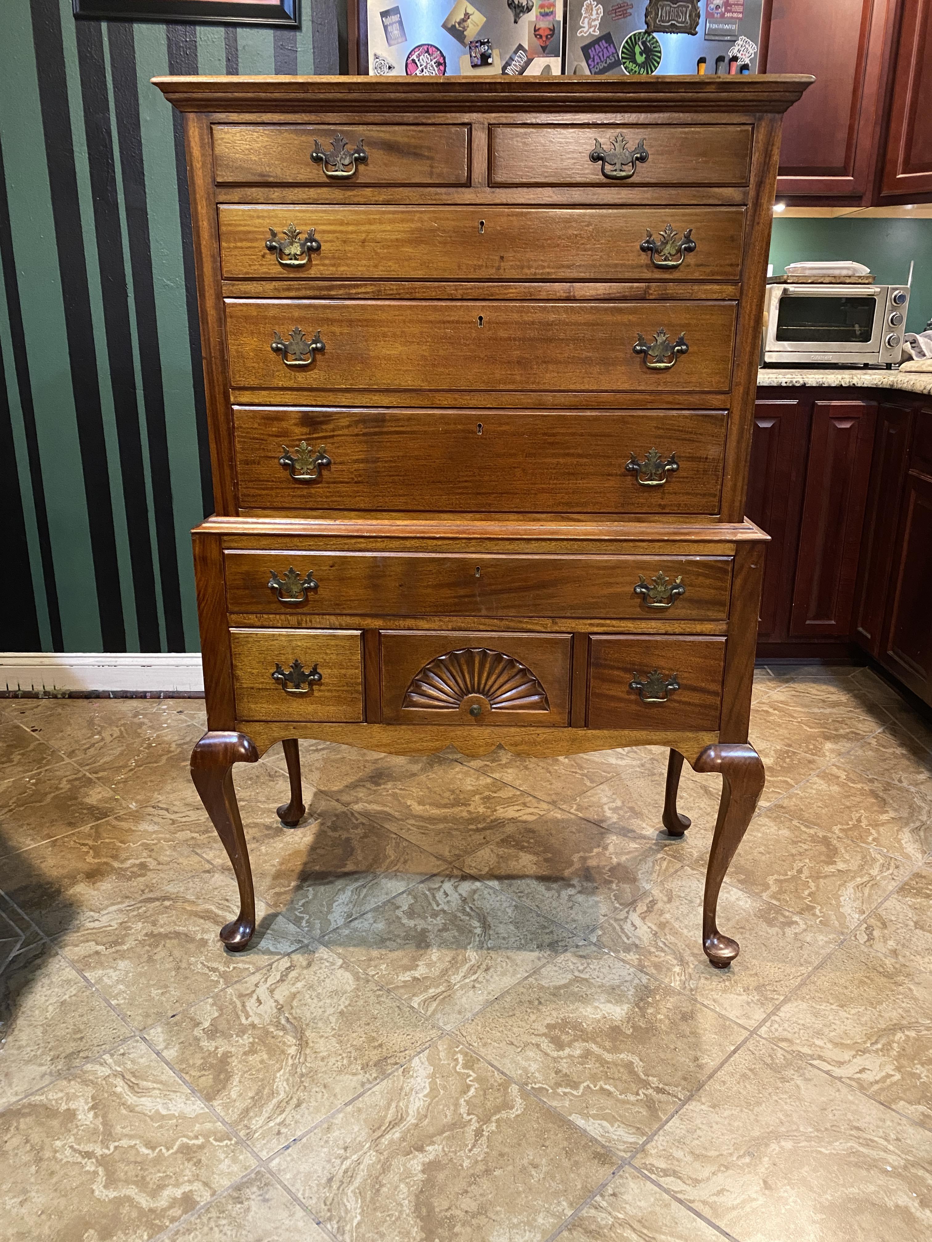 Queen Anne Style Highboy Chest on Chest, top and bottom are separate pieces. 9 drawers. The four largest drawers have locks, key is missing. Drawers are dovetailed joinery, the drawer pulls appear to be original to the piece, and have the number 2377 stamped on the back of the pulls. The wood inside the drawers appears to be the same as the exterior wood and stained to match. There is no label or identifying mark on the wood, and I am not knowledgeable enough to determine if this is a handmade piece or factory made. It appears to be old, but again I do not have the knowledge to determine it’s age and the history is unknown except that it was my grandparents before I inherited it.