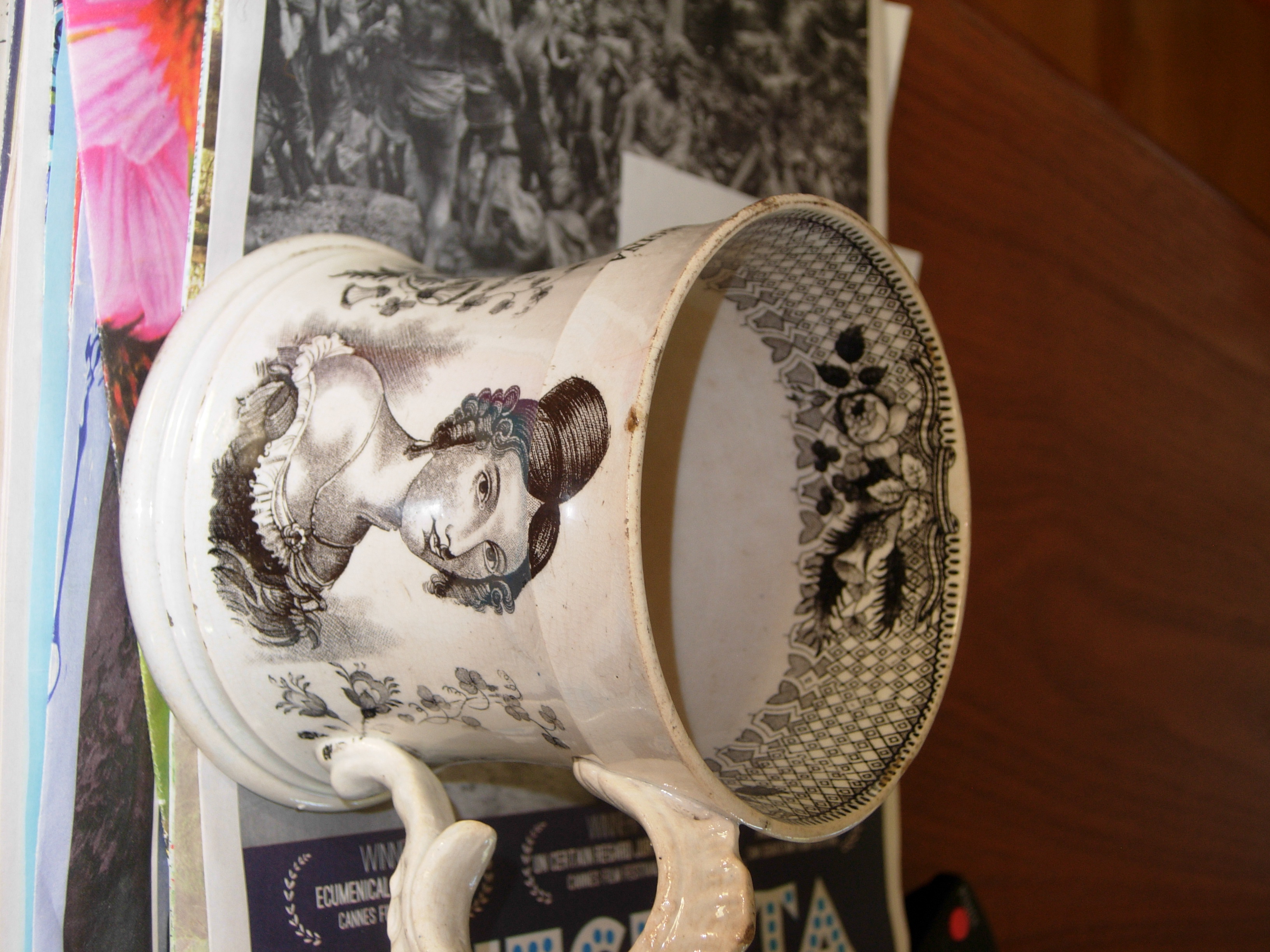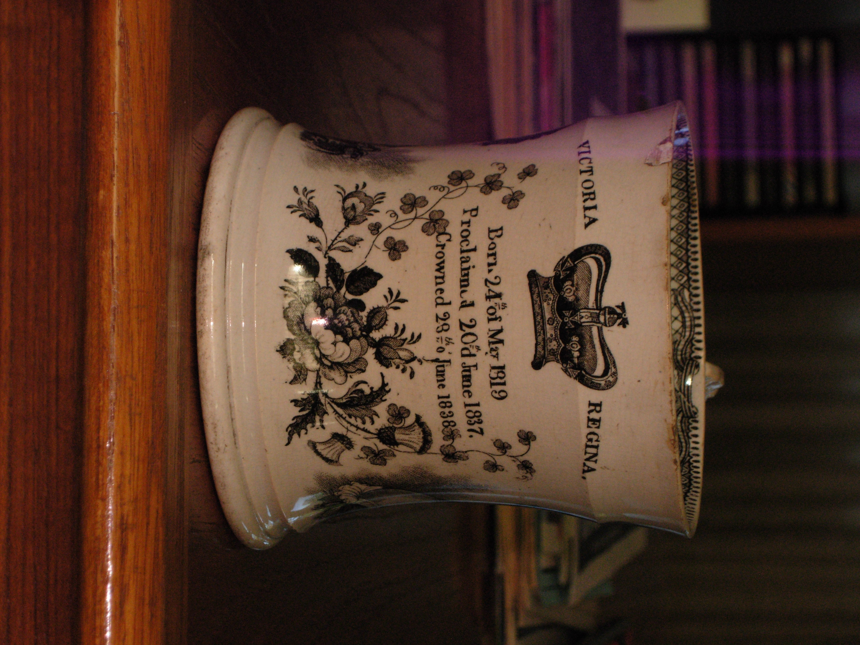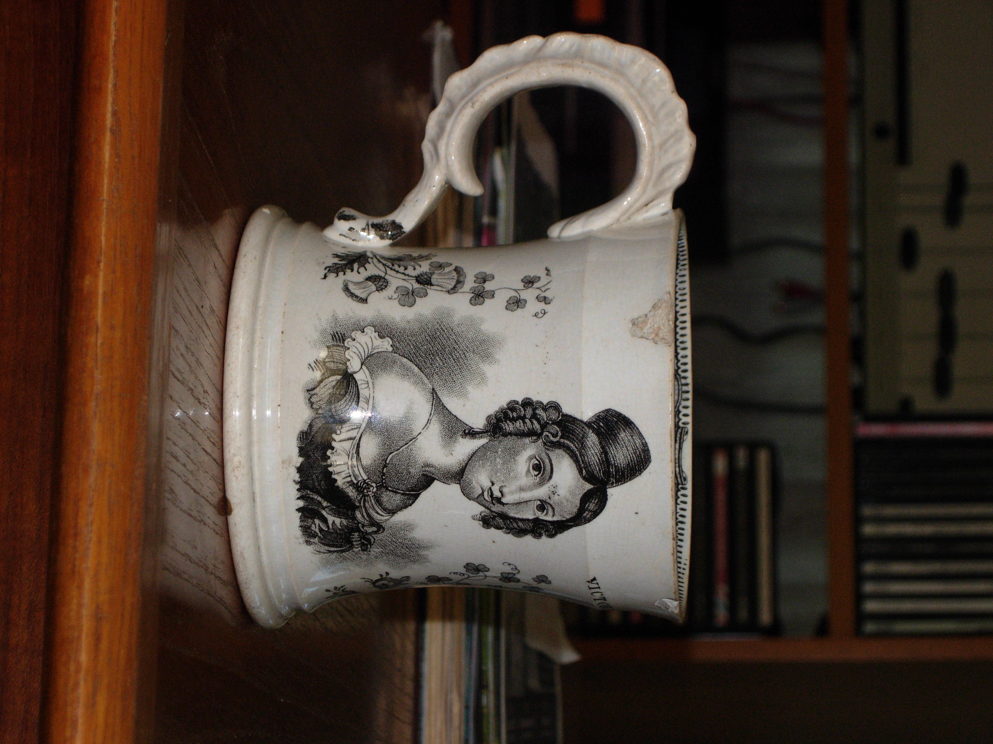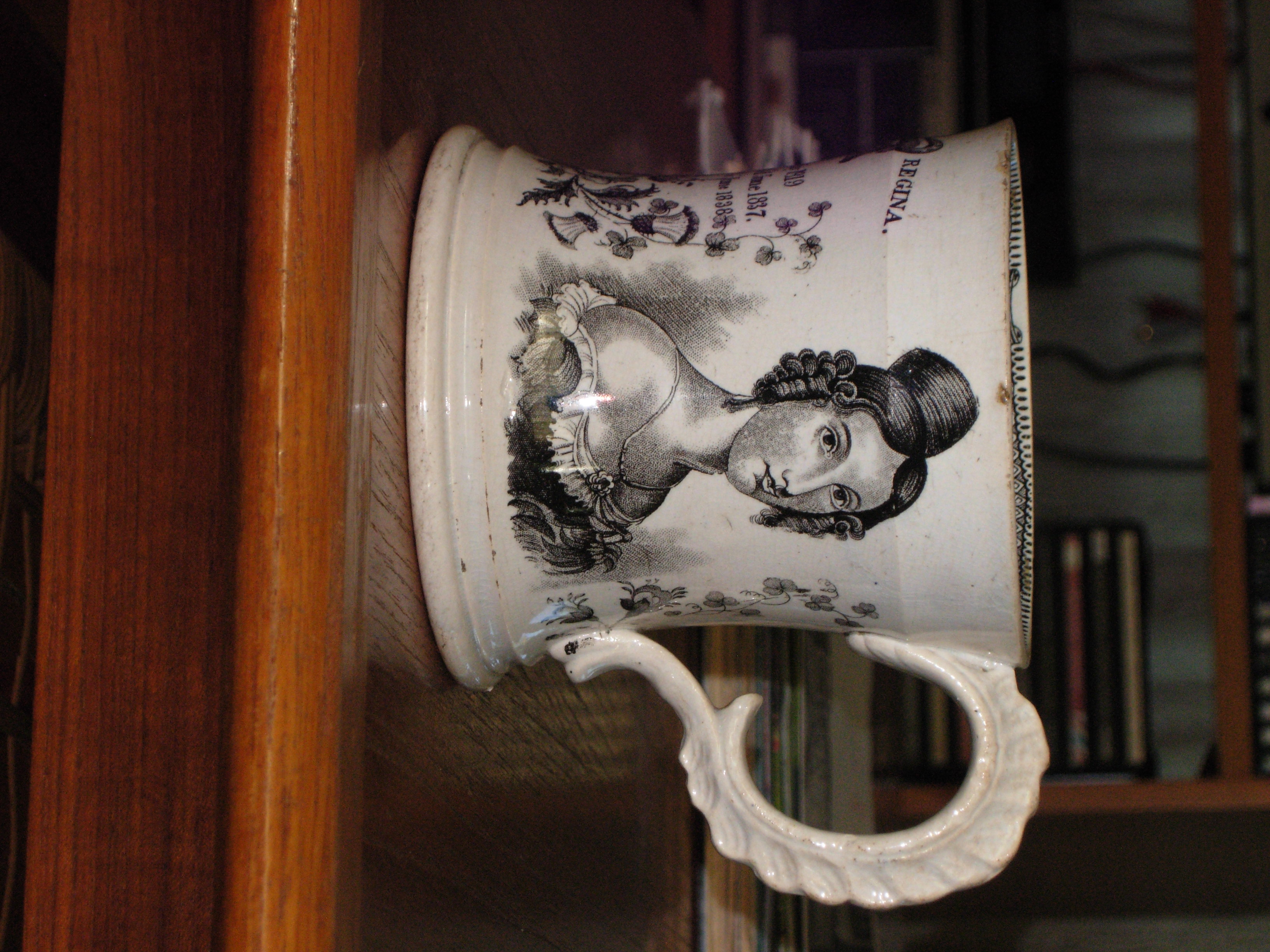 It's a coronation mug, 1838 (not a proclamation). White china, black design, just under 4" height.