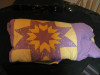 It is a quilt with light blue border and blocks with star designs. The fabrics have blues, white/cream and red. The prints are solid floral and stripes.