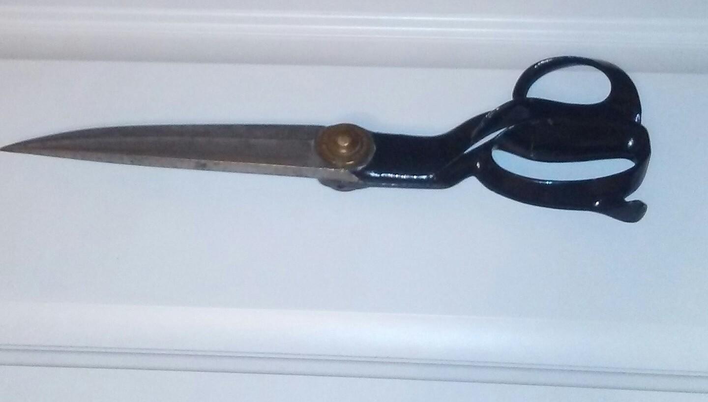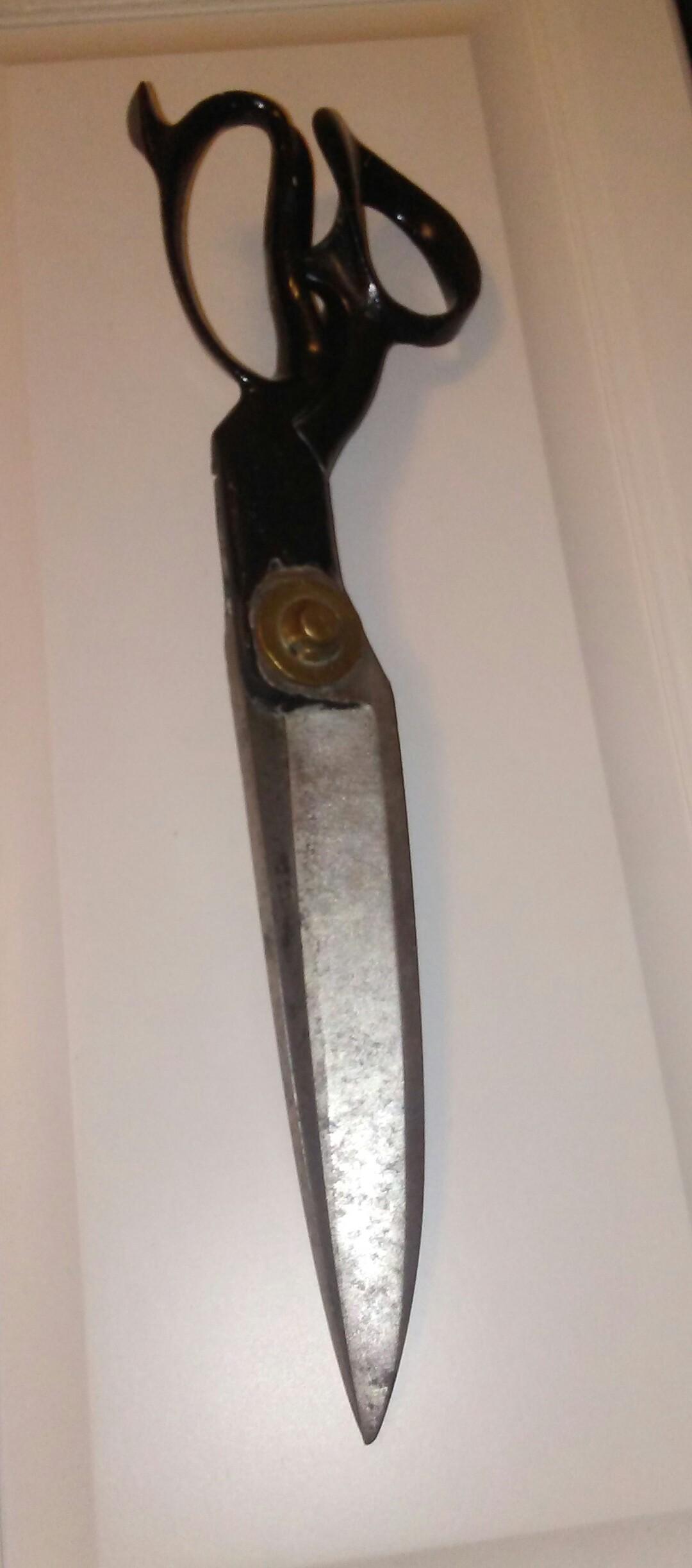 R. Heinisch Inventor Newark, NJ. Is on the brass bolt that connects to the brass nut holding blades together. They are 14 1/2 inches long they are sailmakers scissors I believe
