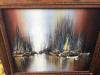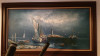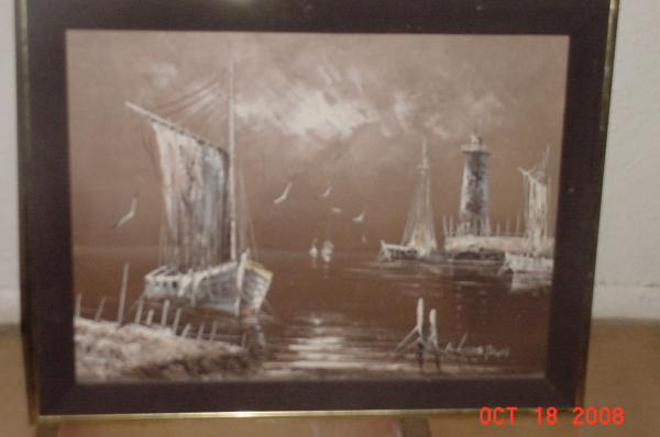 Brown and white oil paintin of boat in harbor with lighthouse in background