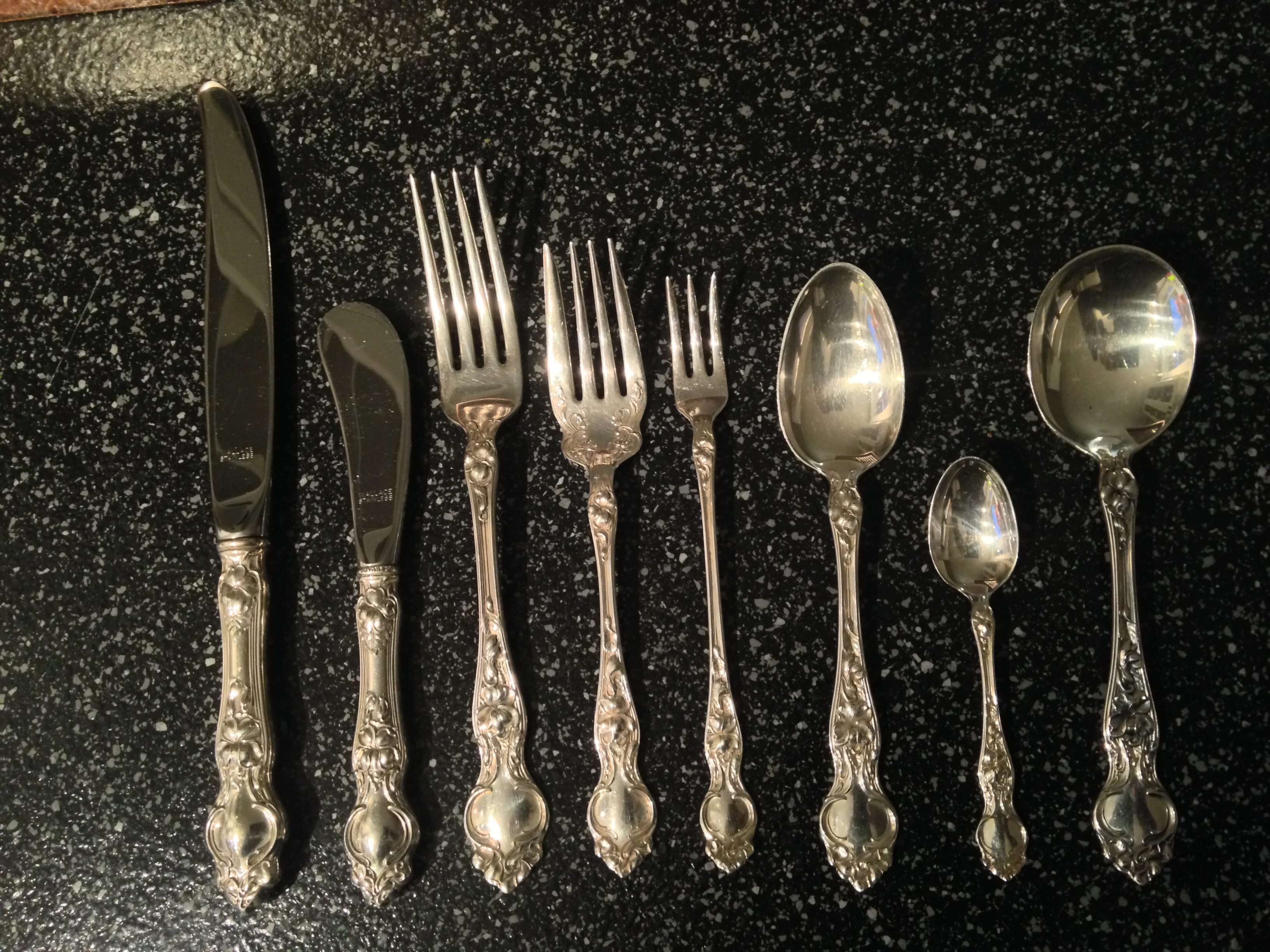 I have a full set of eight of R. Wallace Sterling. I believe it is the violet pattern. All peices have the word sterling stamped on them. I have included a picture of this marking from one of the forks.