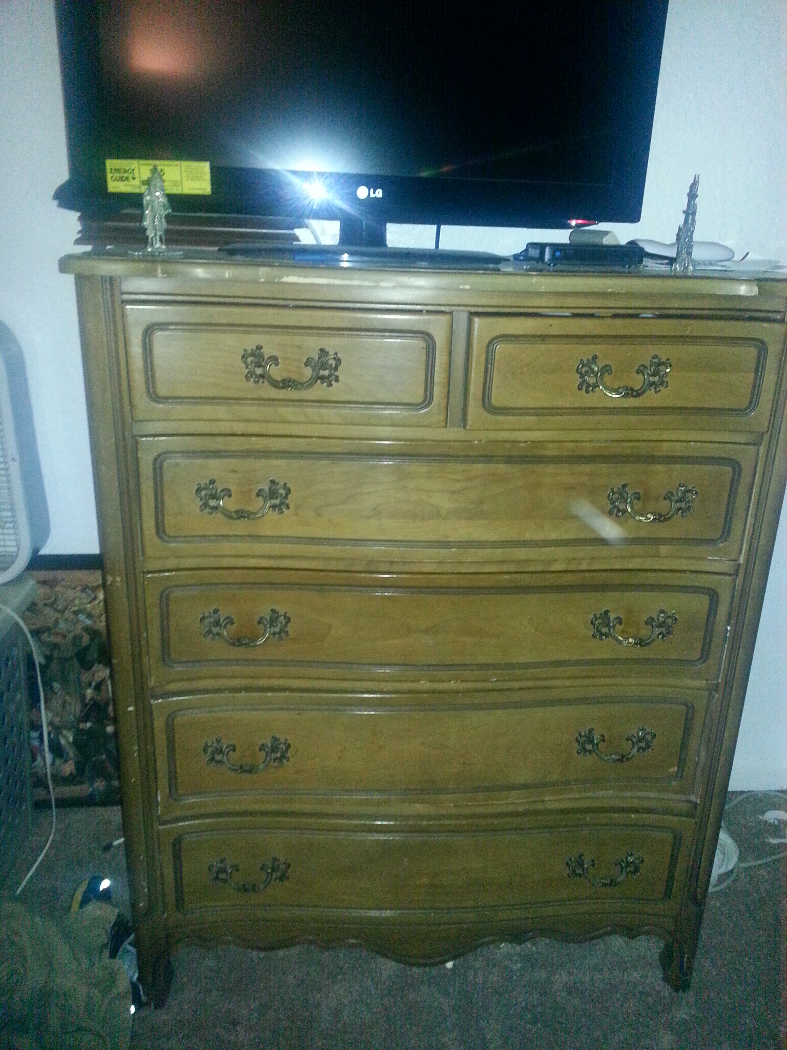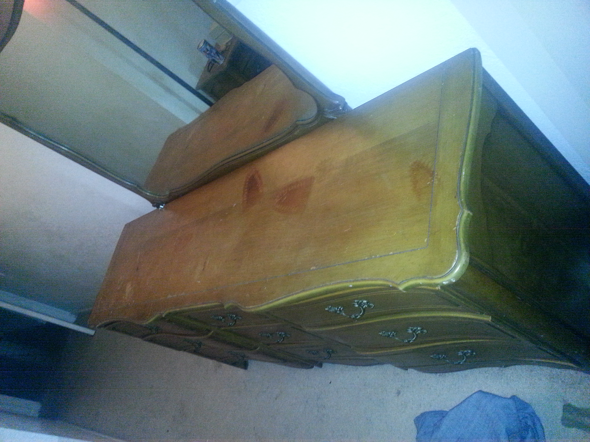 The Chest and Dresser have numerous nicks from being moved many times, but are completely structurally sound with no missing parts. All rails work well. I would personally rate them in at least very good condition. The mirror has some fading and cloudiness, but the wood is in excellent chape with no damage