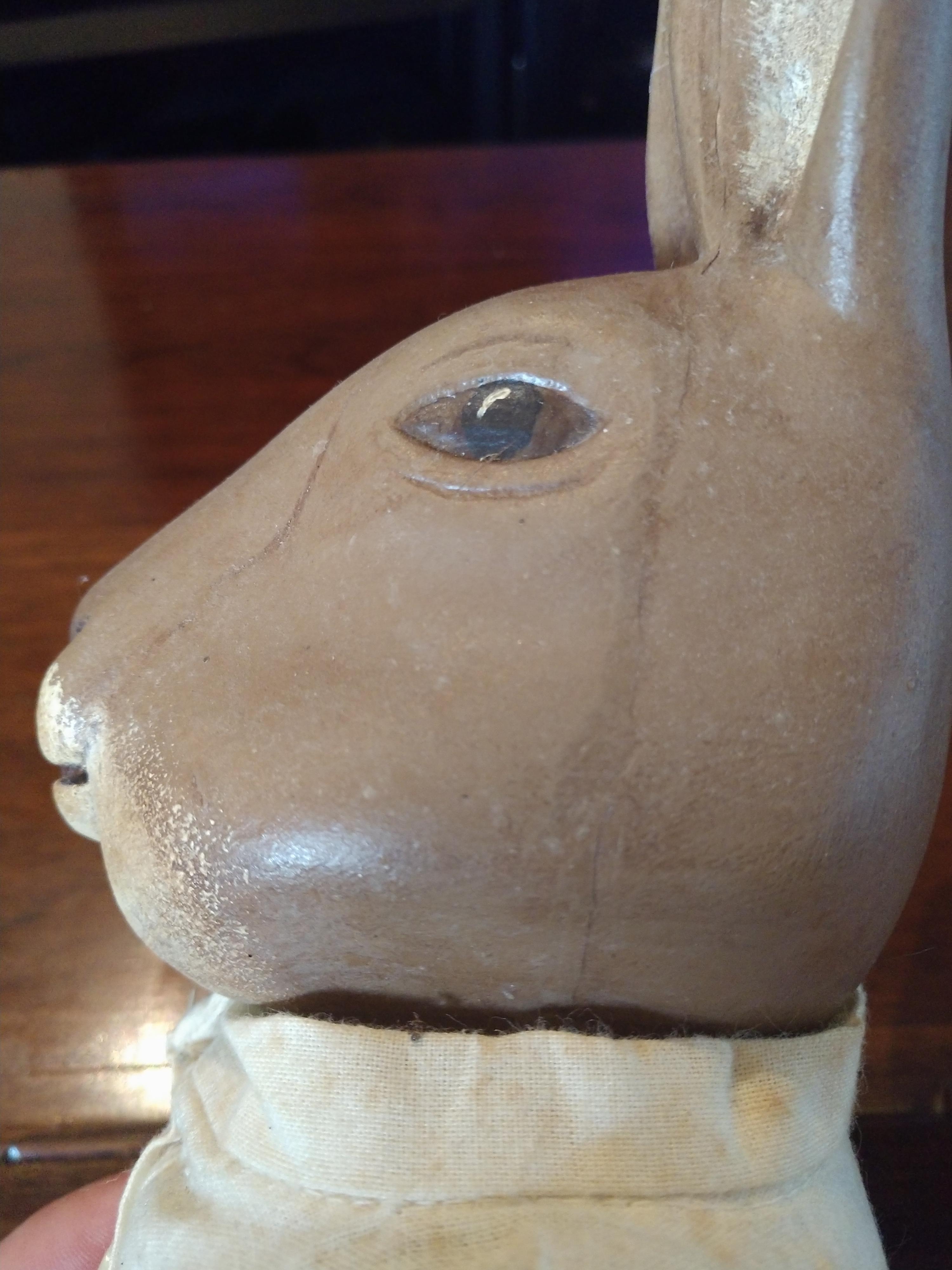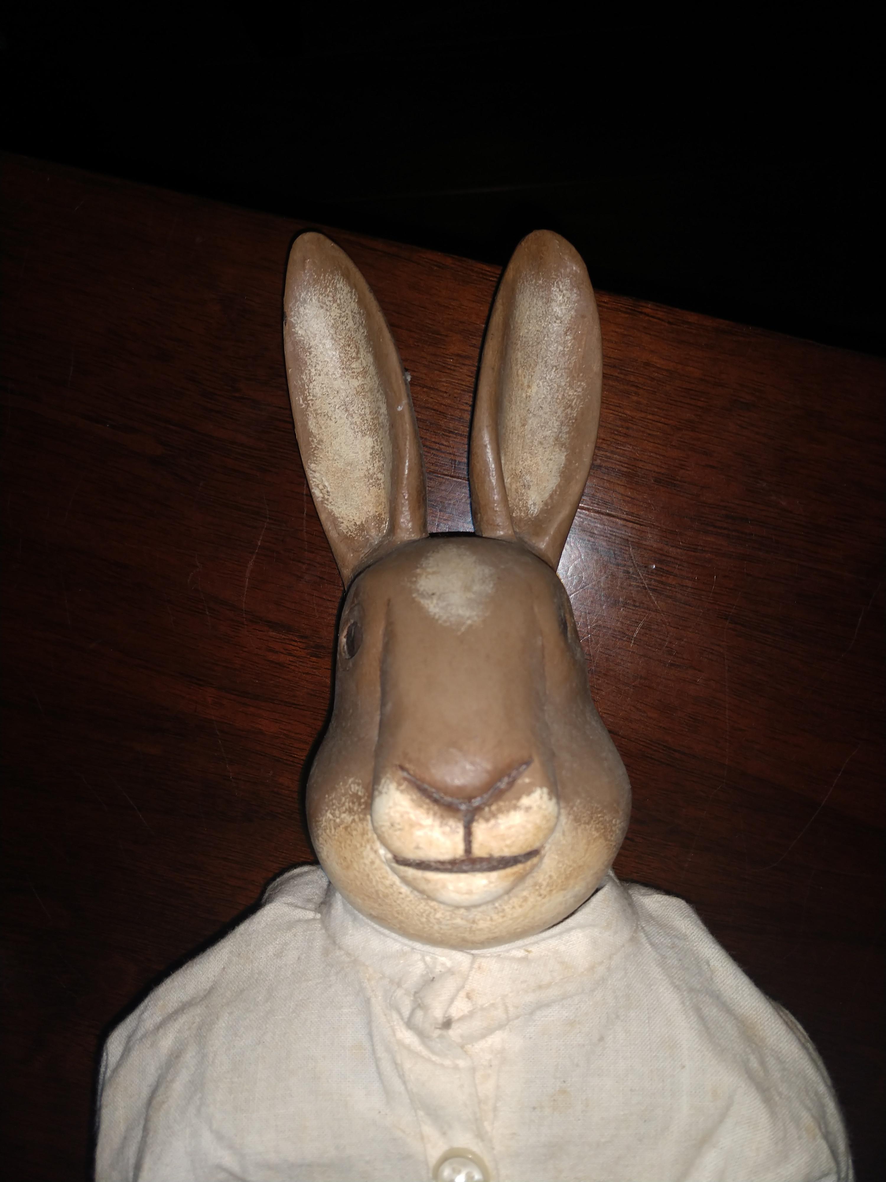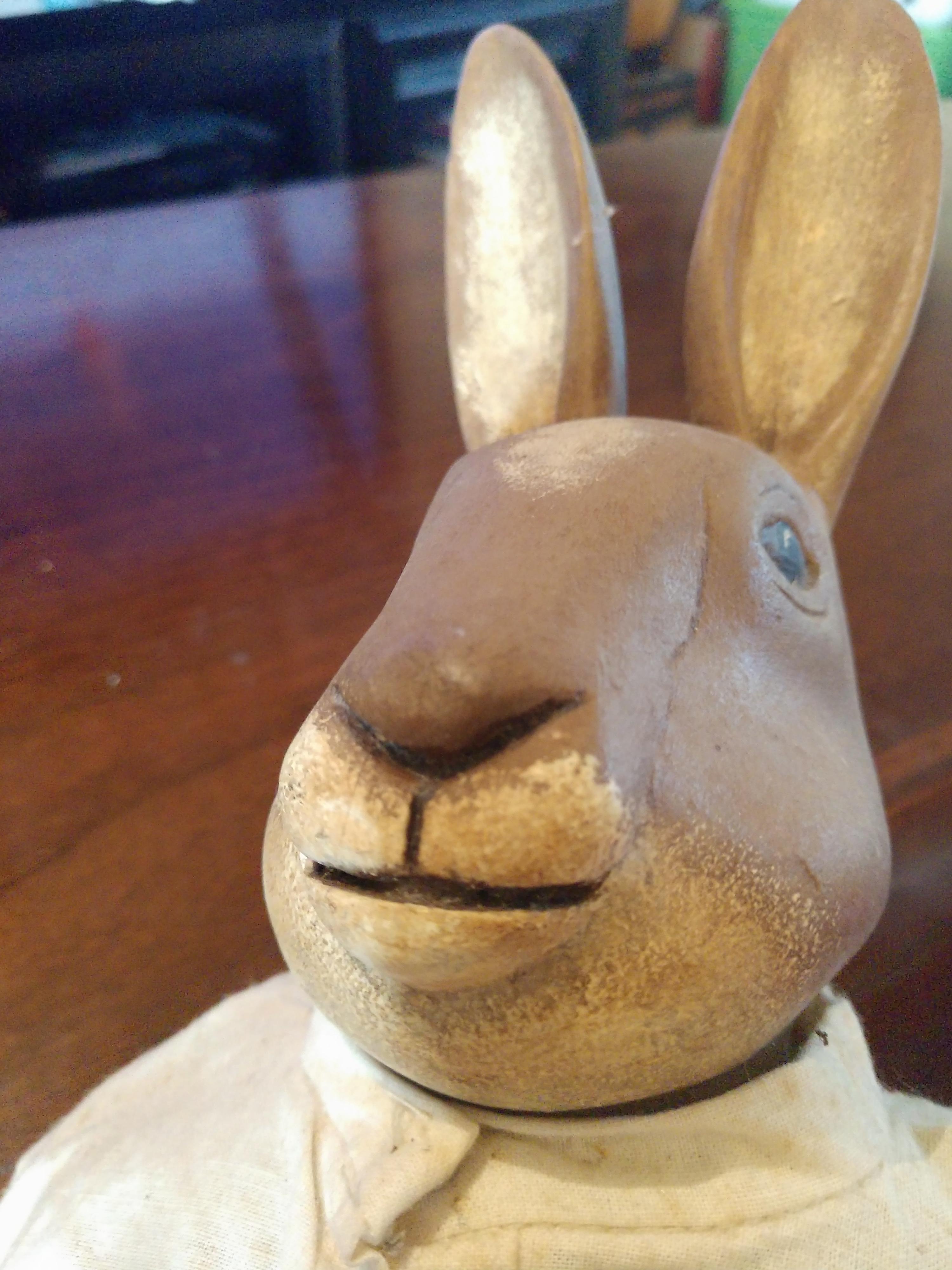 This vintage-looking rabbit doll has recently cam into my possession. I am trying to determine if it is actually old and possibly collectible or if it is just made to appear that way. Appears to be hand carved and hand painted. I'm not seeing a stamp it anything that would indicate it's origin.