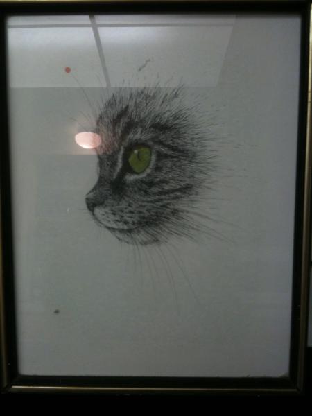 The face-on drawing of the kitten was called "Xmas," and has colorful eyes with a white image of a bird in the center of each like a reflection. Although the smile on the kitten seems pleasant and benign, someone once suggested that the kitten was thinking about catching the bird for a tasty snack, and might not be so innocent. It is not known what the artist was thinking.