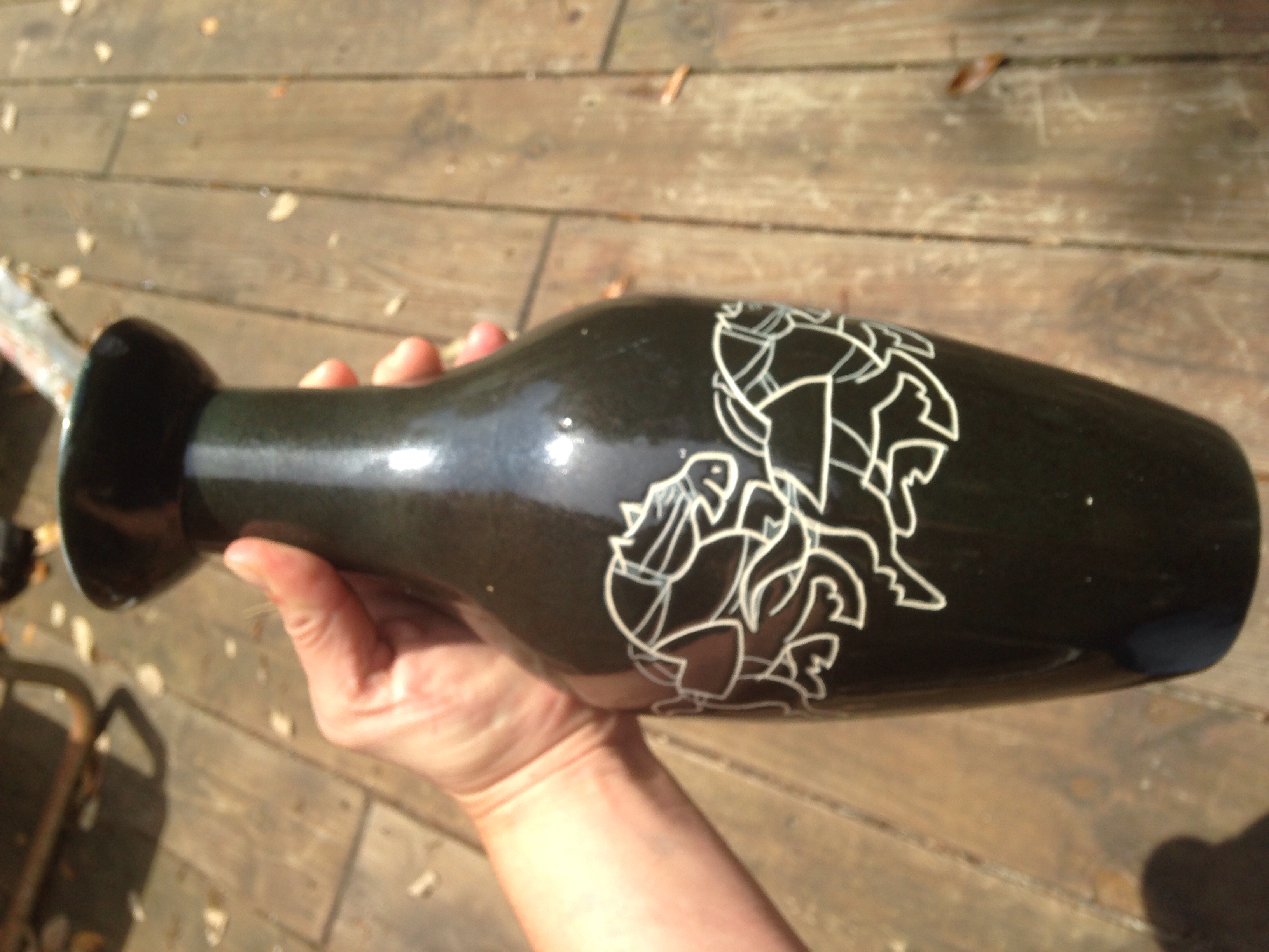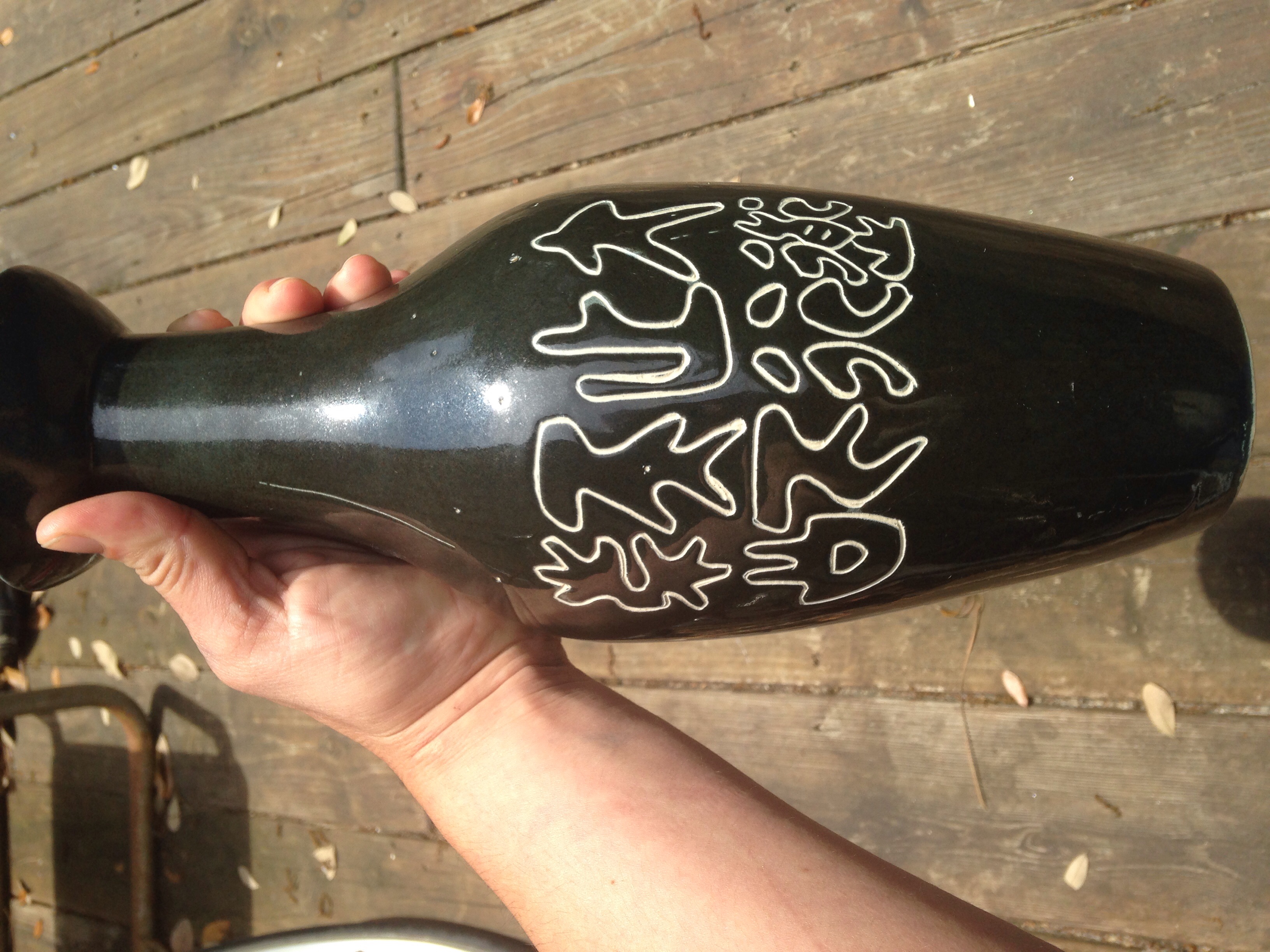 Dark gray glaze with white underlay exposed for design. Blue mark with some outline around letters I cannot read.