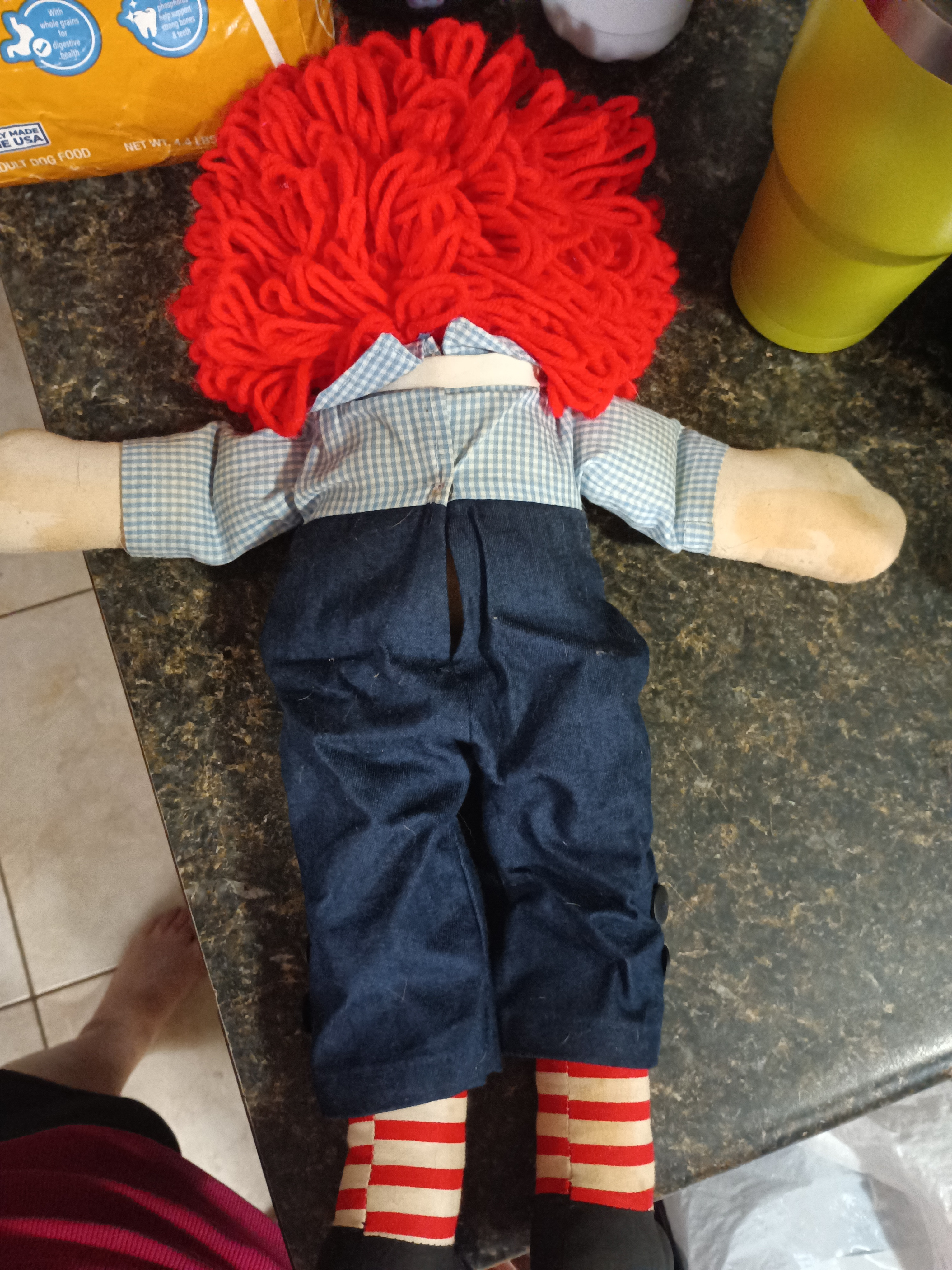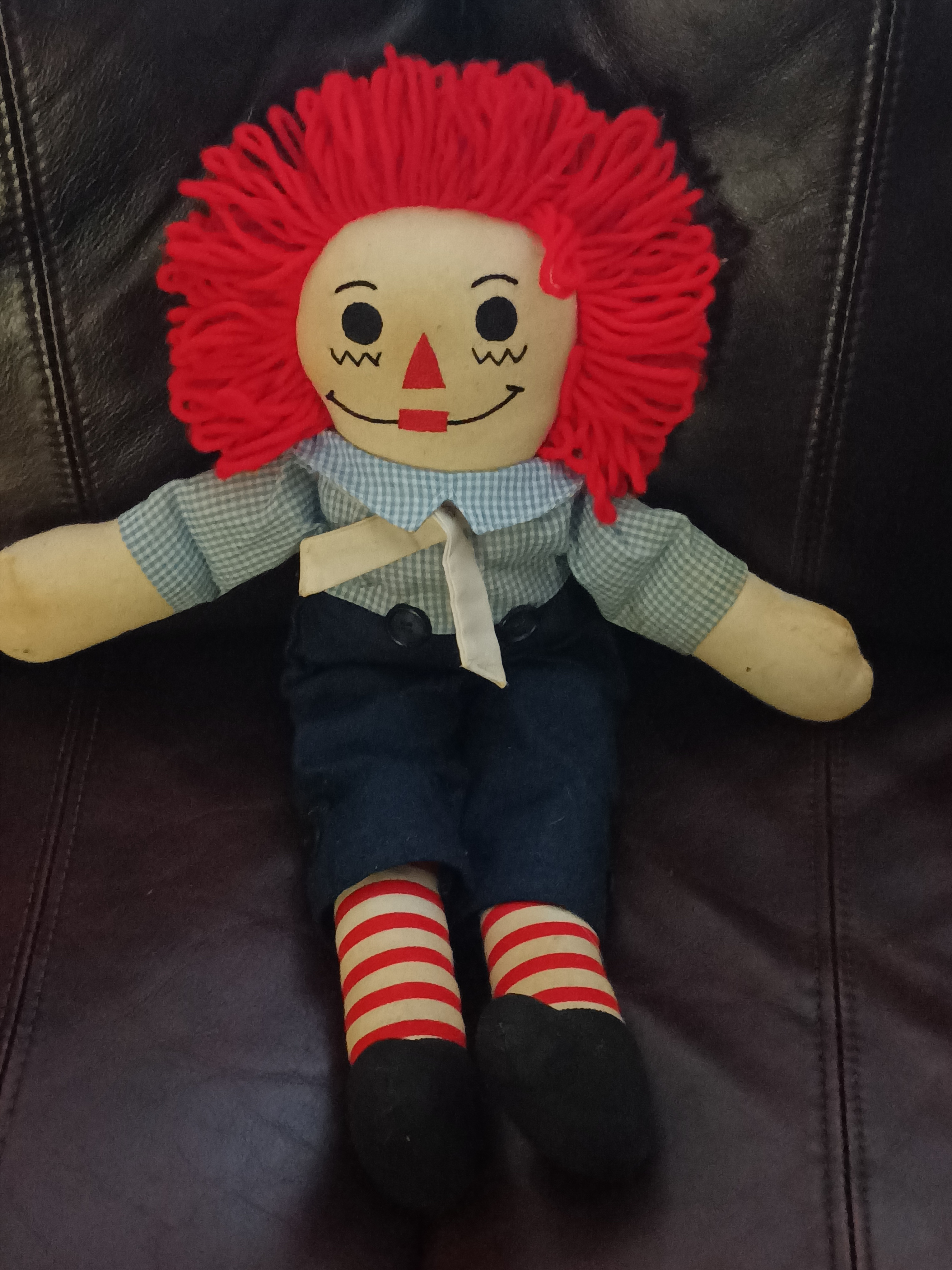 Raggedy Andy Doll. Made by Knickerbocker Toy Company. Dating to c. 1960-1980. Materials: Fabric, yarn, stuffing. Estimated value: $50 – $100. Condition: Very Good. The market for vintage dolls is stable with growing interest among collectors.
