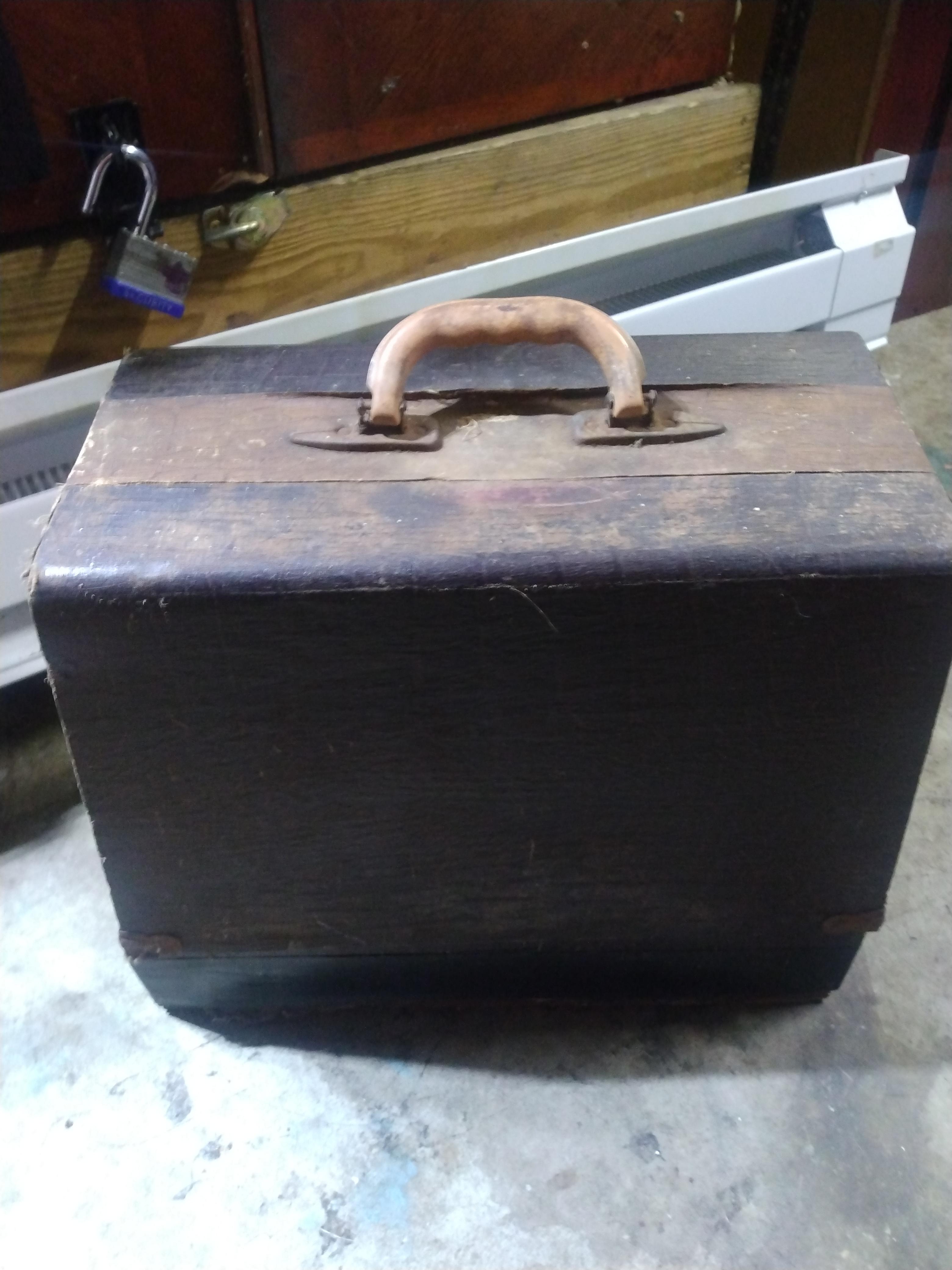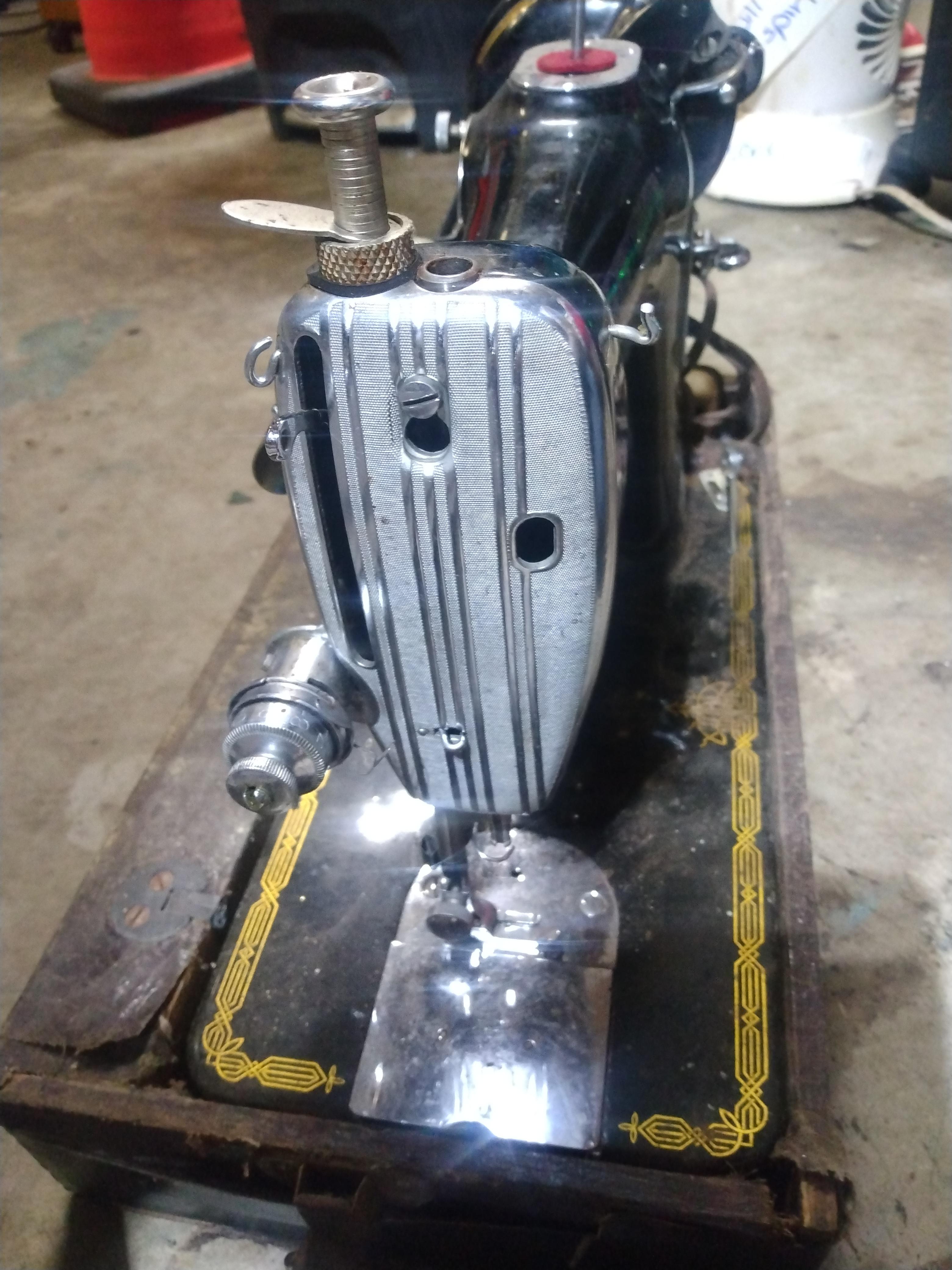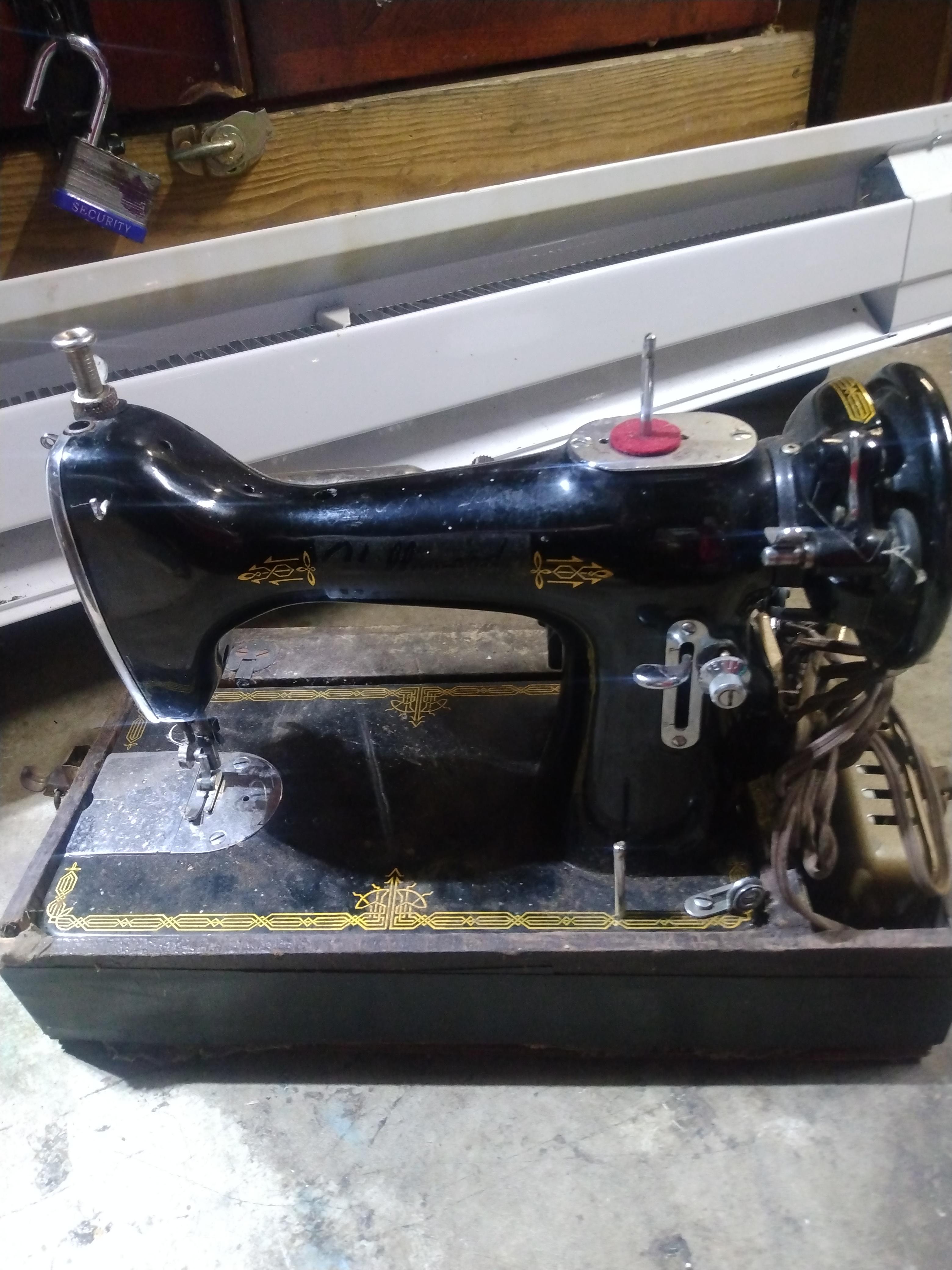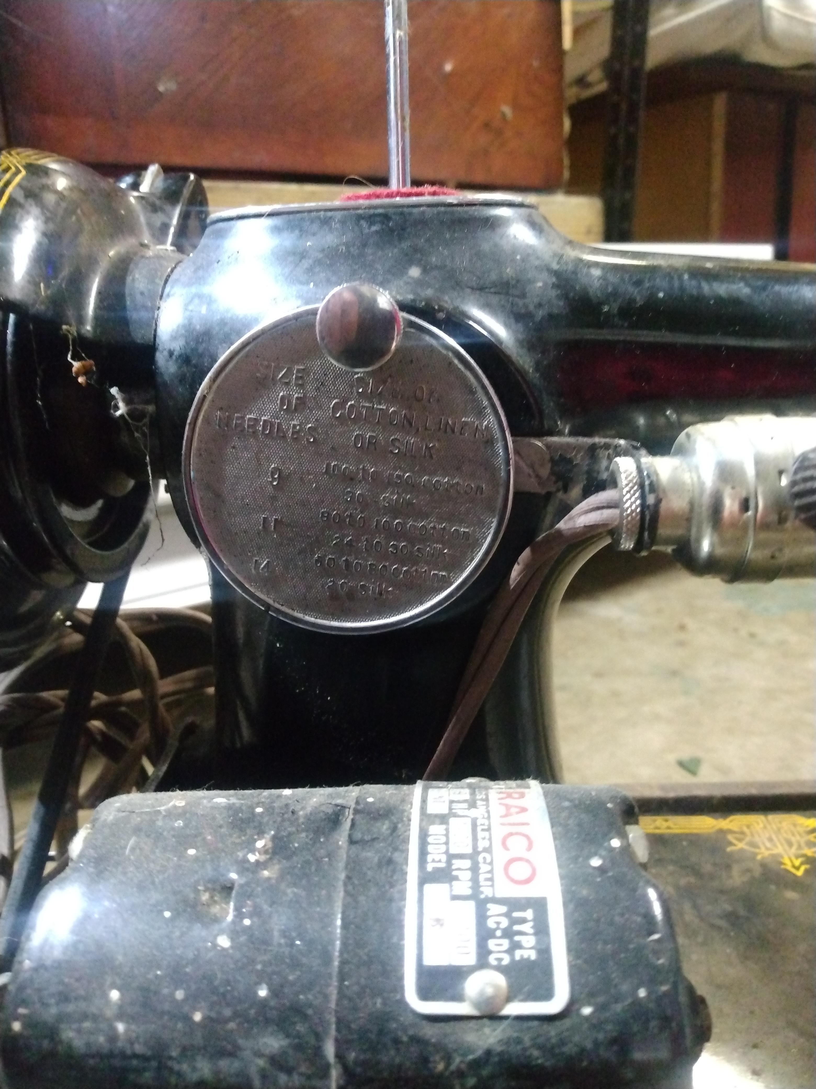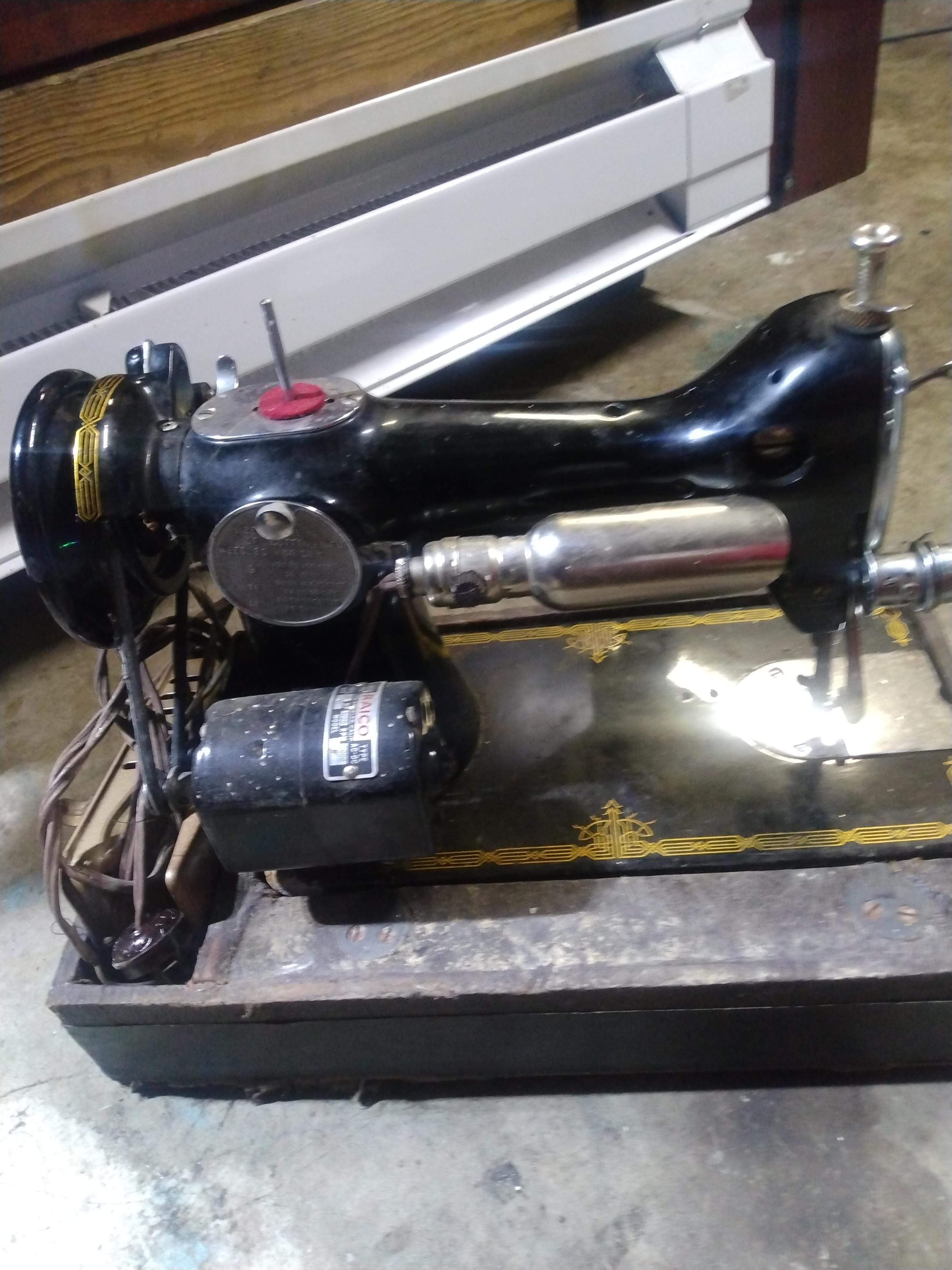 Raico Hollywood sewing machine with the original wooden box. It has a motor, pedal, and light attached. The serial number is 018137. It works.