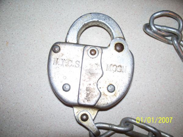 On the front of the padlock to the left of the keyhole, the initials N.Y.C.S engraved and to the right of the keyhole is the word MOON. On the keyhole cover, the word CORAIN is in a circle above the words Made in U.S.A. On the key, the letters N.Y.C.R.R is engraved on the front and the numbers 20635 is on the back. The lock operates easily and without difficulty. There is approximately 10 links of a metal chain attached to the padlock. We are interested in finding out the history and the approximate appraisal value of this lock.