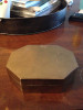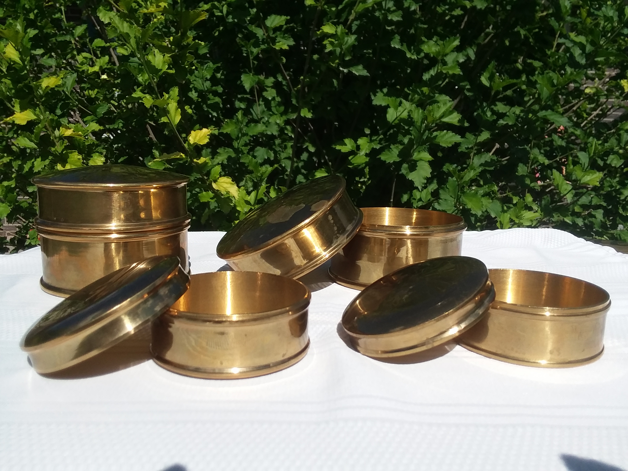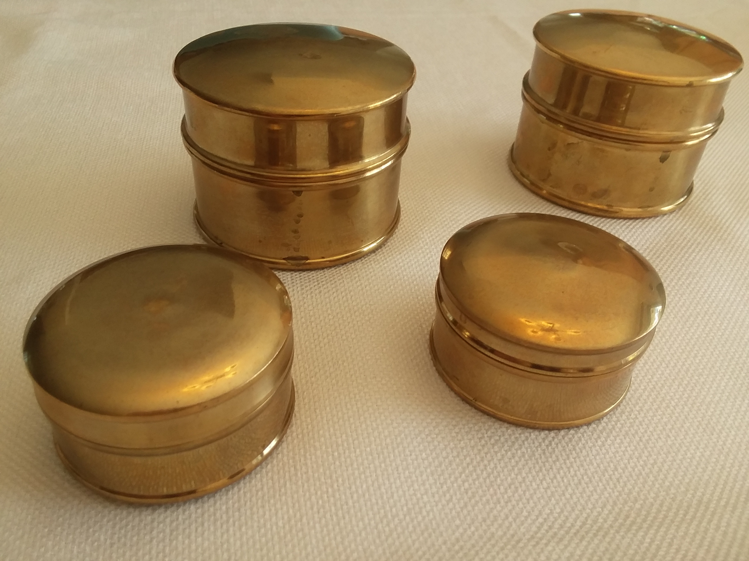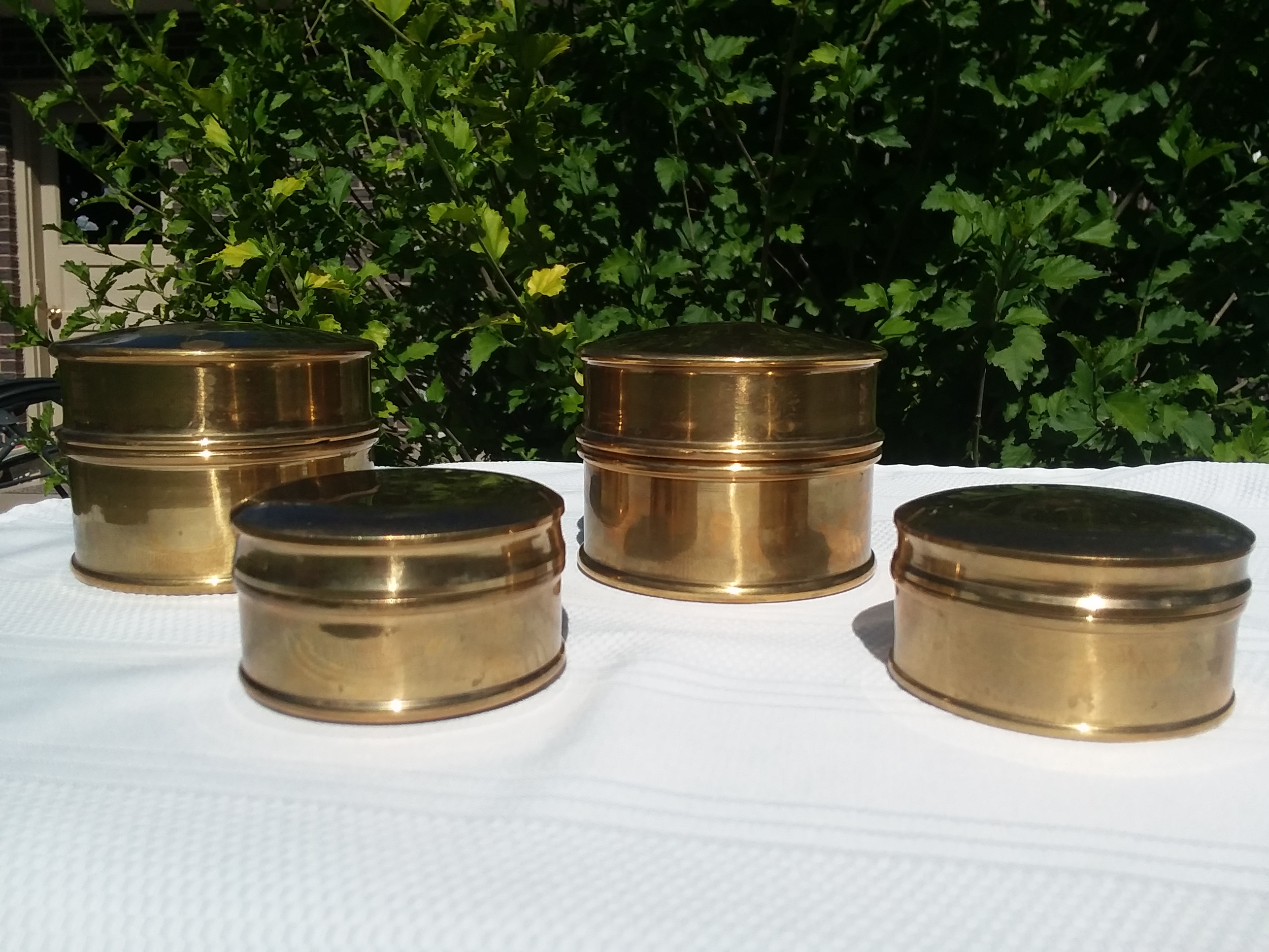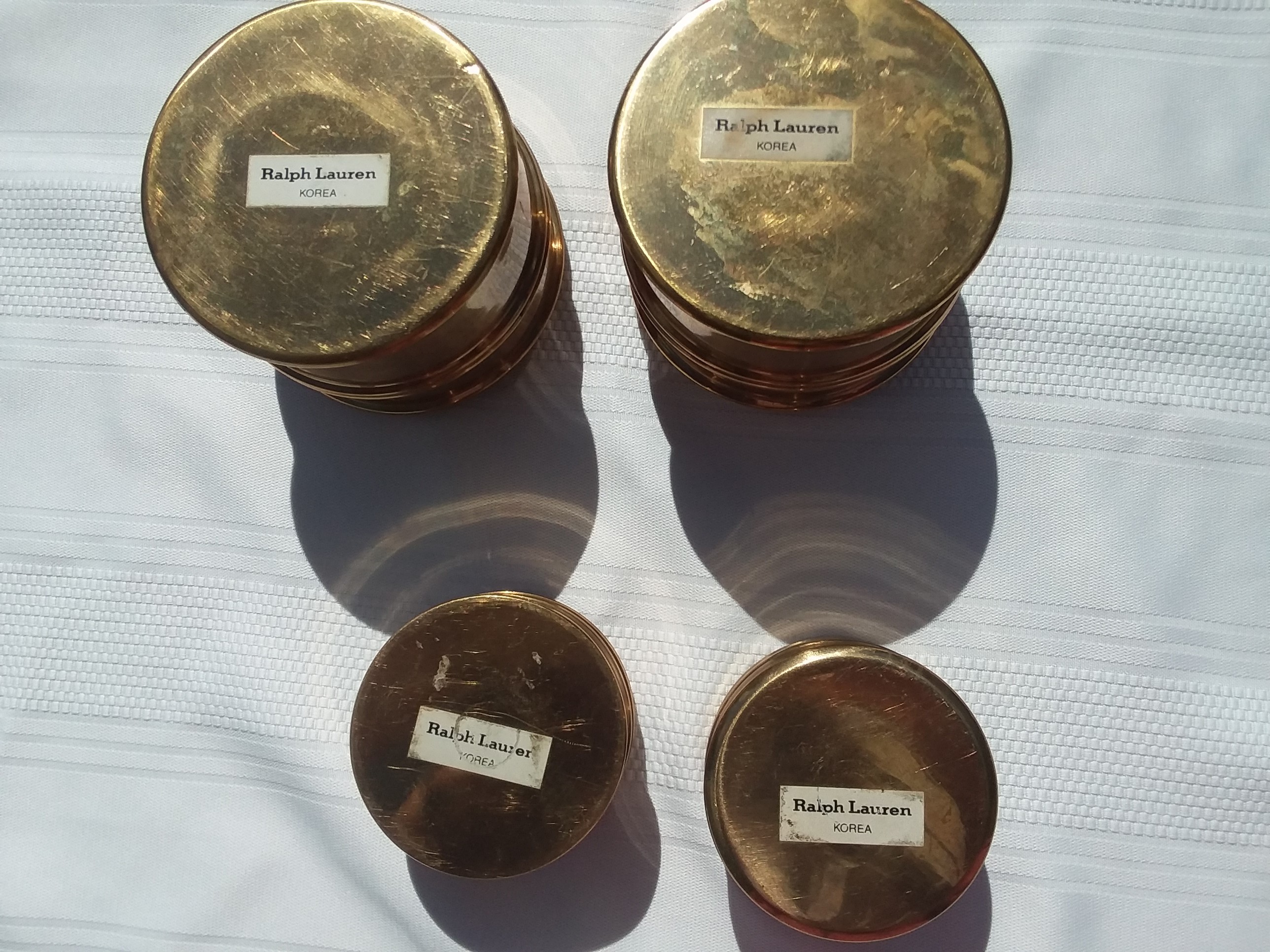 4 brass containers/ trinket boxes , Have sticker on bottom: Ralph Lauren Korea. 2 boxes are almost 3 1/2 inches in diameter and 2 1/2 inches tall, slightly rounded lid. 2 boxes are 2 1/2 inch diameter and almost 1 1/2 inch tall, again, with slightly rounded lid.  They have a good weight to them.