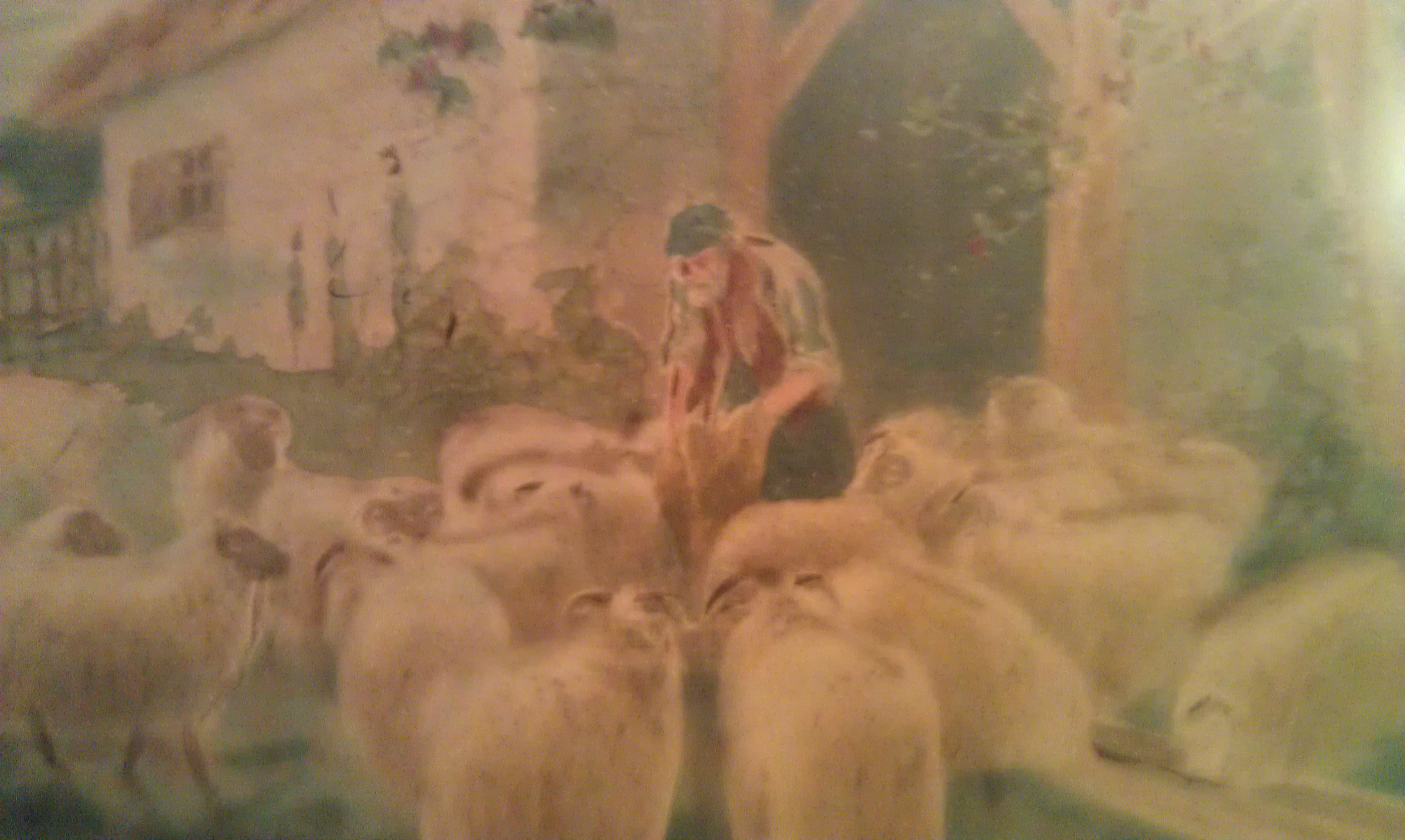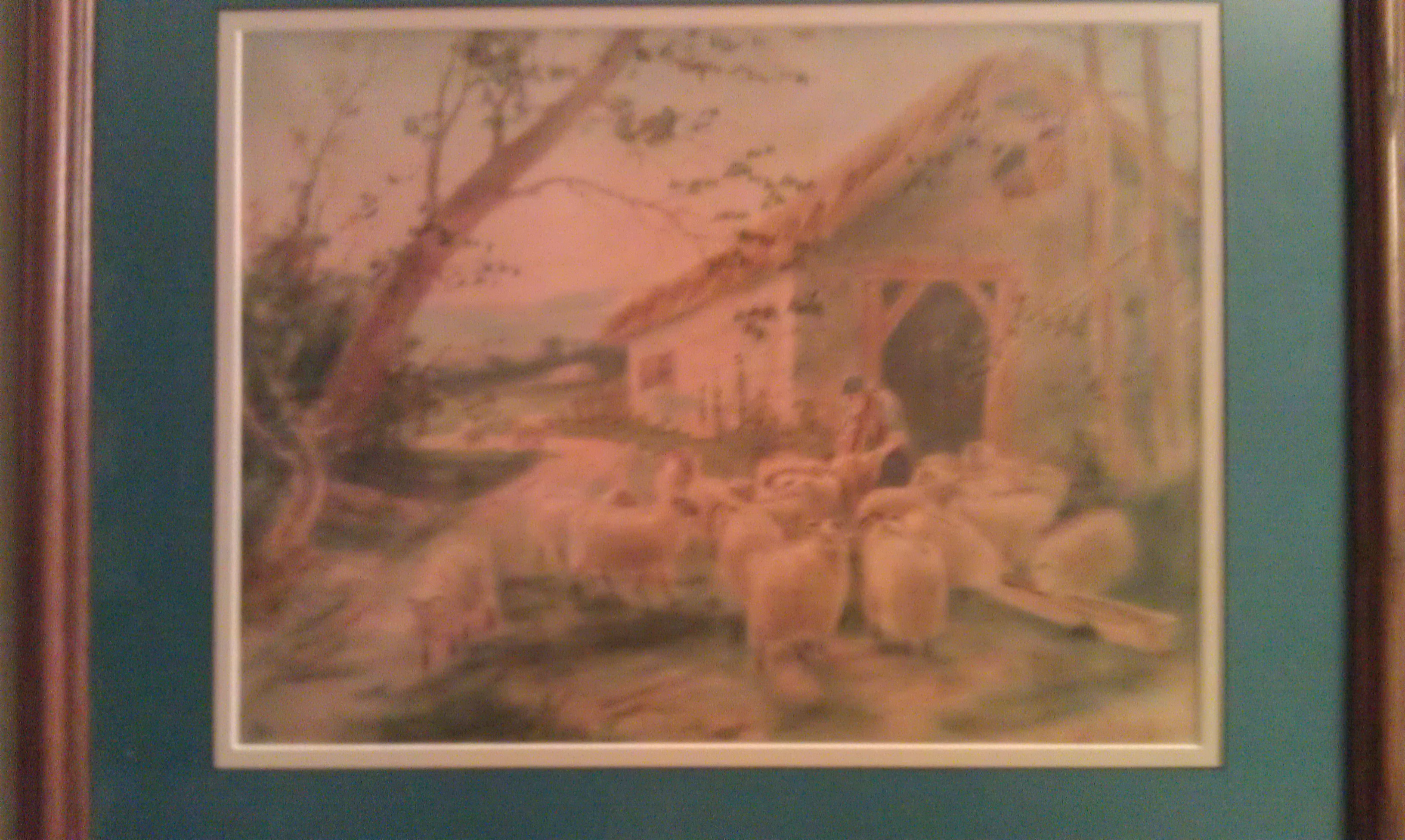 Unknown artist of a barnyard with a farmer feeding rams by his barn. The artistist signature starts with Ren. This was my grandmothers and it was her mothers, so it is over 100 years old. Possibly by Pierre-Auguste Renoir, signature has some similiarity to known examples.