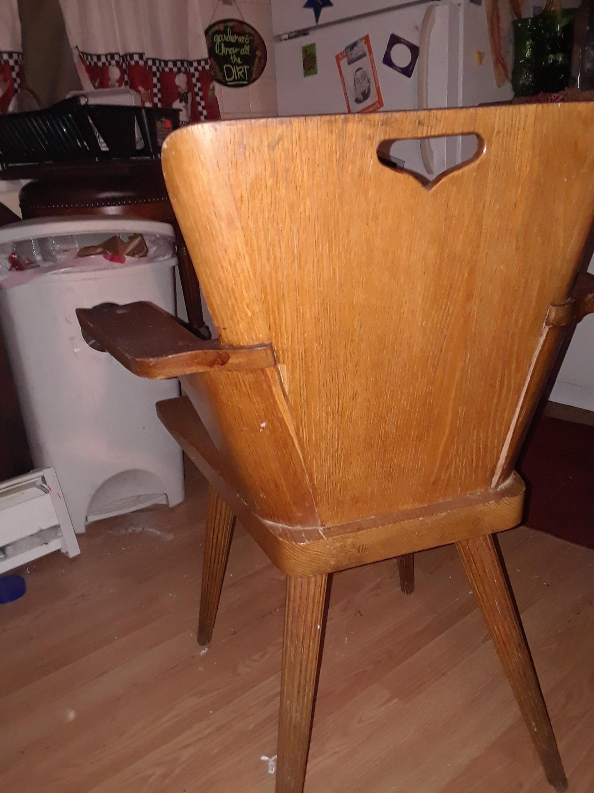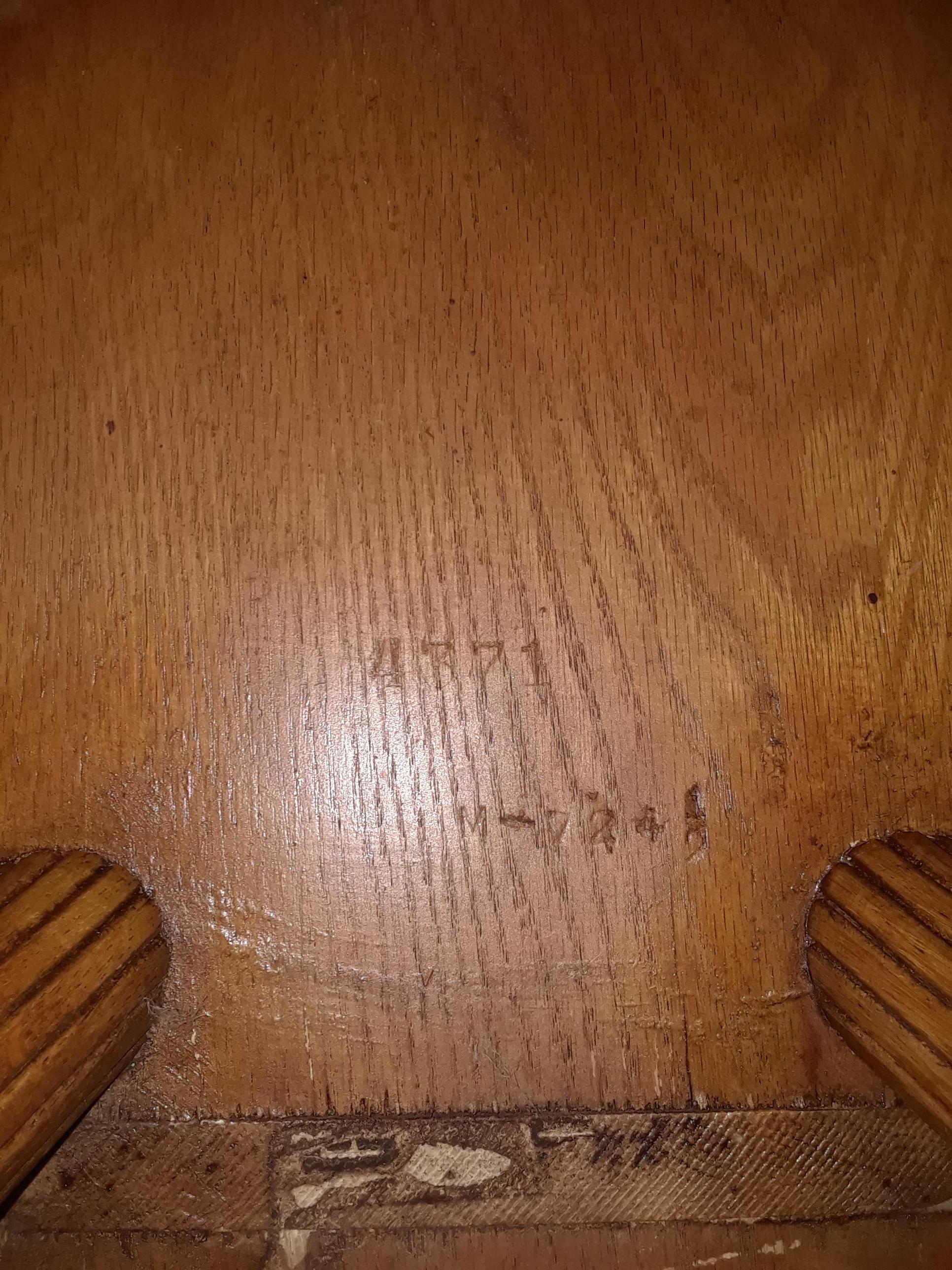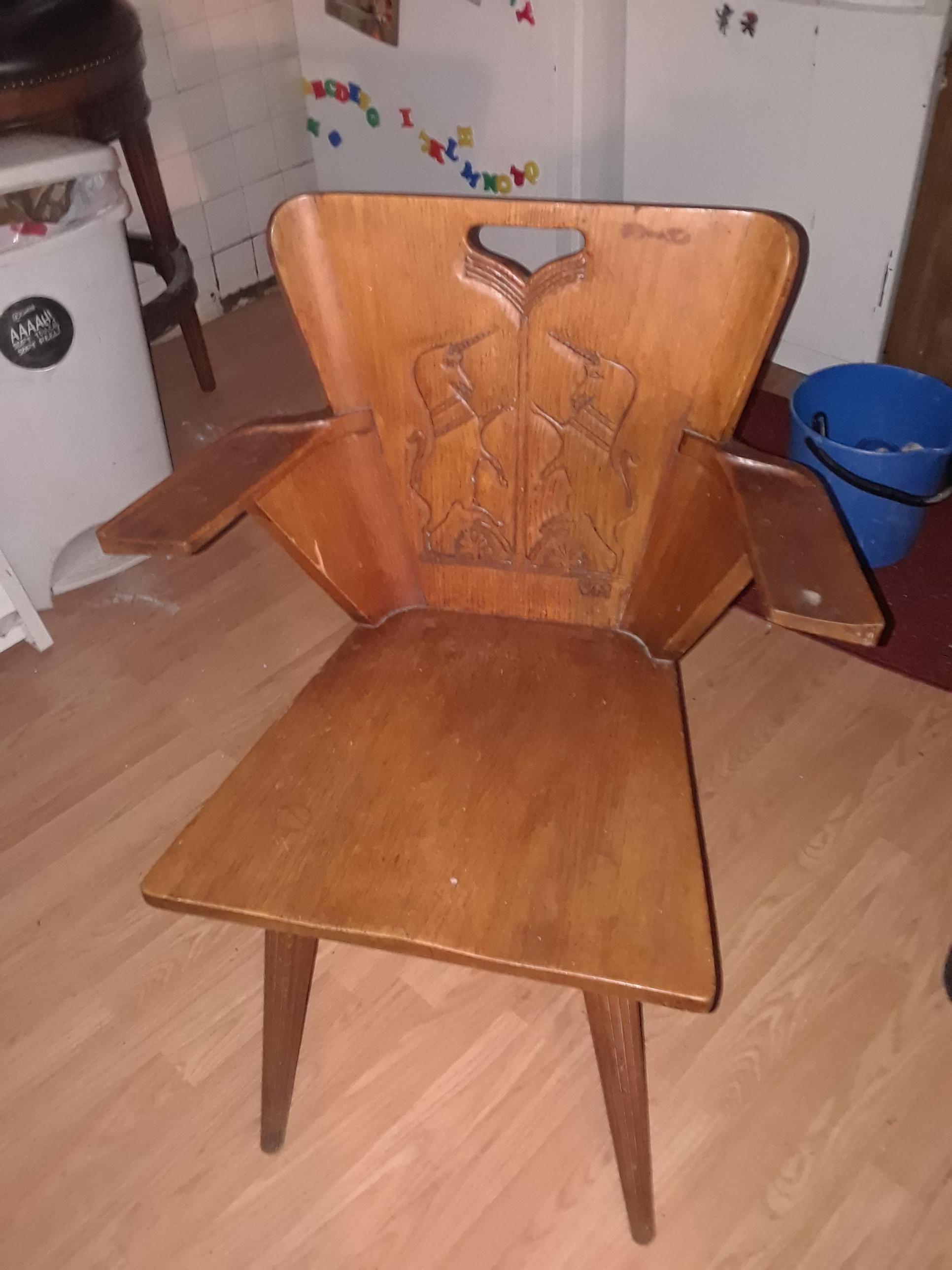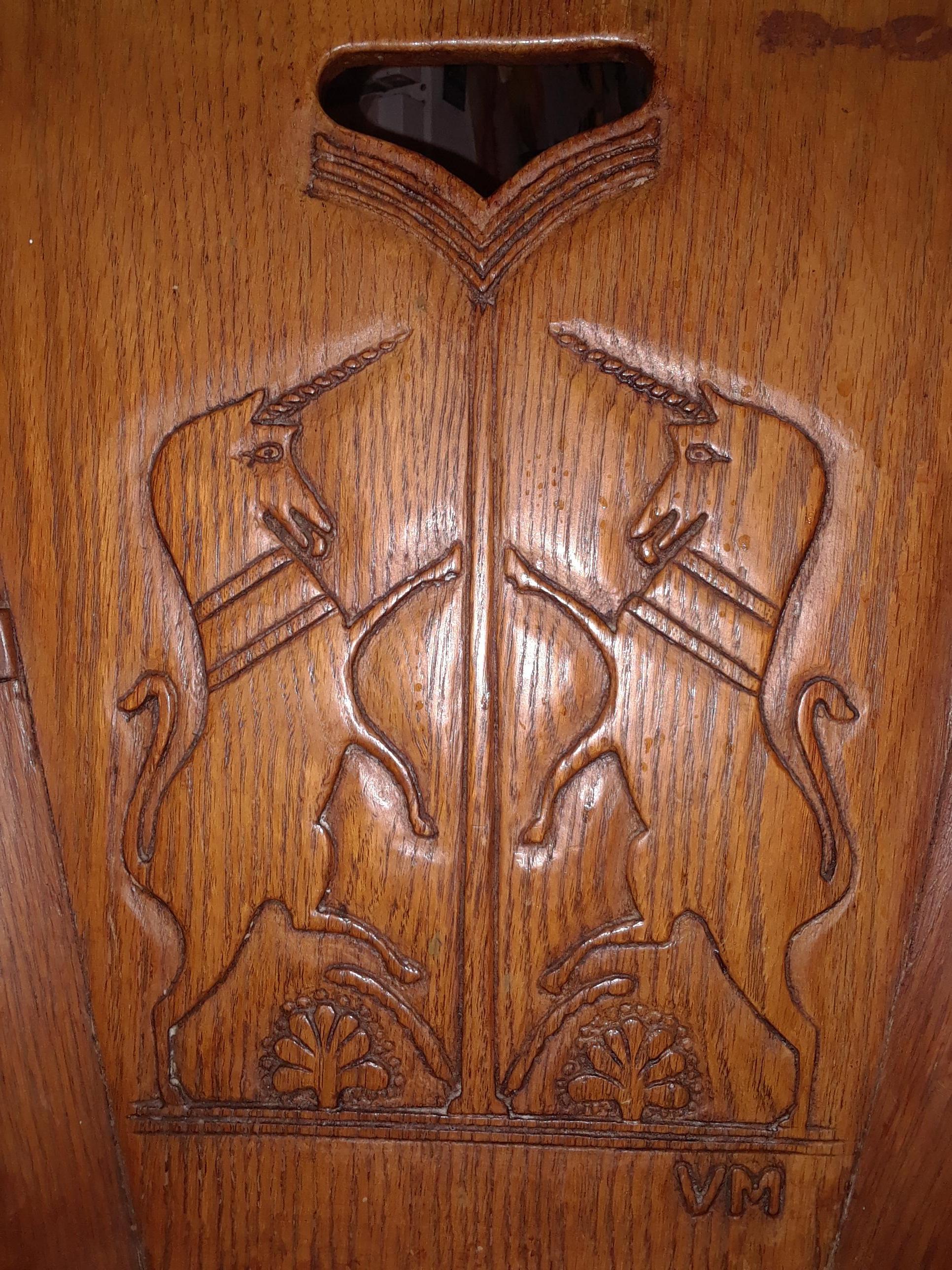 Rare club chair with a varnish initialed vm. Dowled legs, art engraved on back piece has 2 unicorns sticking thier tongues out reaching towards the other . Have been told they were made in the 1940s. Have only been able to find one matching image on the internet it was sold at an auction in ohio in the 90s, when i called the auction house they would not give any information at all. Any help would be greatly appreciated. Also i have a set of these 2 with matching numbers.