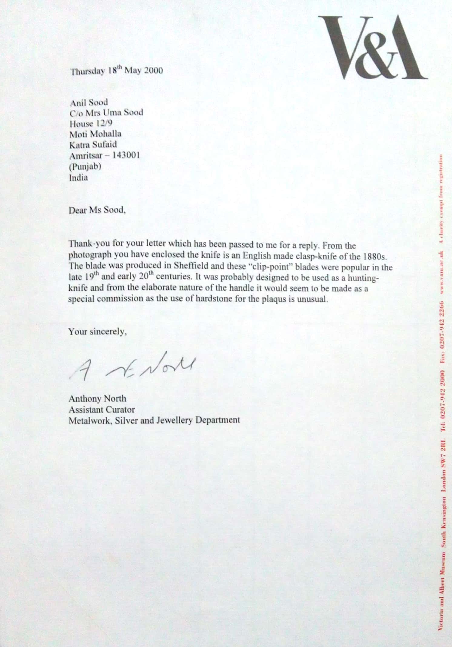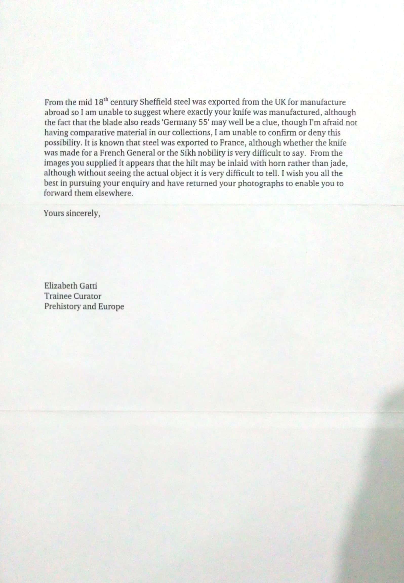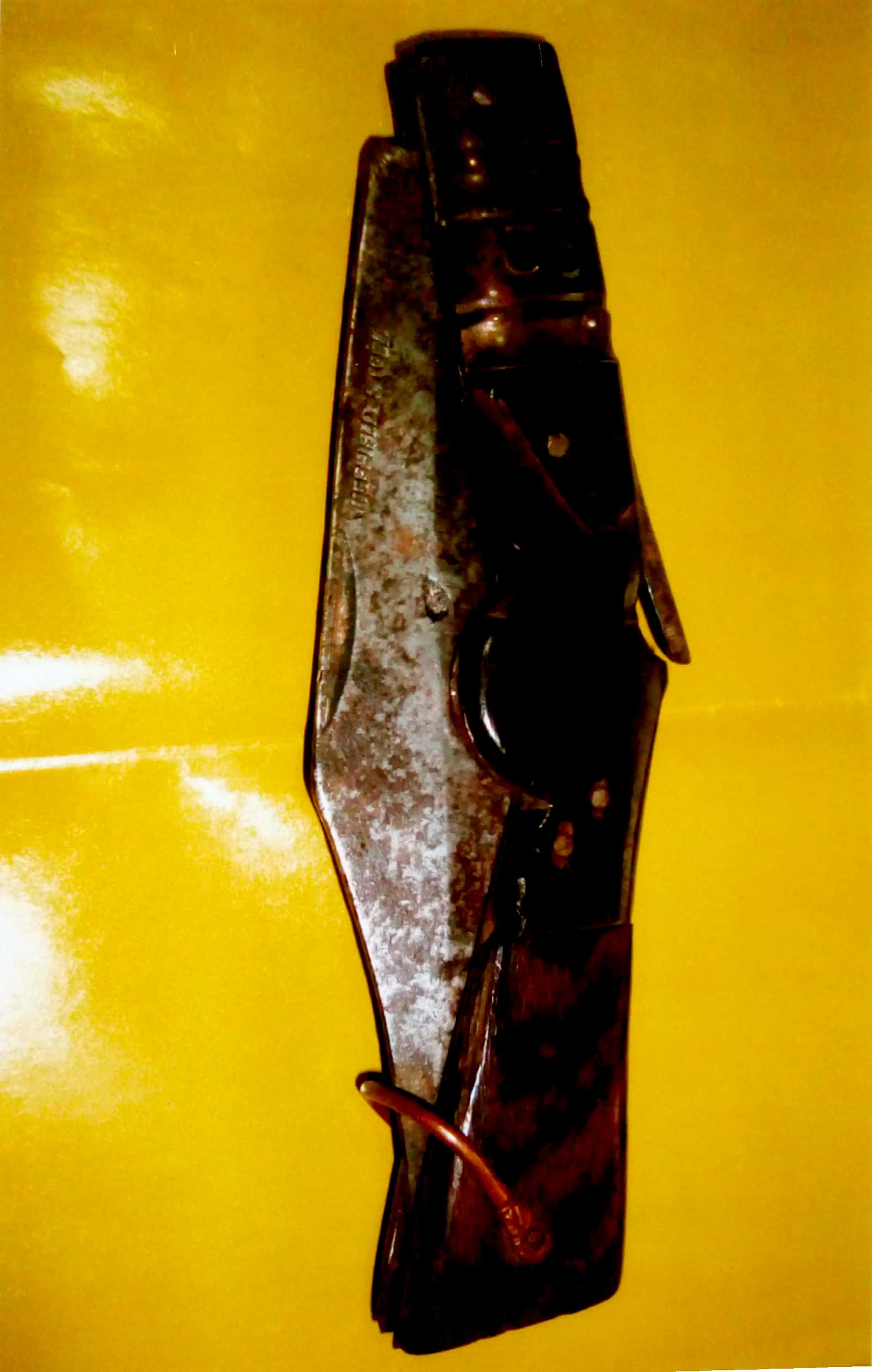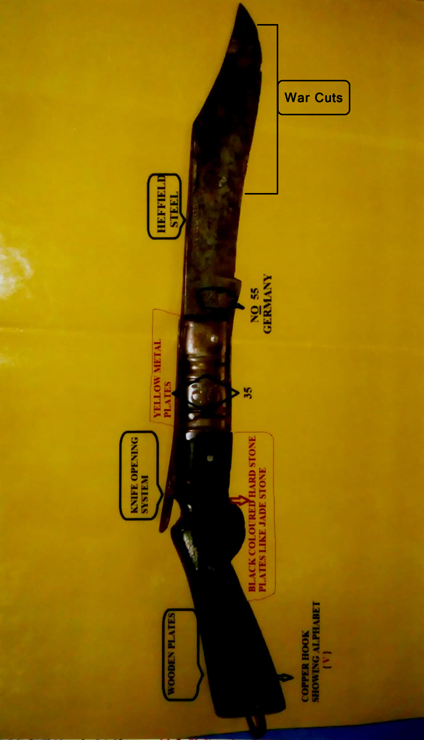 I would like to bring to your kind notice that i am a collector of art. I have got an English made clasp knife with decorated hilt. It's hilt is made like a rifle-stock showing valuable stones fixed on both sides. The cut marks on it's blade is showing that perhaps this knife was used in any great fight.
