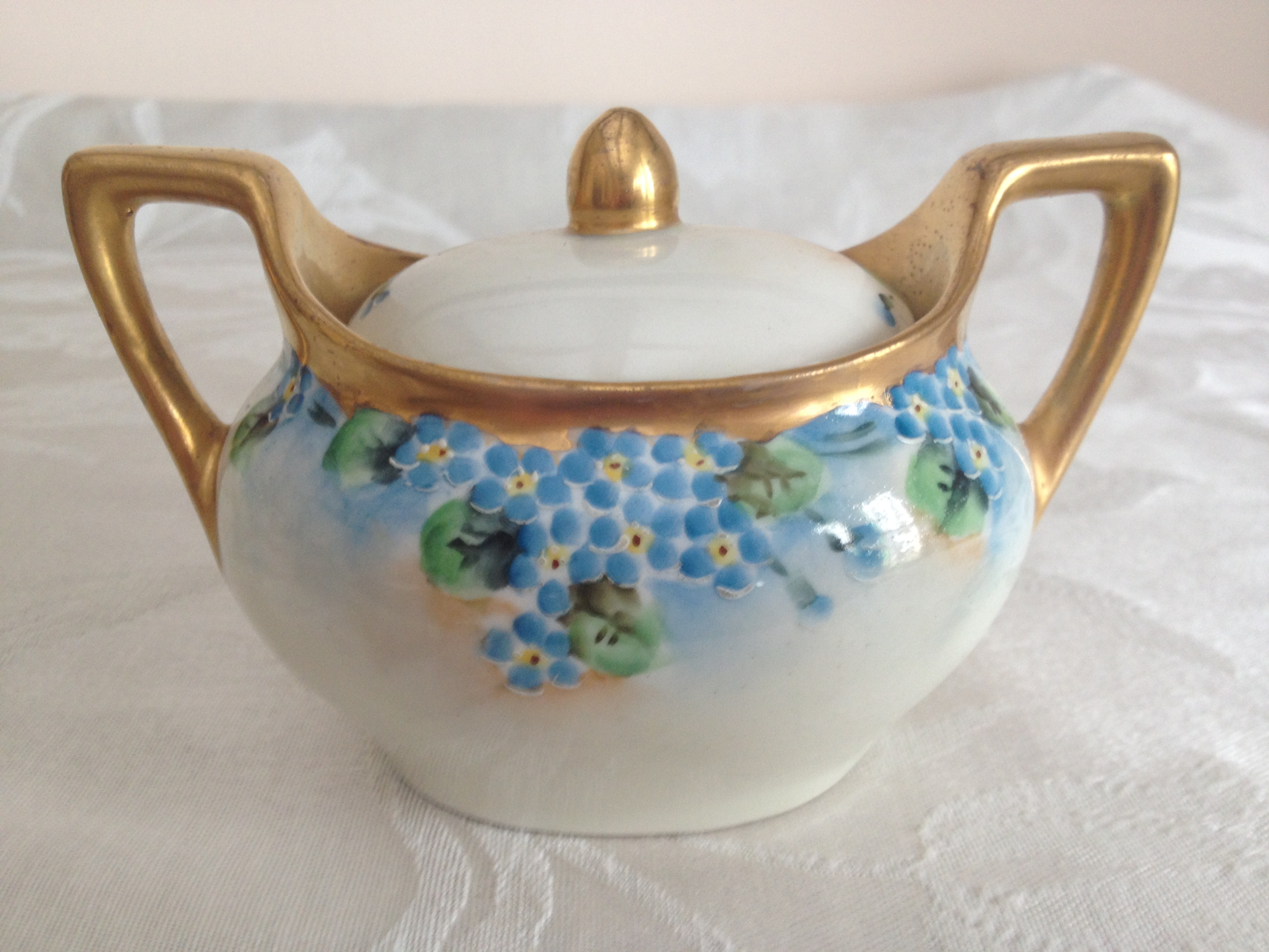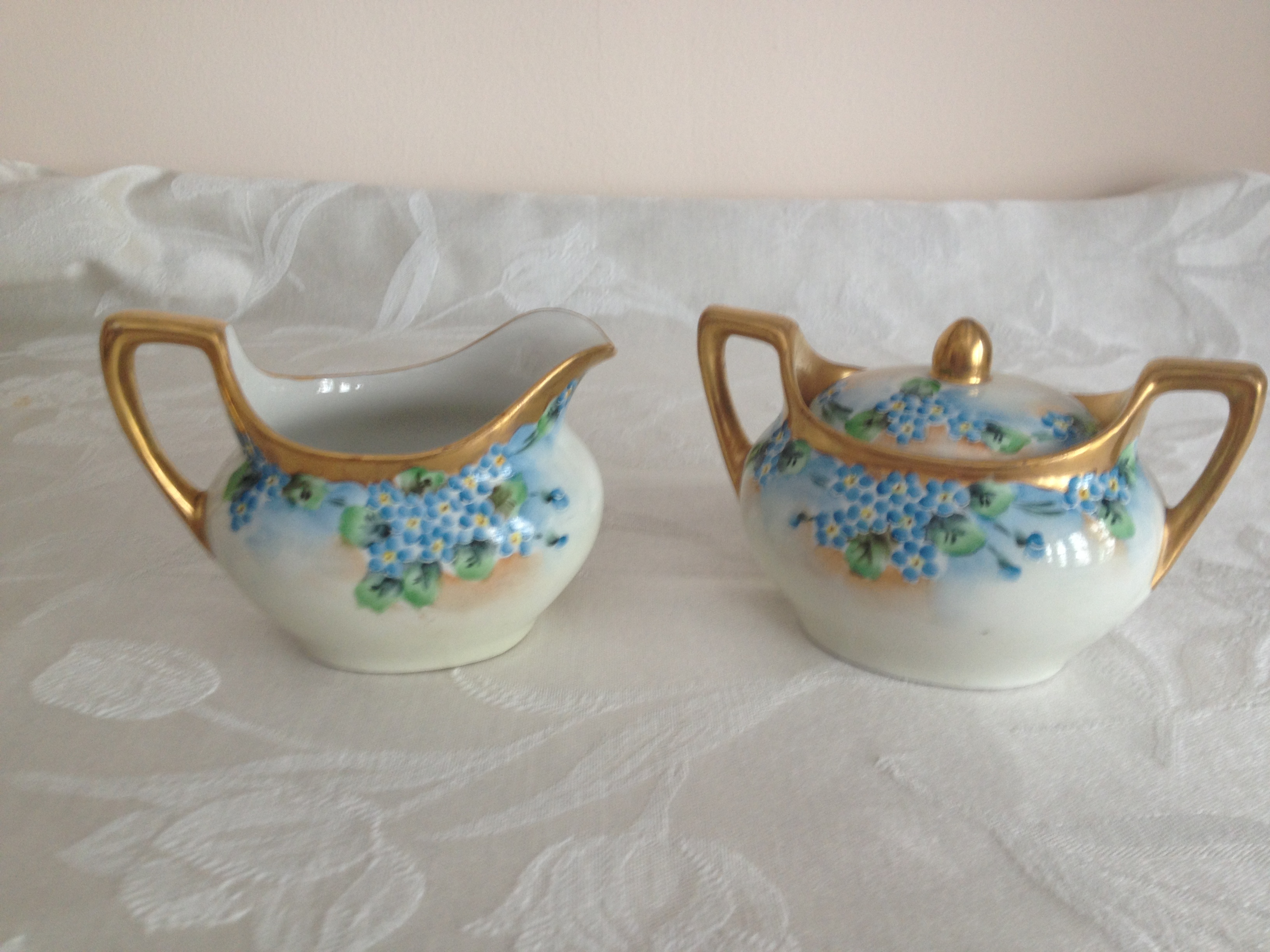 This sugar and creamer set is backstamped "Buffalo China 1918" and matches a dessert set of plates, cups and saucers that are handpainted Nippon from the 1910s. My research revealed that during the 1920s and 30s, the Larkin Co. of Buffalo, New York, offered its mail order customers several popular patterns of Noritake china as a premium with their mail orders. This sugar and creamer set appears to pre-date that offer and is not one of the patterns listed in the catalogs I could find.