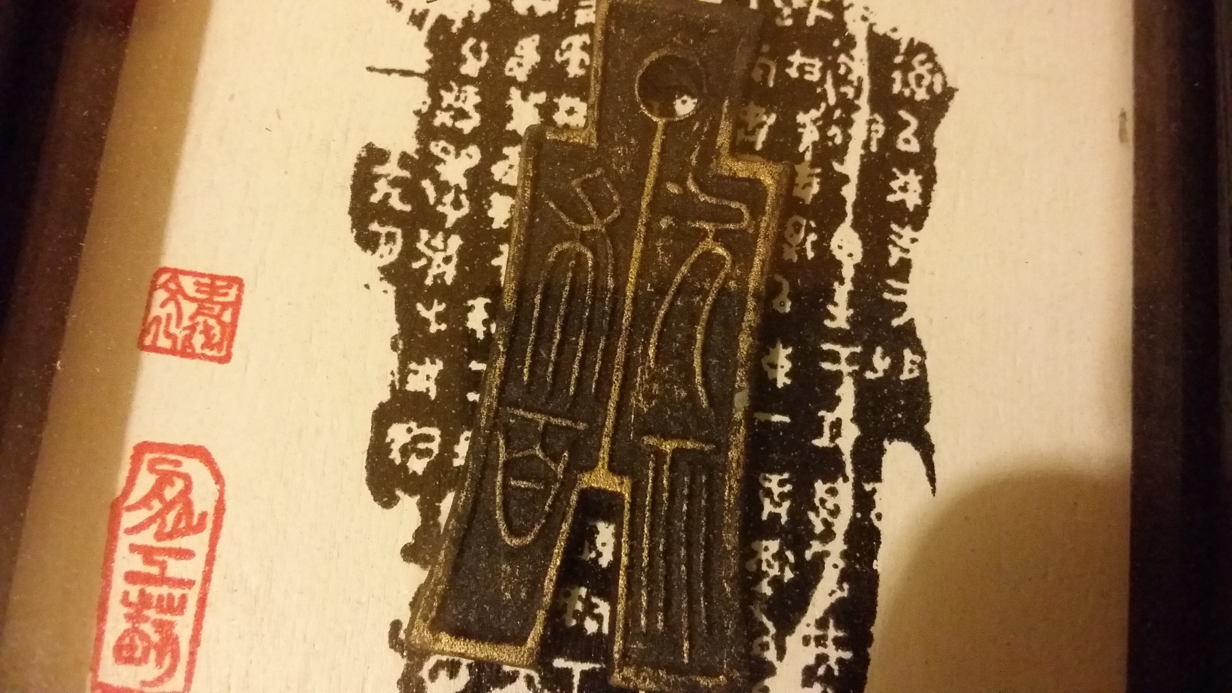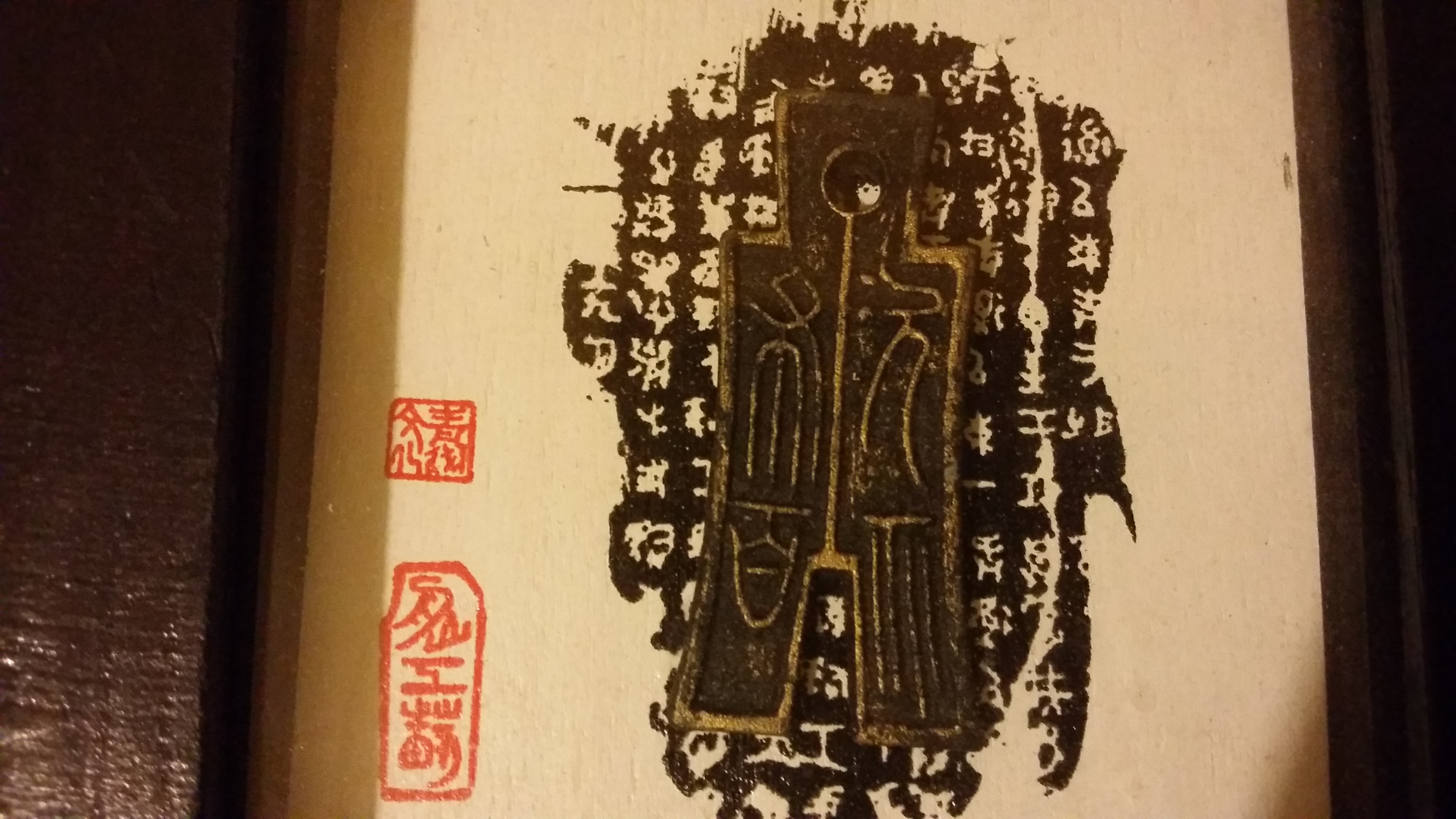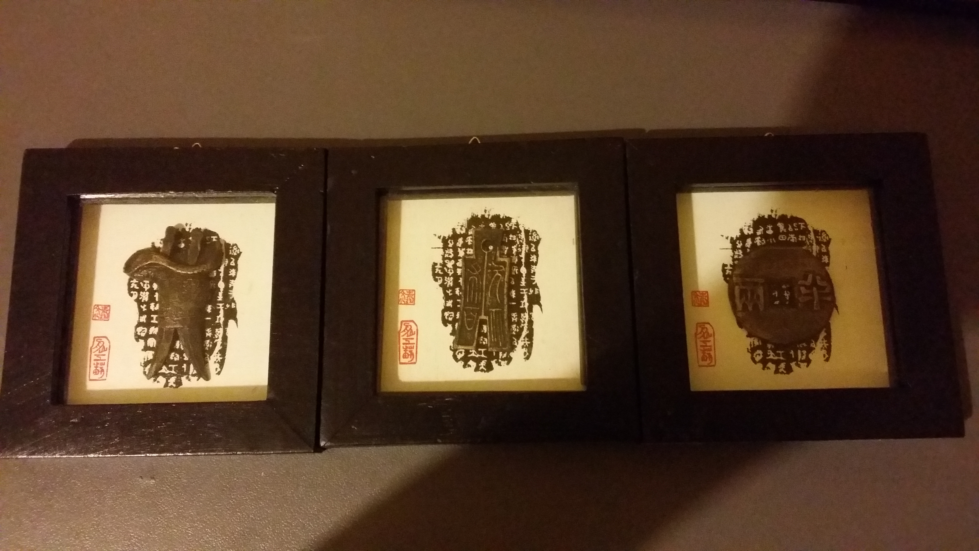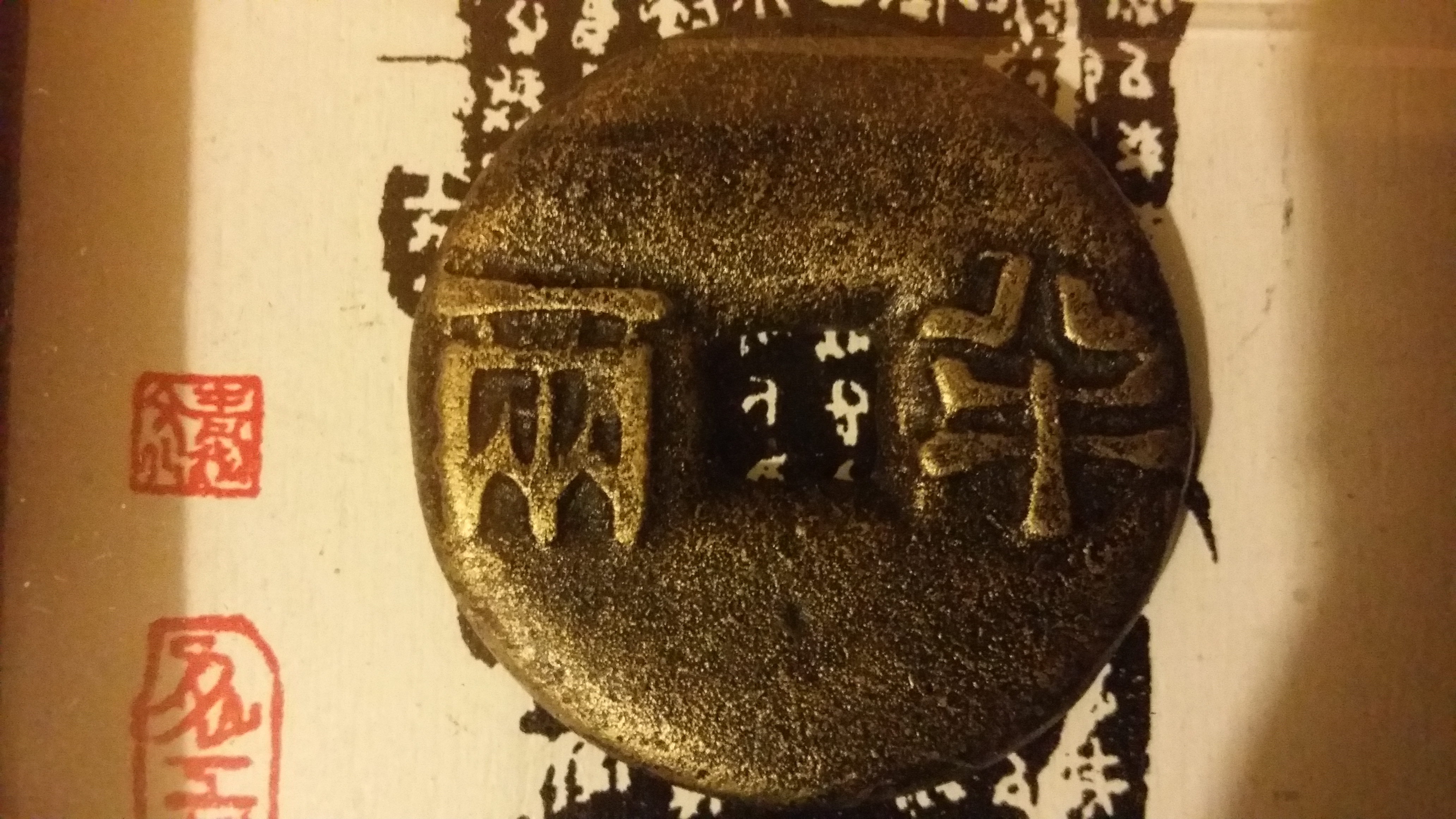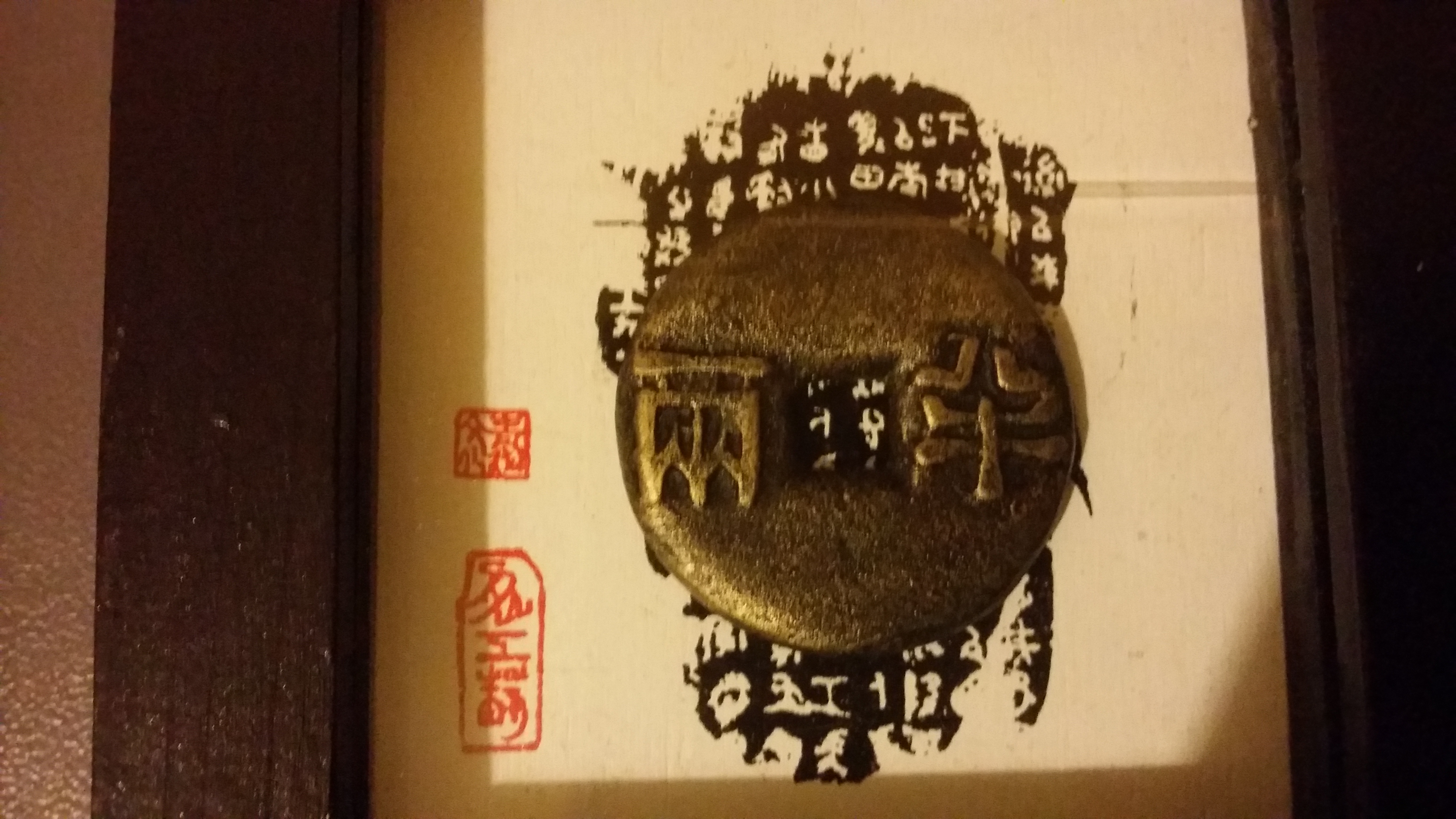 I believe that the spade like object in the middle was from the Wang mang dynasty made in 14AD this was refered it as the Bu San or by San bai. This coin from the the Han period Known as the ban liang coin. As for the other thing I had no idea what they are. Nor do I understand what the red writing in the background means.