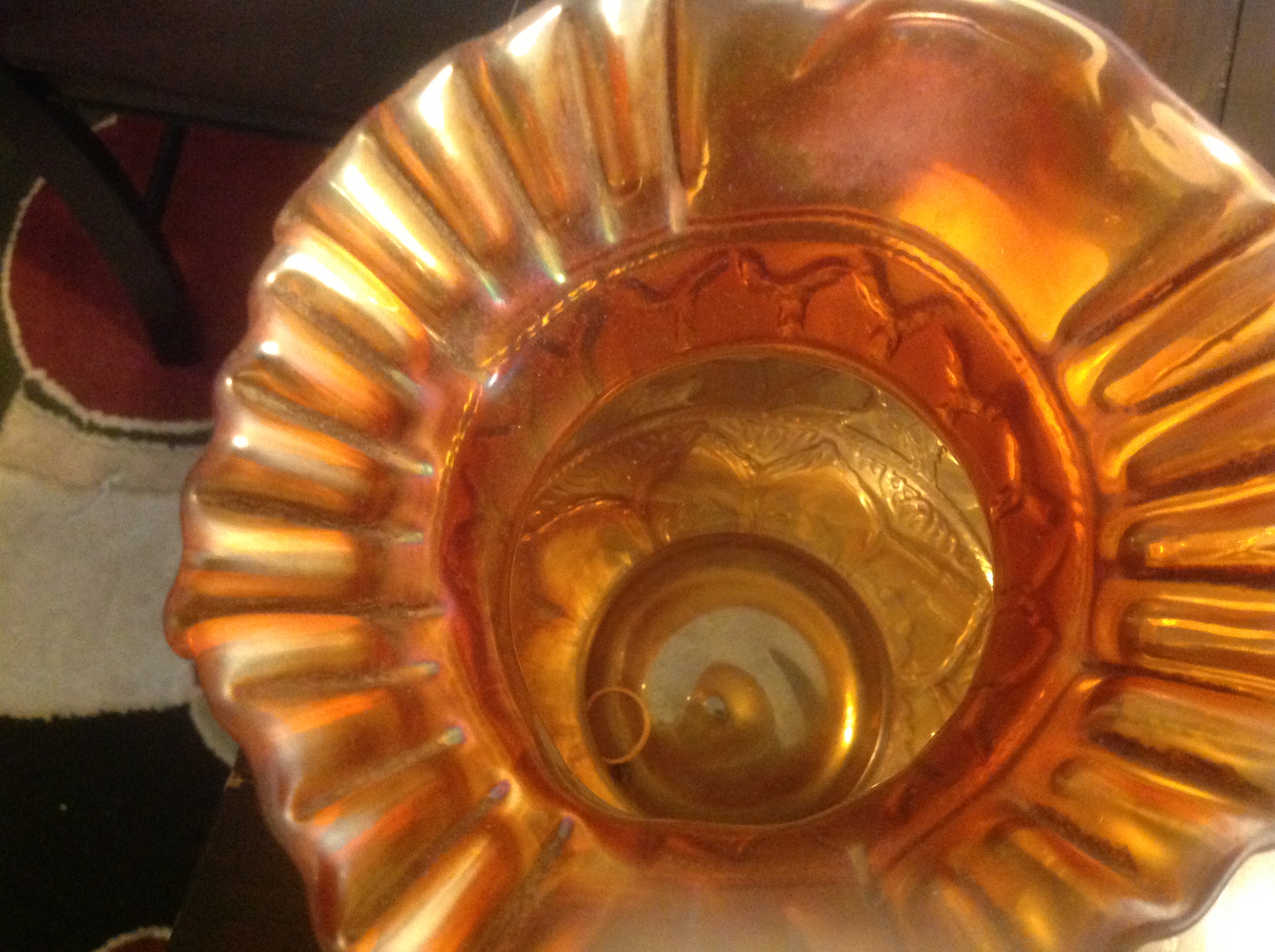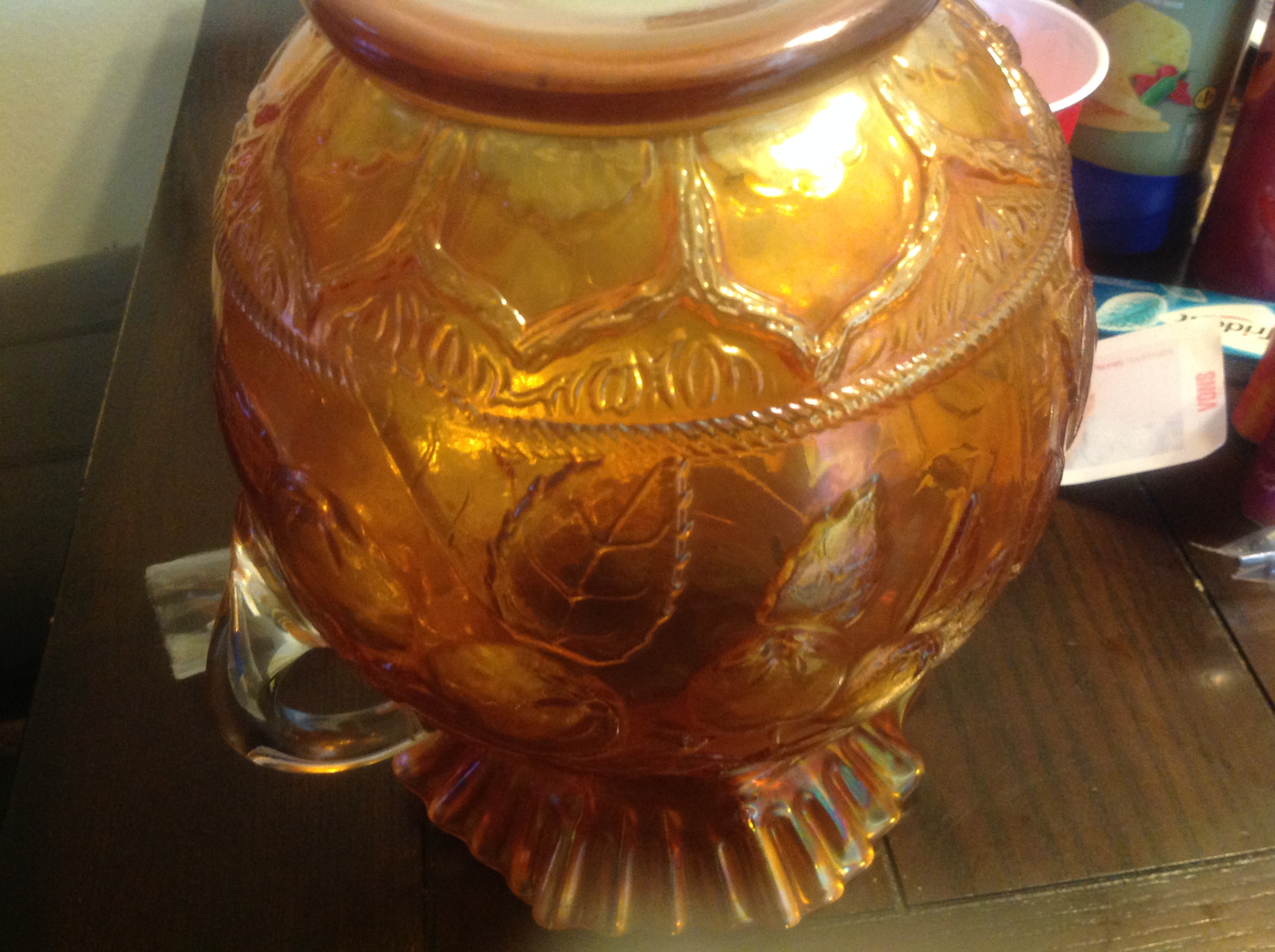 It looks a bit like Carnival glass-Marigold-...You could search under Fenton, Dugan, Indiana glass companies...also ...I'm not an expert, but I don't believe those are tomato leaves :) maybe plum...or apple...