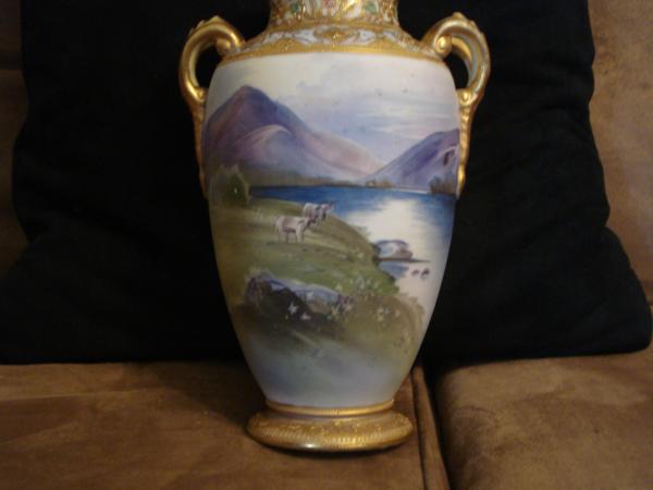 Double gold handles, gold work with "jewels" around top, gold base with "bumps", scene of Mt. Fuji with stream, purples, blues, green grass, two light colored cows (?). See pictures.